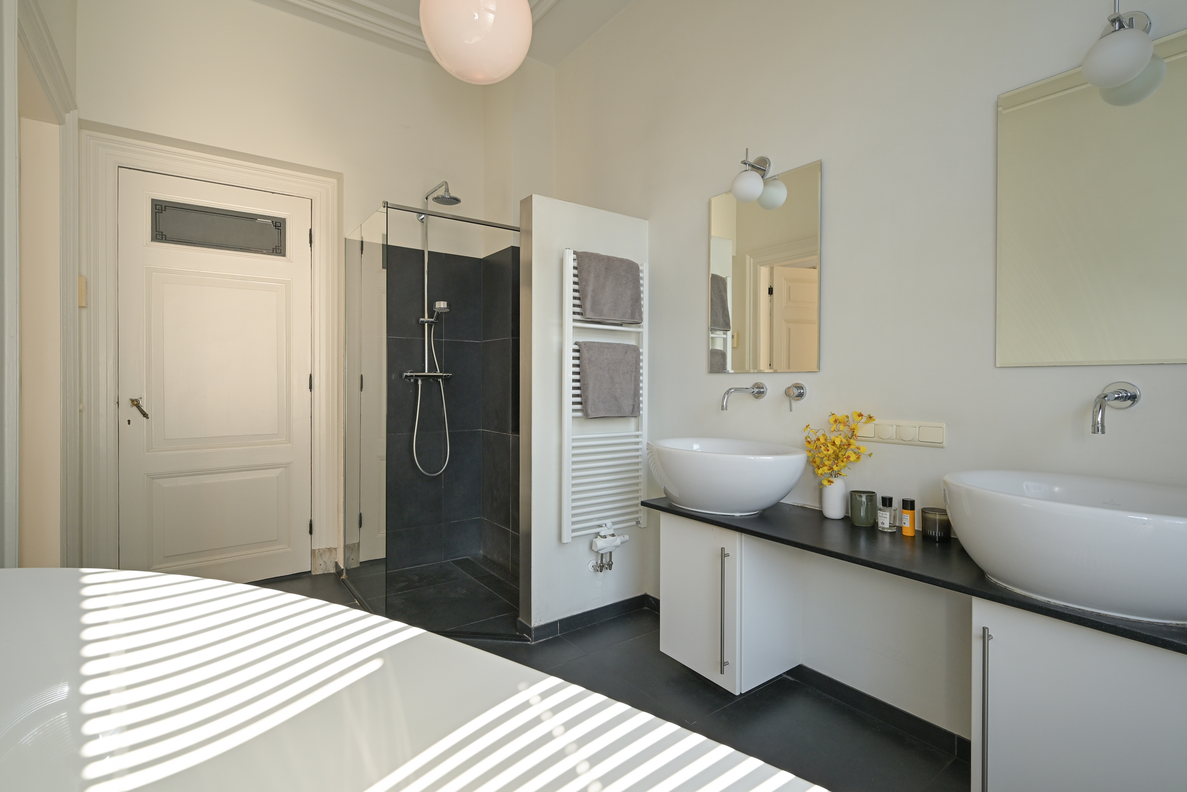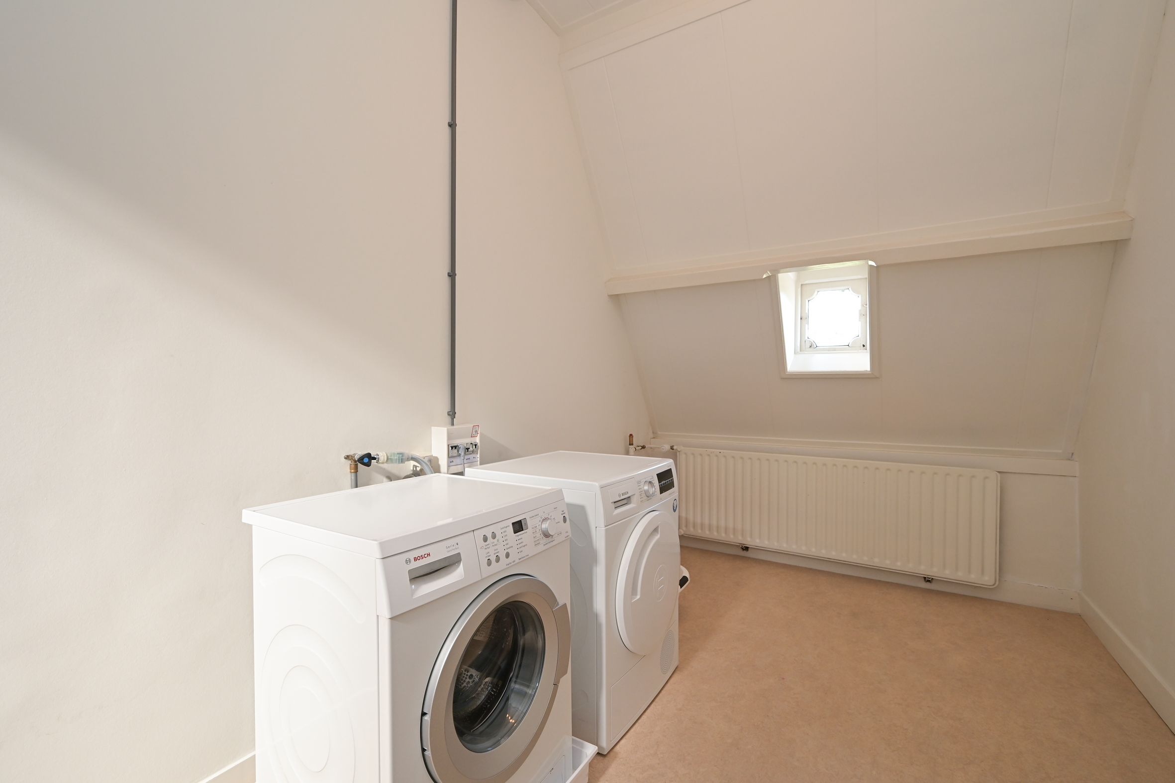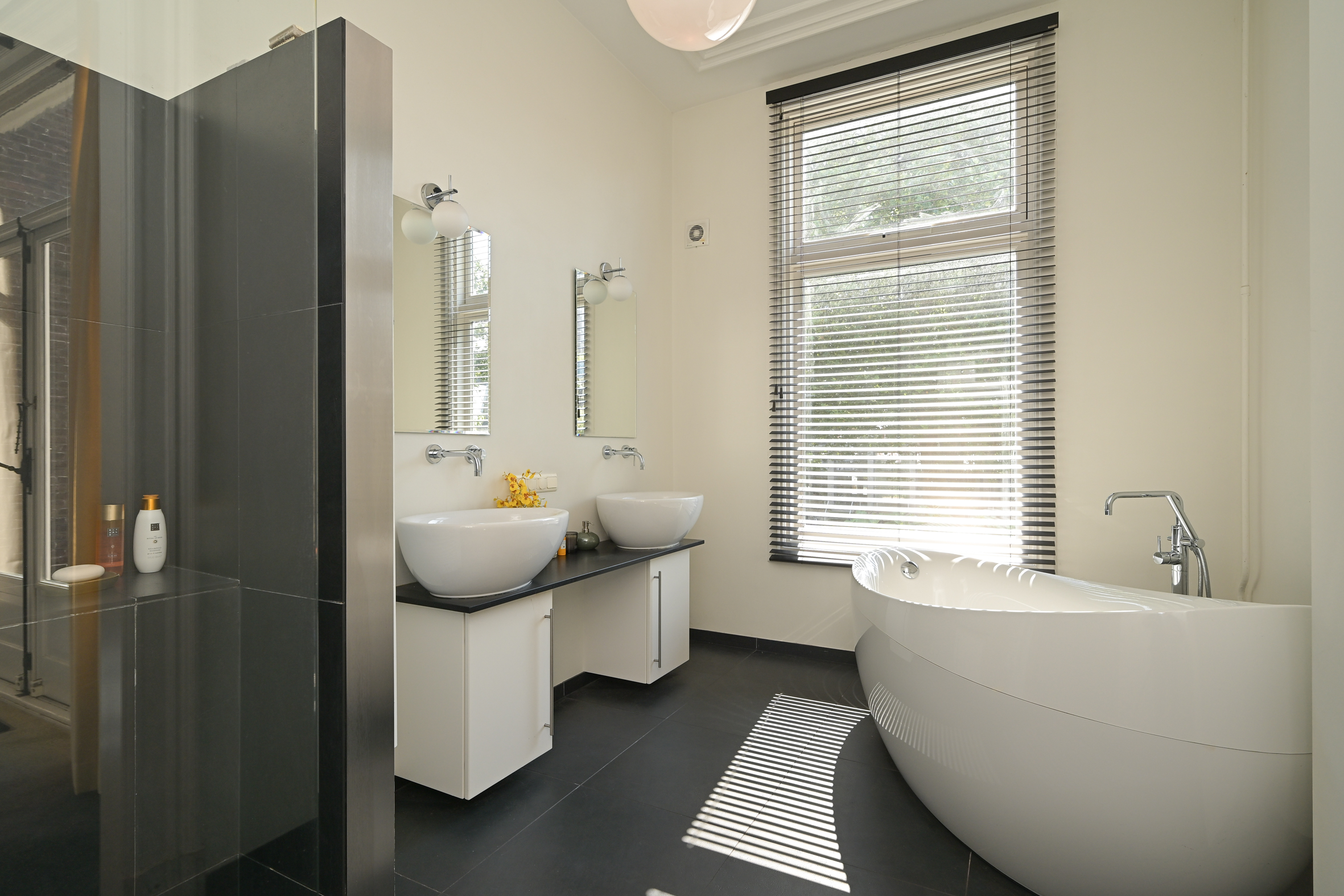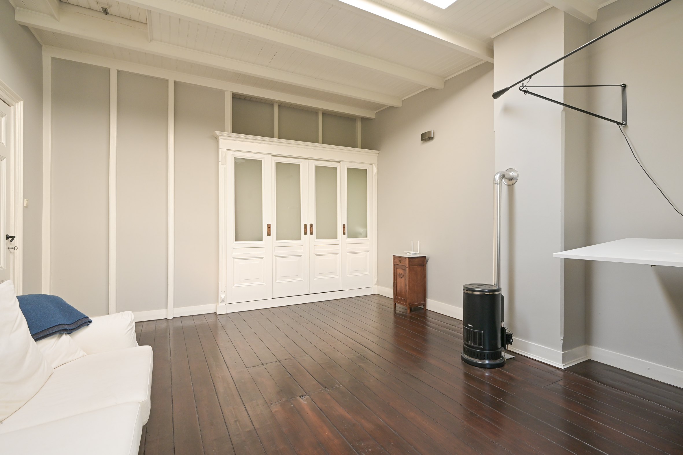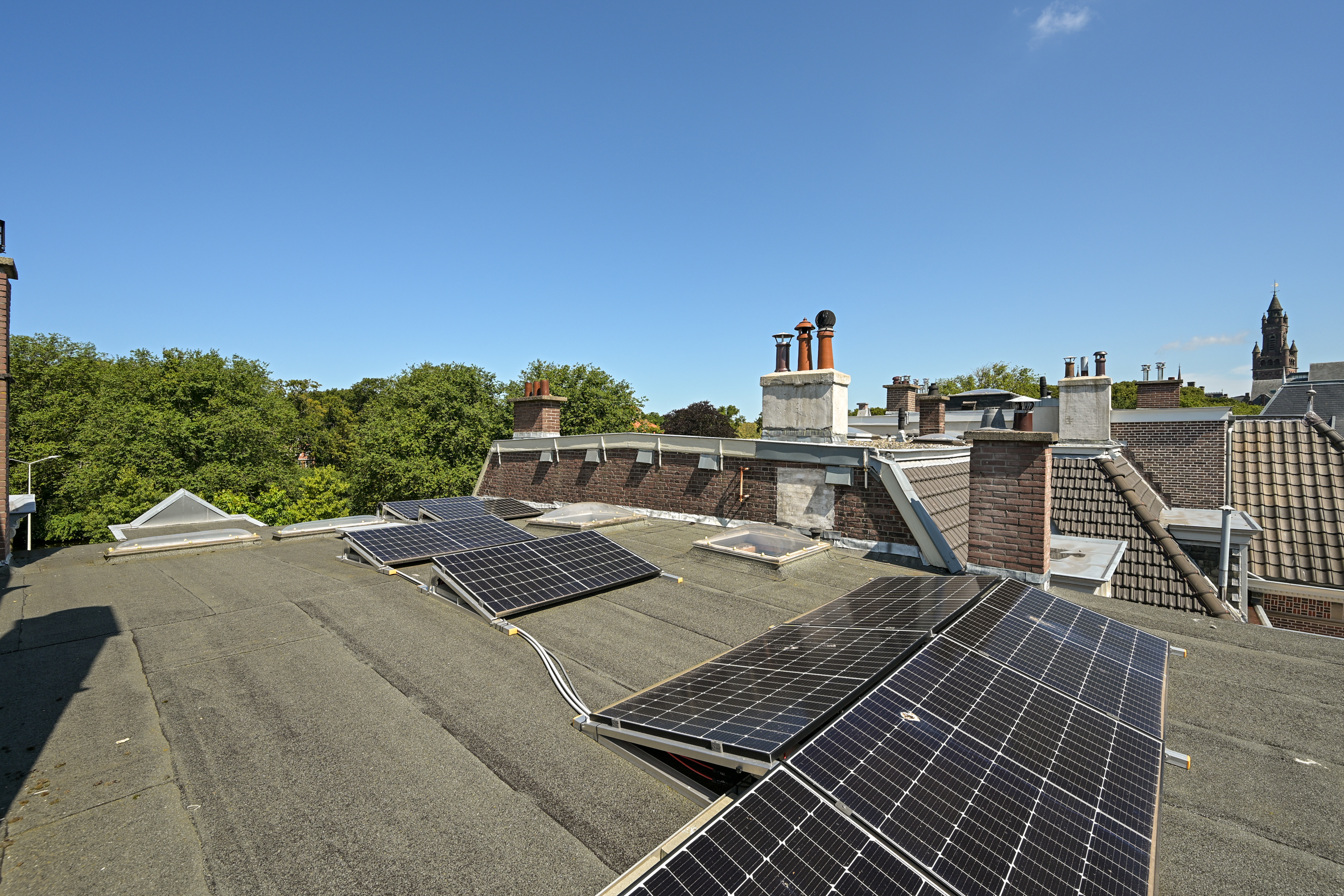 The ground floor features generous reception rooms with parquet and marble flooring, along with a modern kitchen equipped with integrated appliances and a statement original crockery cupboard. Both kitchen and sun room flow into the garden, while a cellar sits below for practical storage. Upstairs, the principal rooms continue the theme of tall ceilings, original mantels, and fitted cabinetry, connected by a graceful staircase. The bathroom is equipped with a design bathtub, double vanity, walk-in shower, and underfloor heating. The upper level, illuminated by a skylight, includes wooden flooring throughout, multiple bedrooms, laundry space, and options for an additional bathroom. Solar panels, double glazing, insulation, and energy class C underline a commitment to modern living. Period character meets energy efficiency in this carefully maintained Duinoord townhouse.