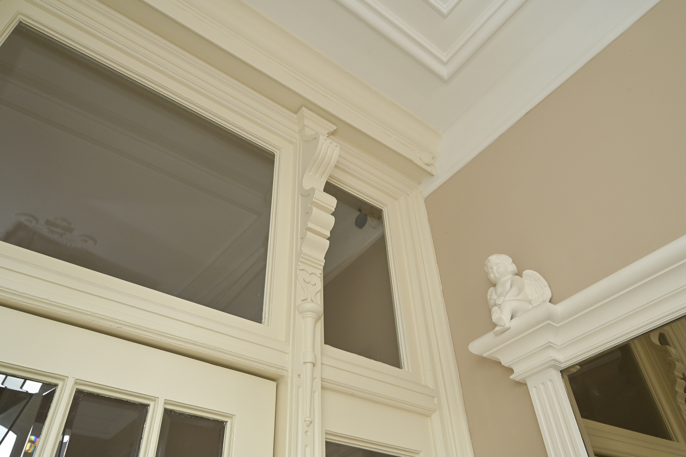 Layout: entrance, vestibule with built-in wardrobes and draft separation, hallway with storage space under the stairs, modern toilet with washbasin, and access to the cellar. Delightful, spacious living/dining room with suite separation featuring high sliding doors and built-in cupboards. Both rooms feature high ornate ceilings, beautiful oak parquet floors, and marble fireplaces with (gas) fires. The back room is connected to the full-width eat-in kitchen by a transparent partition, featuring built-in appliances, an island, and a gas fireplace. Double French doors lead to the delightfully private rear garden with a back entrance.