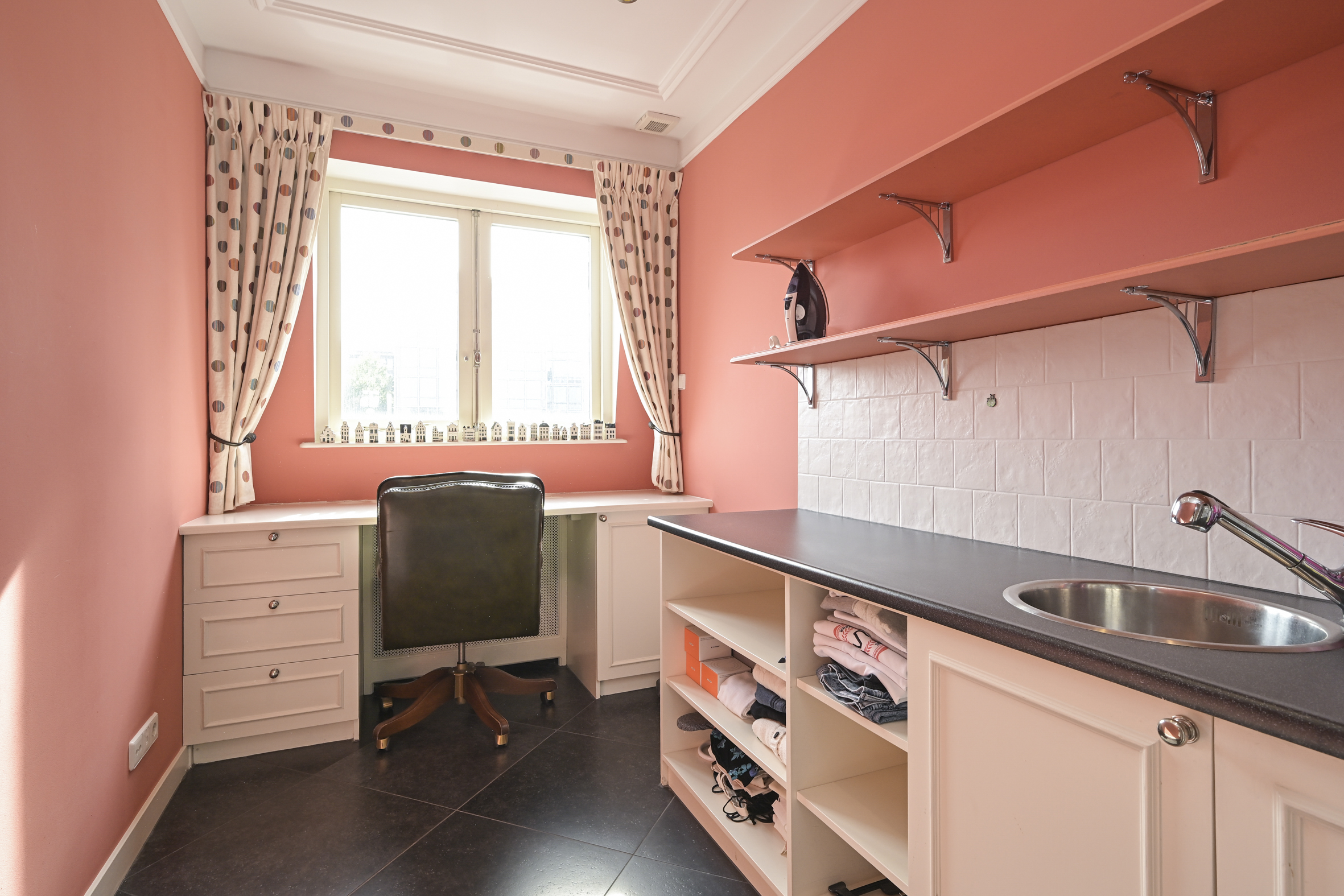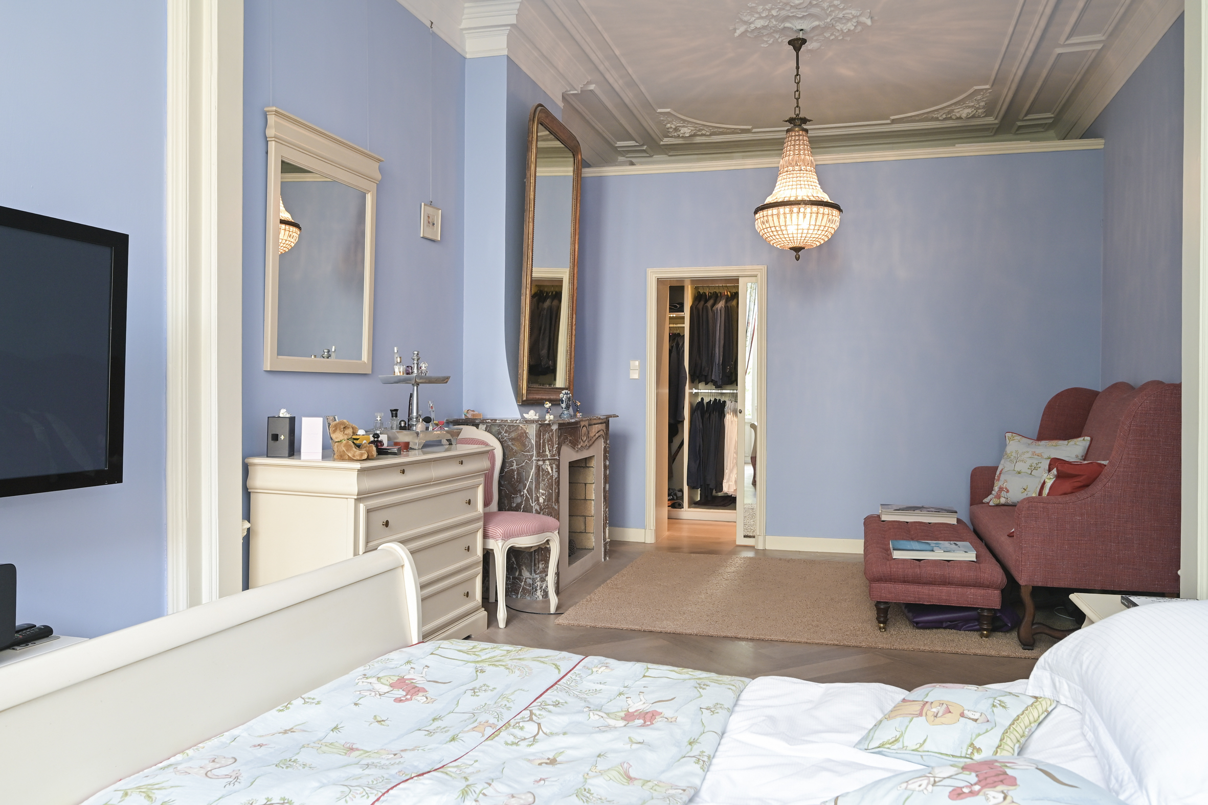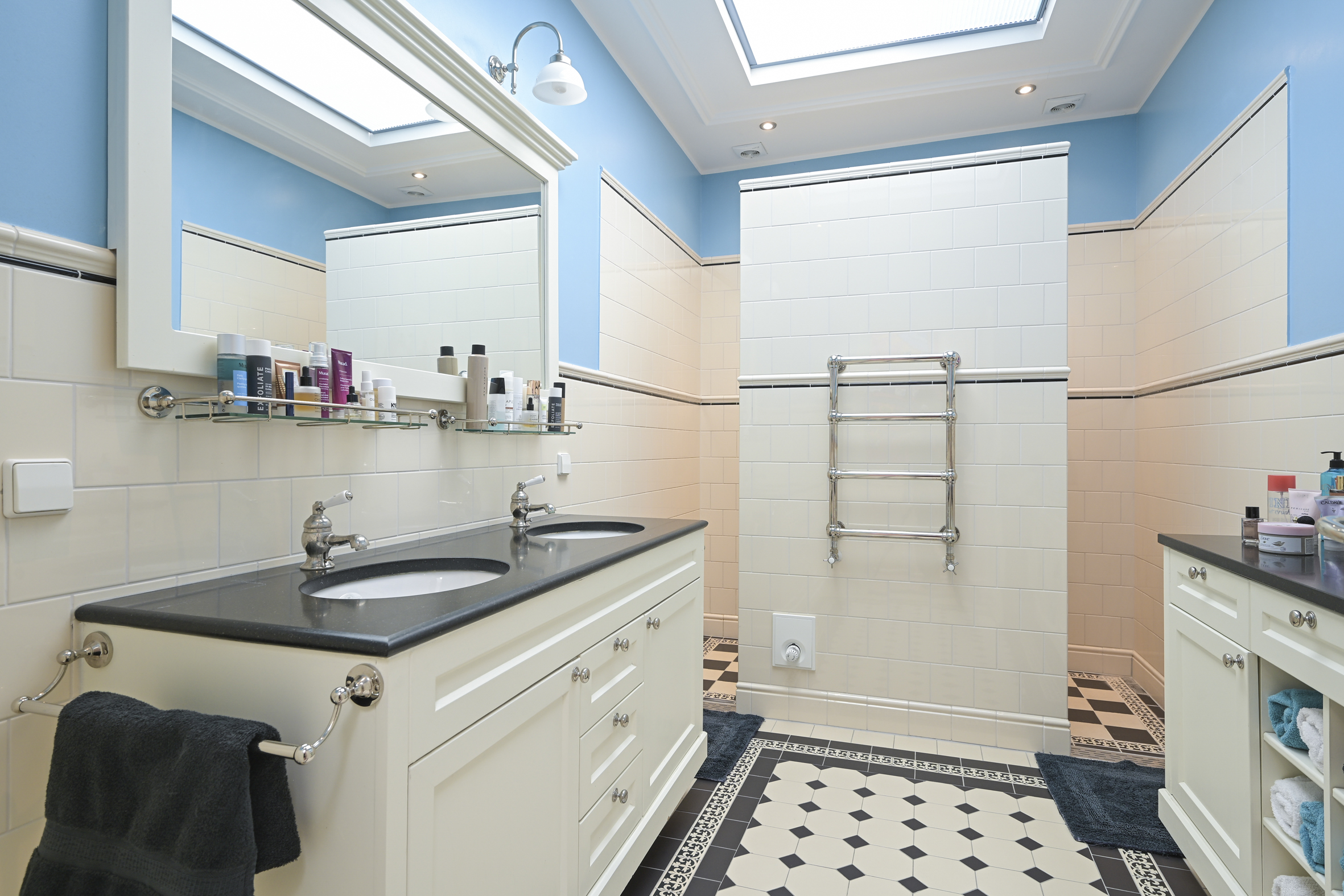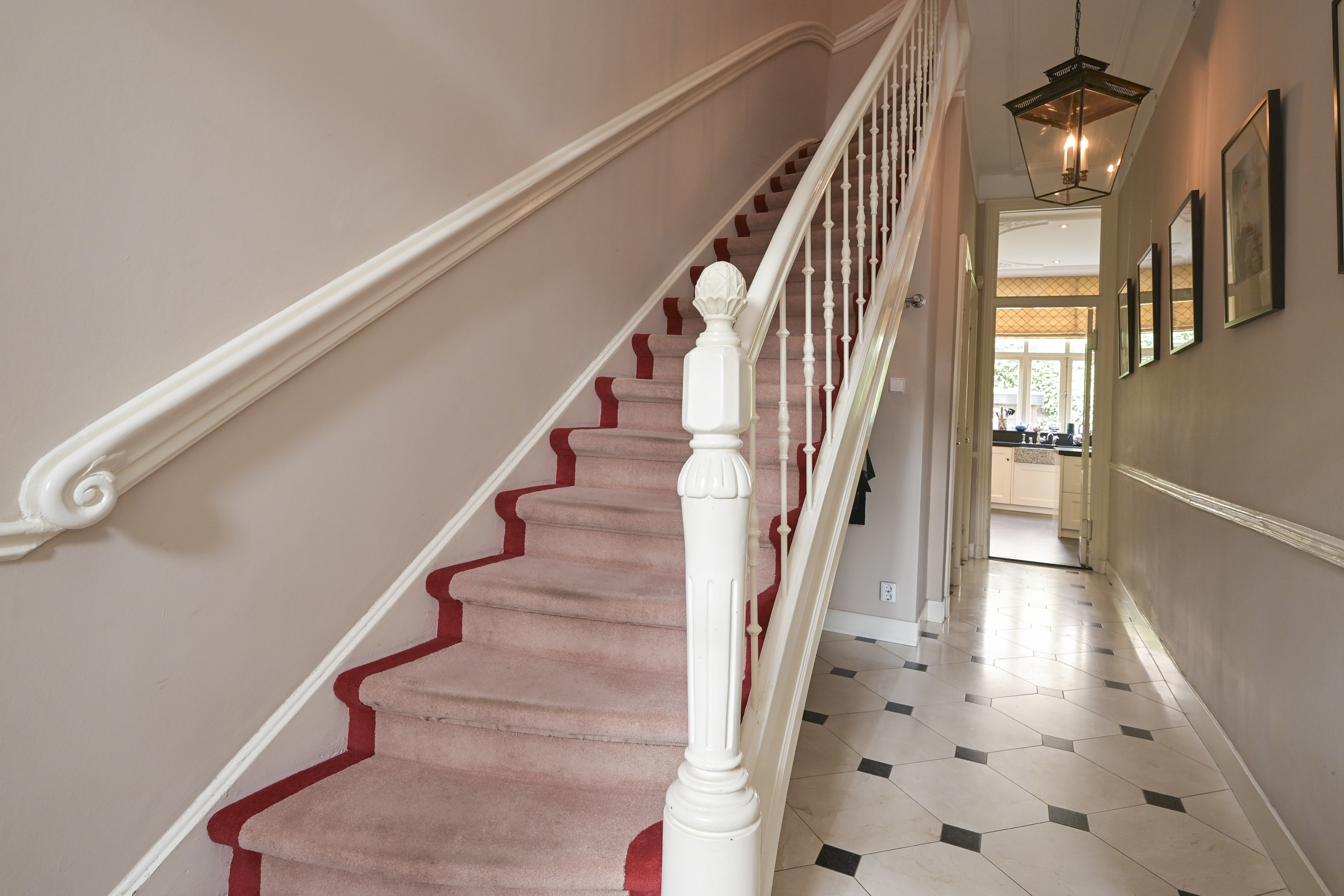 The beautiful staircase leads to the first floor, landing, modern toilet with washbasin, spacious rear bedroom with beautiful oak flooring, fireplace with gas fire, high ceilings, walk-in wardrobe, and an adjoining full bathroom with bathtub, separate walk-in shower, and double sinks with vanity units. At the front is the full-width classic study with high ceilings, fireplace with gas fire, oak floors, built-in bookcases, and an unobstructed view.