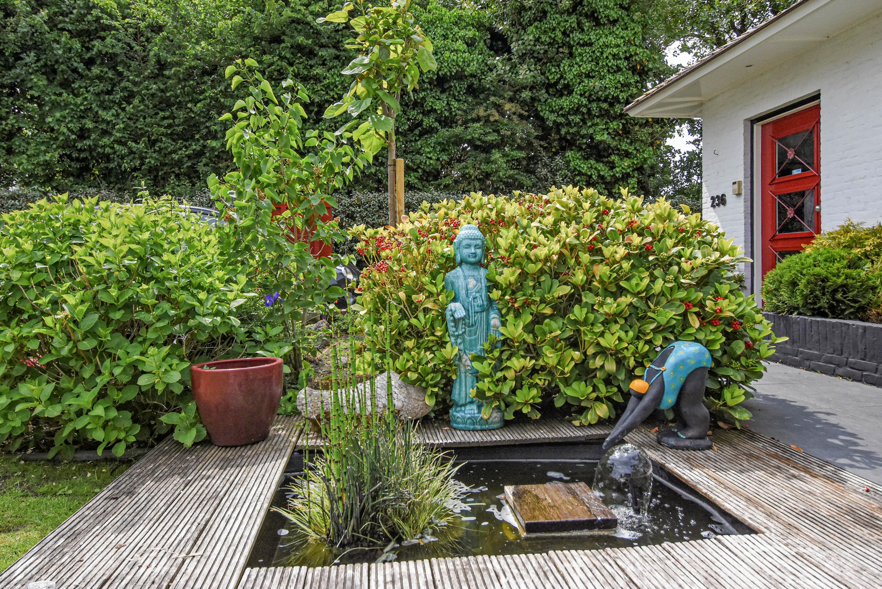 - Beautifully landscaped garden with multiple terraces, ornamental pond, and swimming pool
