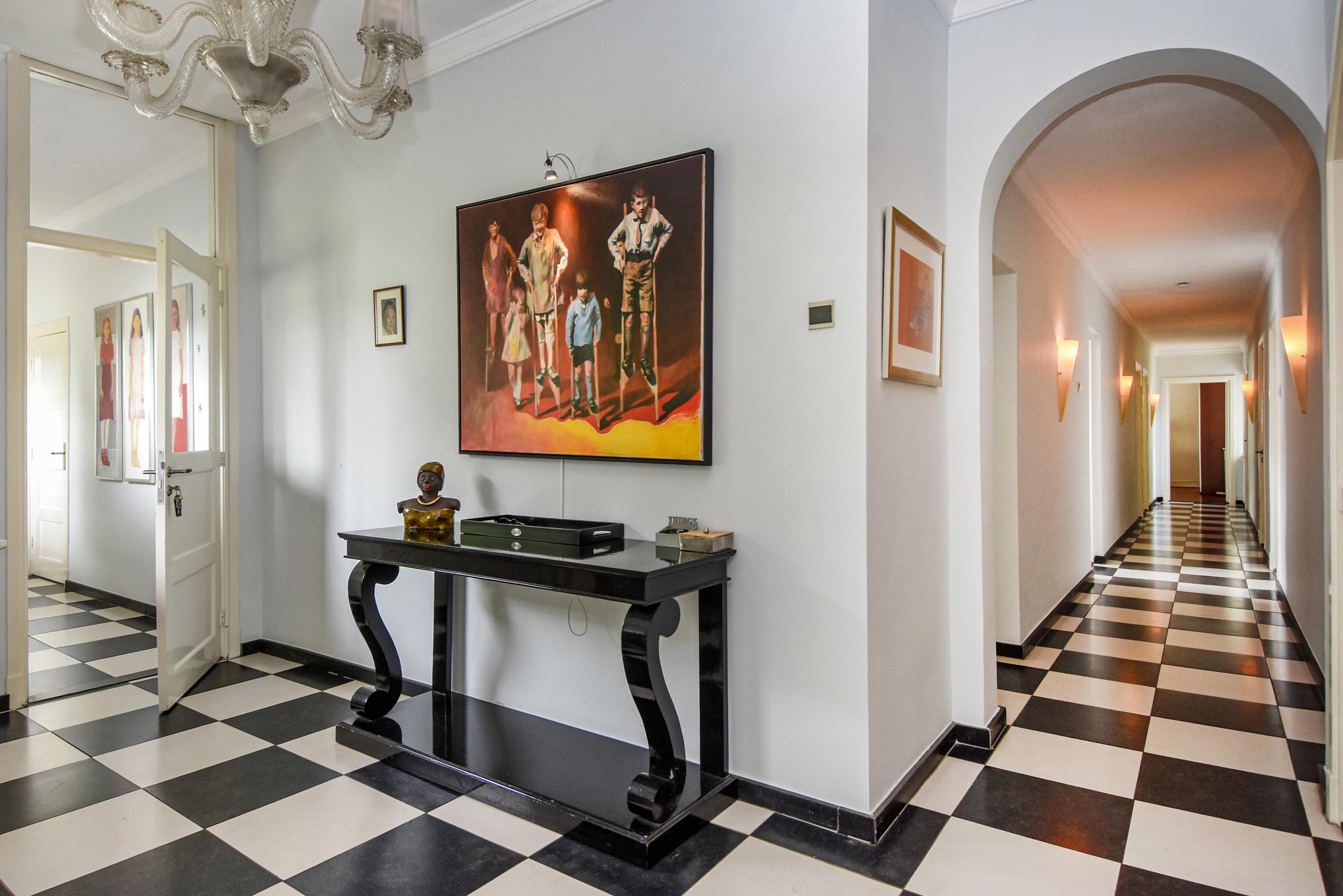Past the front door is a charming tiled vestibule that leads to a marble-clad central hall with a guest lavatory.