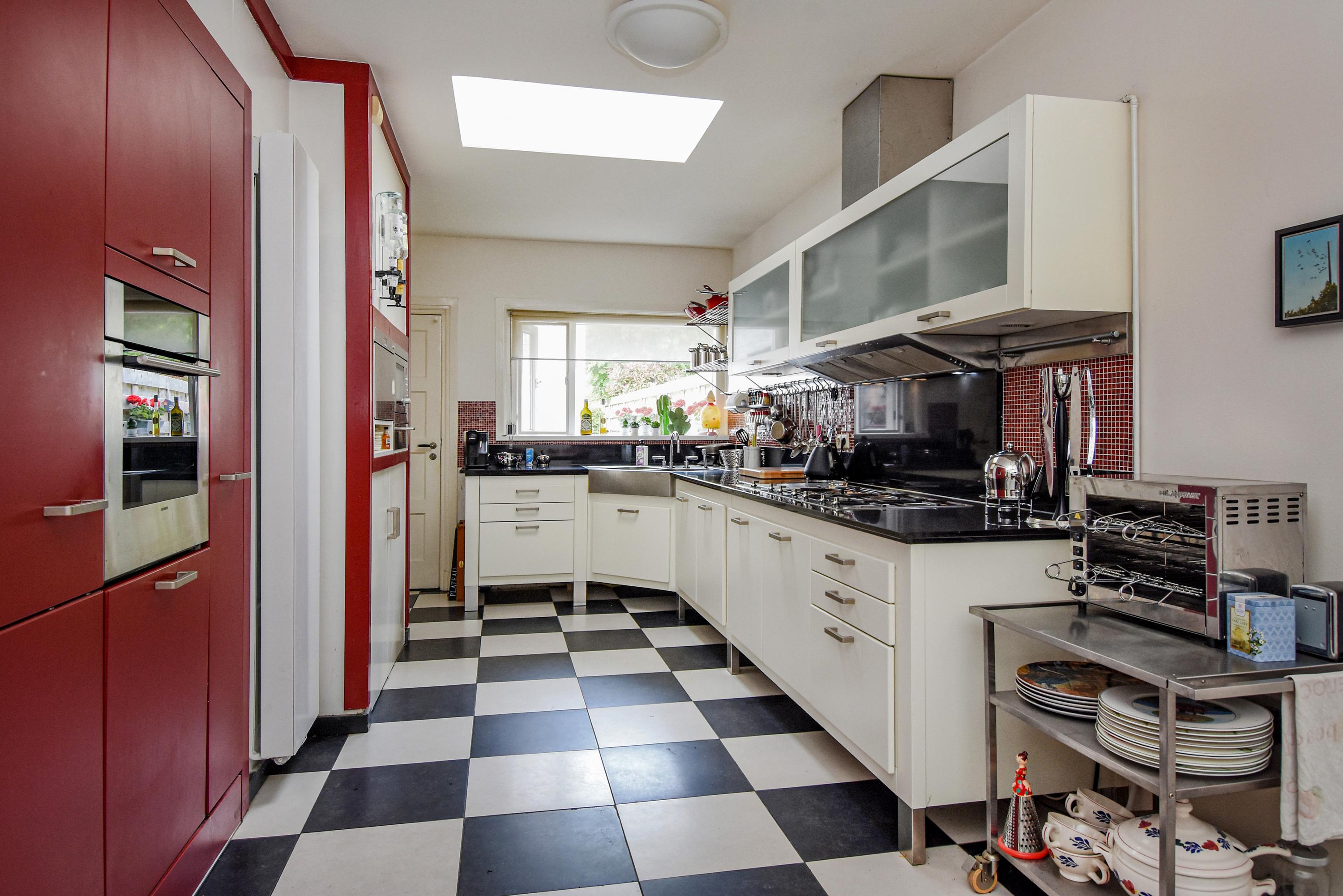 The spacious kitchen, illuminated by a skylight, has a black and white tiled floor and ample storage space including a separate cupboard housing the central heating unit. Built-in appliances include an oven, fridge, and freezer; above the five-burner gas stovetop and grill plate set in the stylish stone countertop is a wide extractor fan.