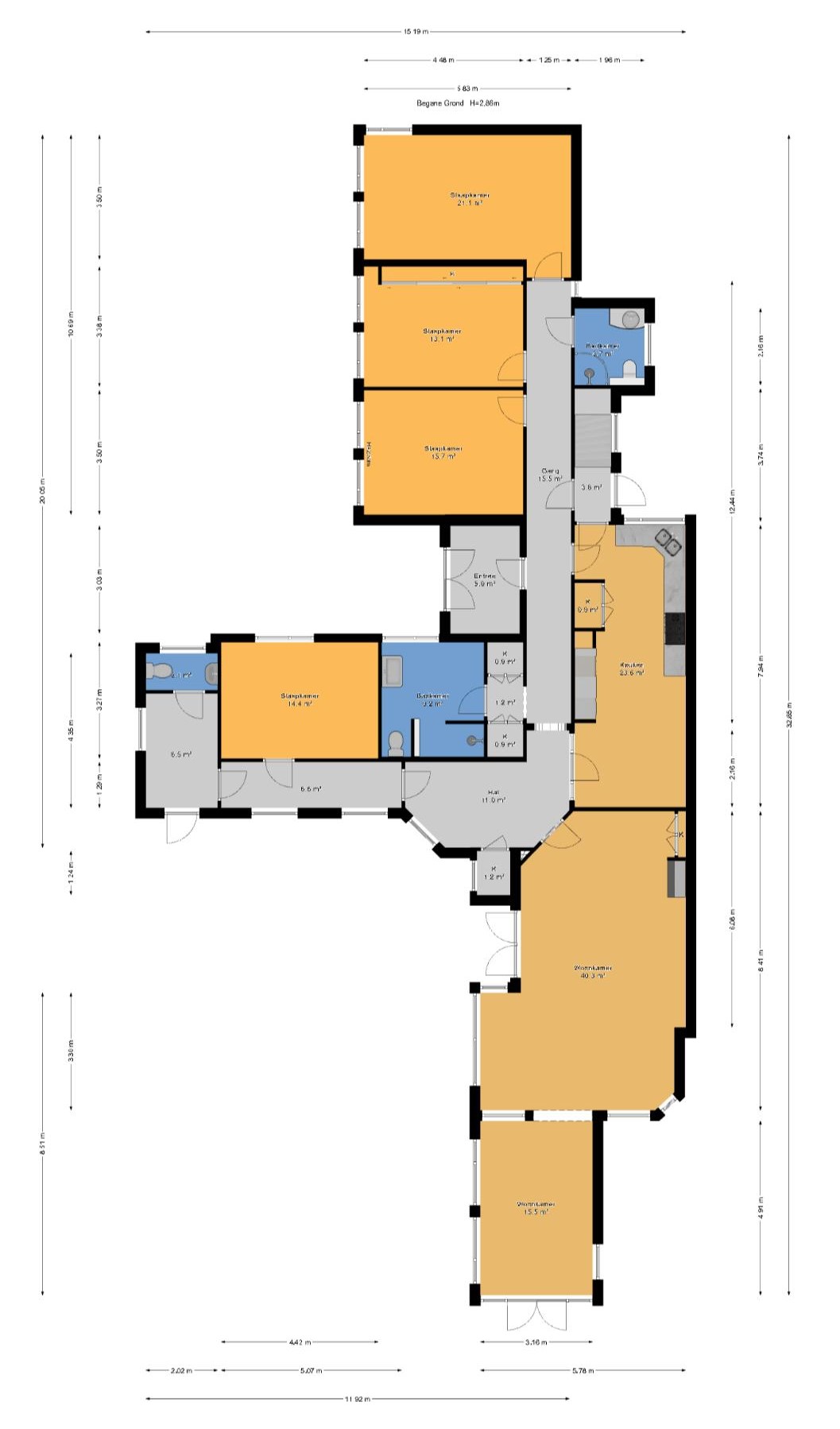 A hallway leads to the three bedrooms with windows to the backgarden. Vestibule with double doors to the back garden. Through a small passage with fitted cupboards and a separate electric boiler is the first bathroom, with a walk-in shower, wide washbasin, and toilet. A second bathroom is similarly outfitted with a shower, washbasin, and toilet.
