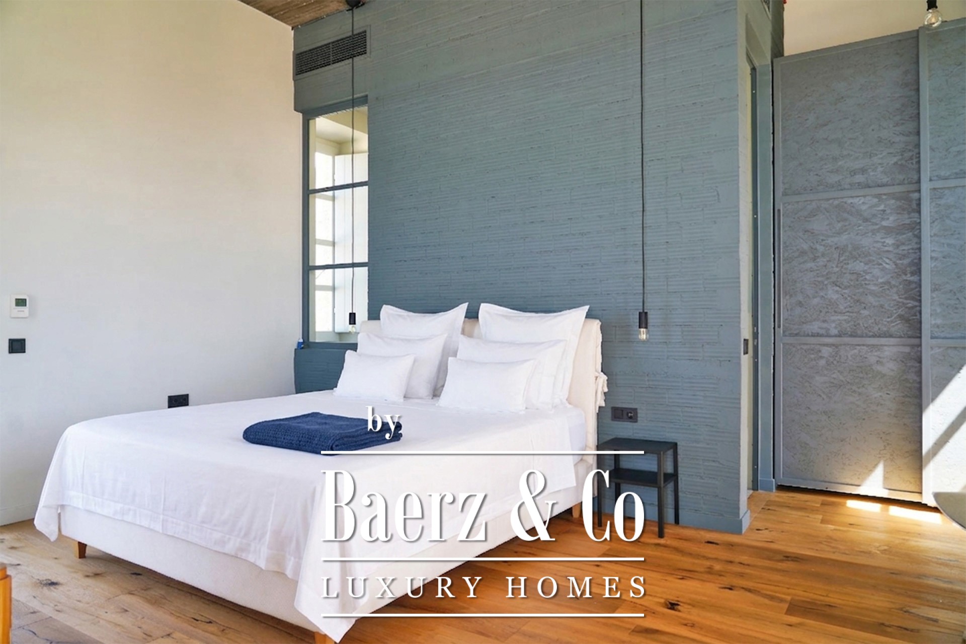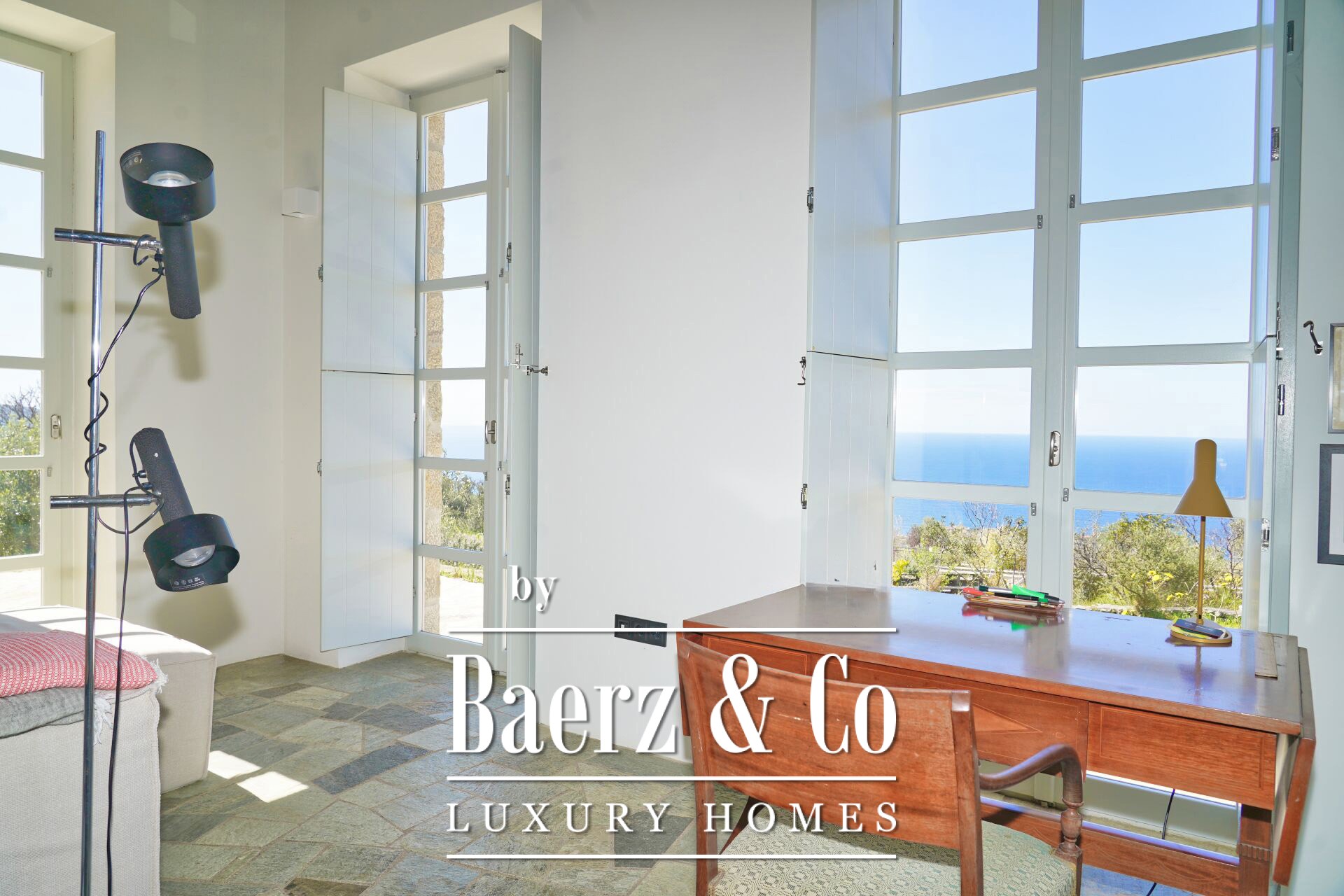 With four bedrooms and five bathrooms in total, the layout is designed for flexible use: spaces for guests, independent living quarters, and a generous main residence. The interiors are bright and sunlit, finished with stone flooring and wooden window frames, and comfort is ensured through underfloor heating, heat pump, per-level climate control, and full air conditioning. The villa is rated energy class B+ and features double glazing for insulation.