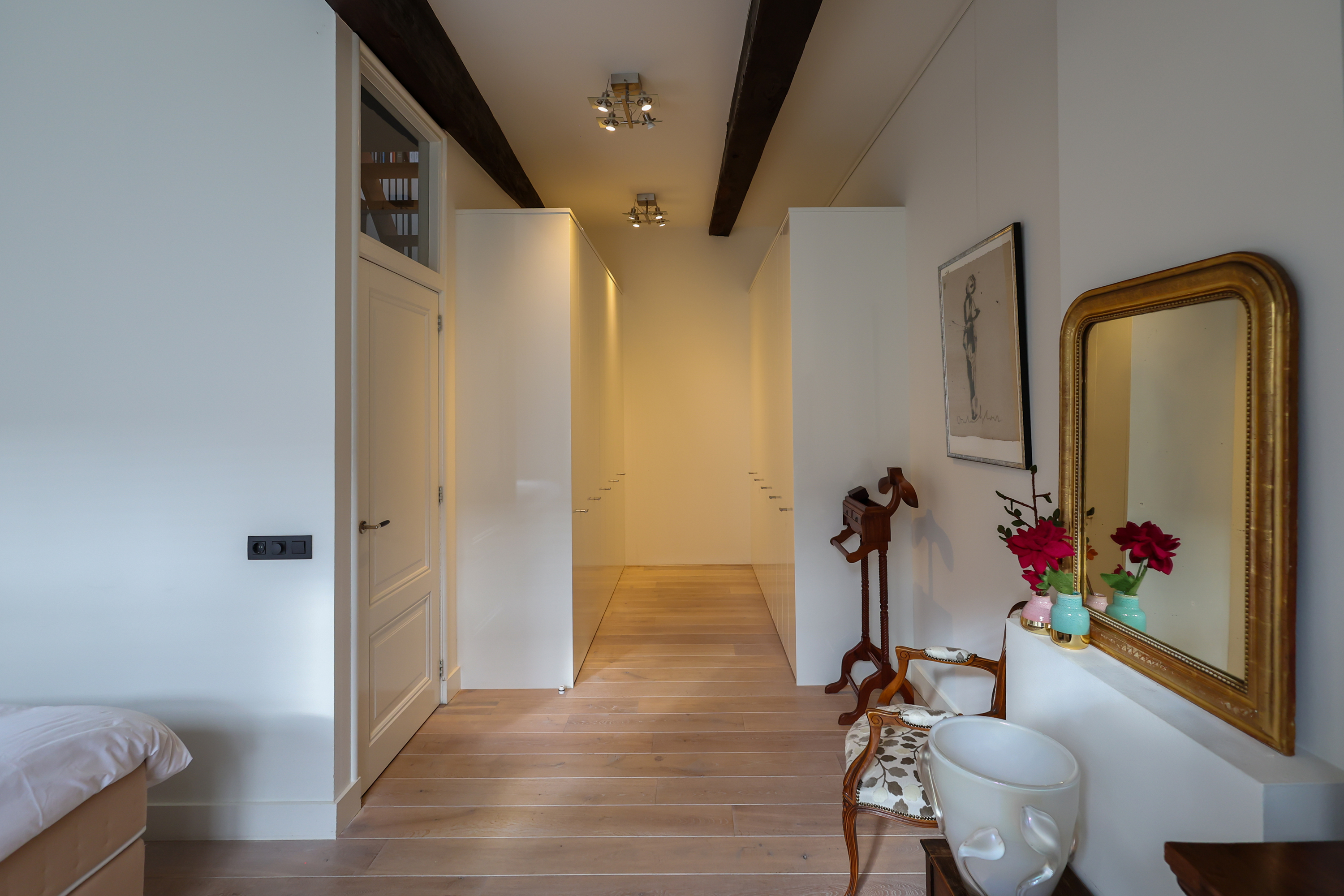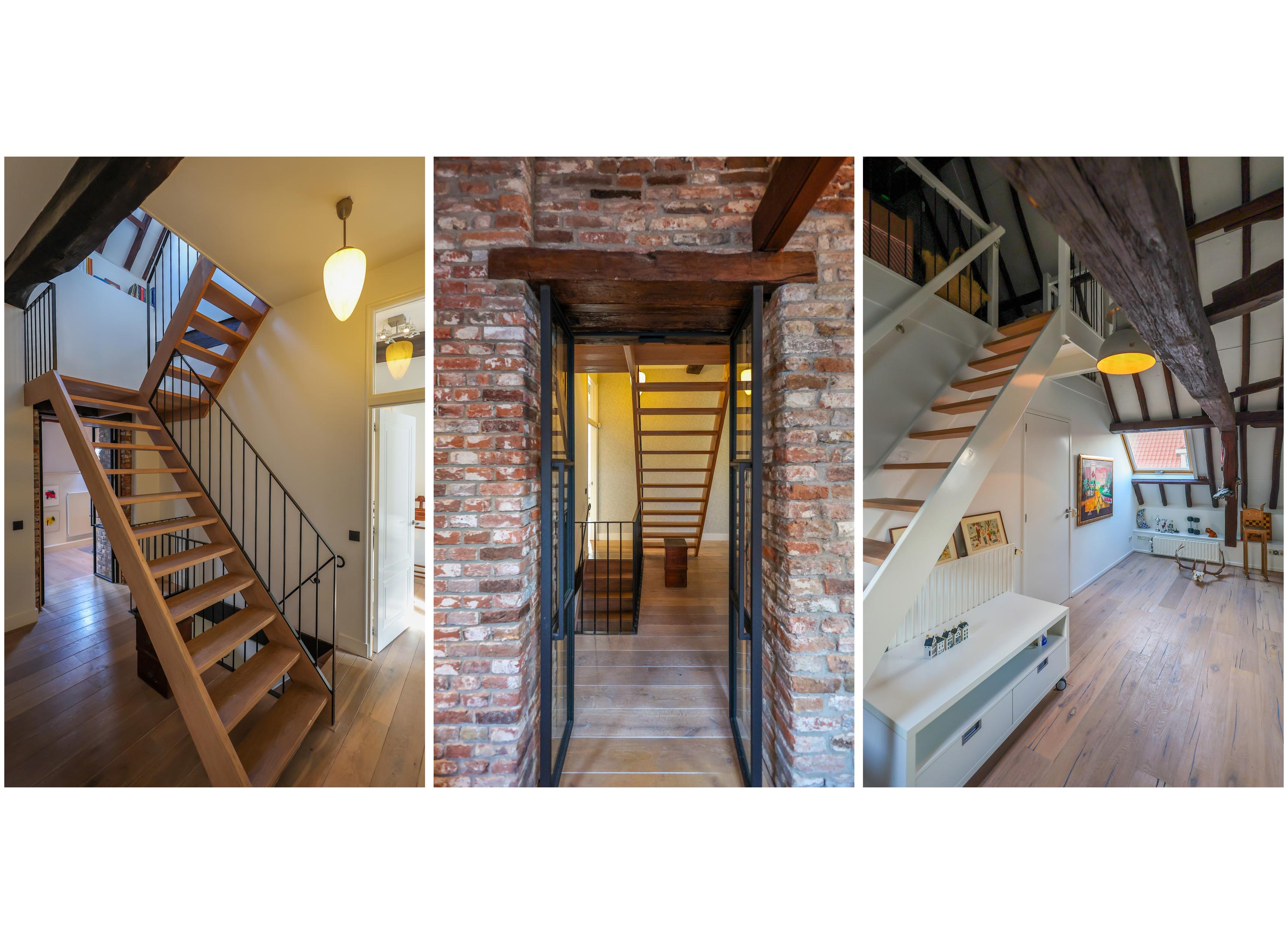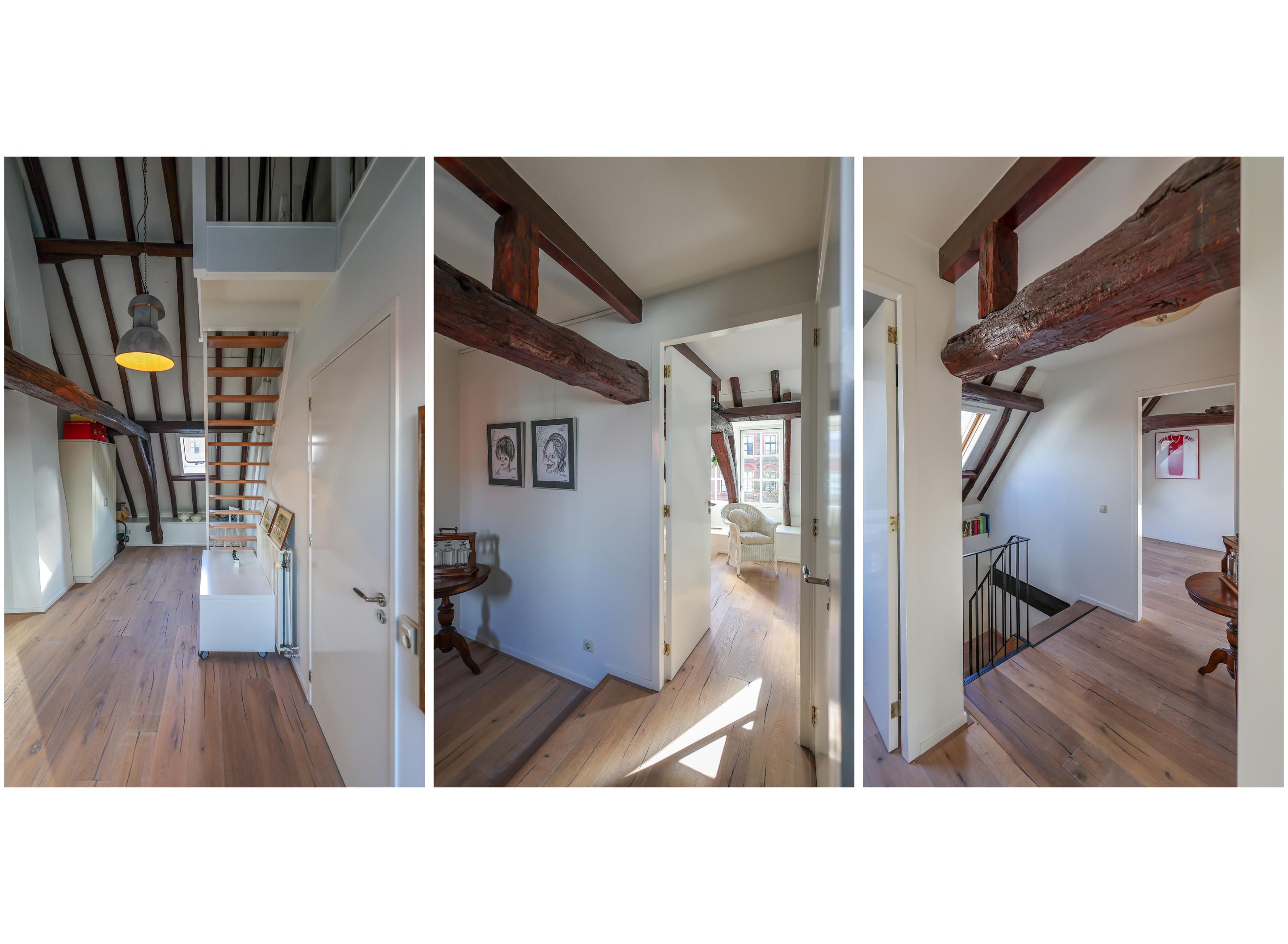 The primary bedroom features a walk-in closet with custom cabinetry and a spacious bathroom. Upstairs, an impressive work or play area showcases exposed segments of the old city wall beneath generous skylights, accentuating the connection to Amersfoort’s rich past. Three more bedrooms and a second bathroom offer flexible accommodation.