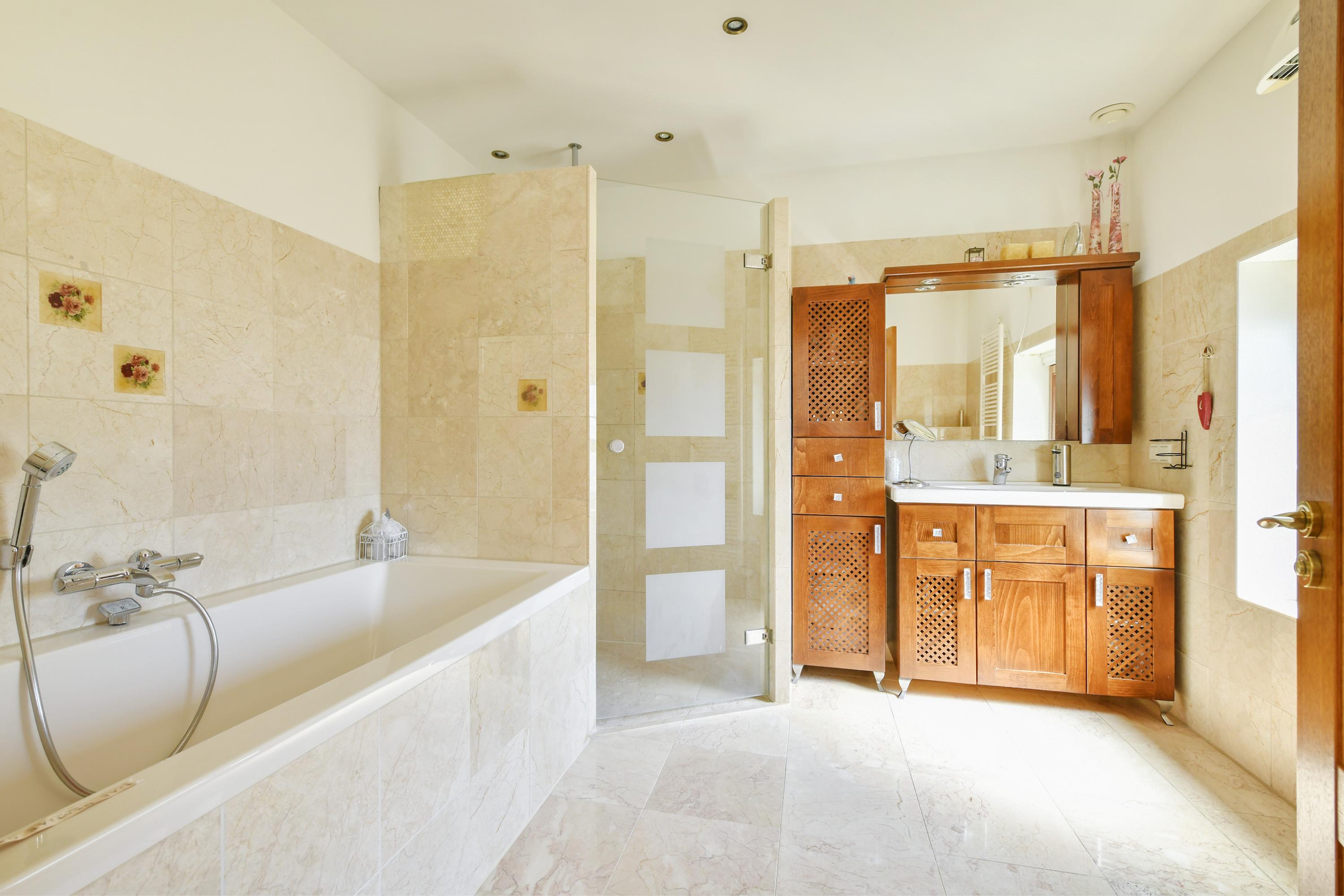 The first floor features five well-sized bedrooms and two modern bathrooms. The master bedroom at the front includes a walk-in wardrobe and direct access to the main bathroom, which is fitted with a bathtub, shower and washbasin. The second bathroom, accessible from the landing, includes a shower, washbasin and toilet.