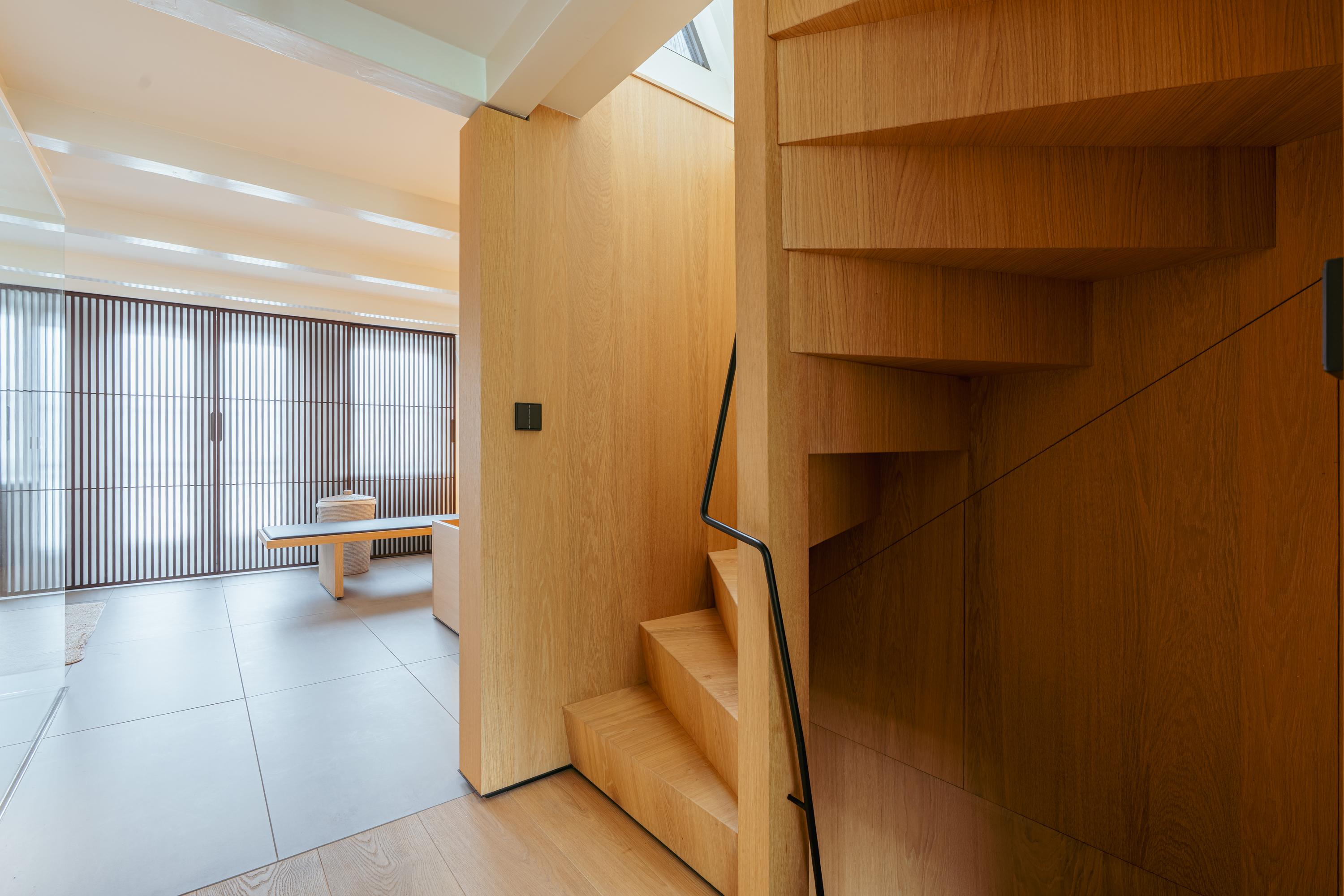 The entrance provides access to both the residence and the multifunctional commercial space on the ground floor. This space is finished with great attention to detail, exuding character through wooden elements, exposed ceiling beams, and high-quality materials. Large double doors at the front can be fully opened, creating an inviting look and allowing for ample natural light. Inside, the space is practical yet stylishly arranged. A compact but luxuriously finished kitchenette, a neat toilet, and a separate laundry and technical room complete this floor. A large skylight at the rear brings in abundant daylight, adding to the open and airy feel. Rear access to a private outdoor space is available, as well as a second entrance directly from the street — providing flexibility for use as a studio, home office, or practice space.