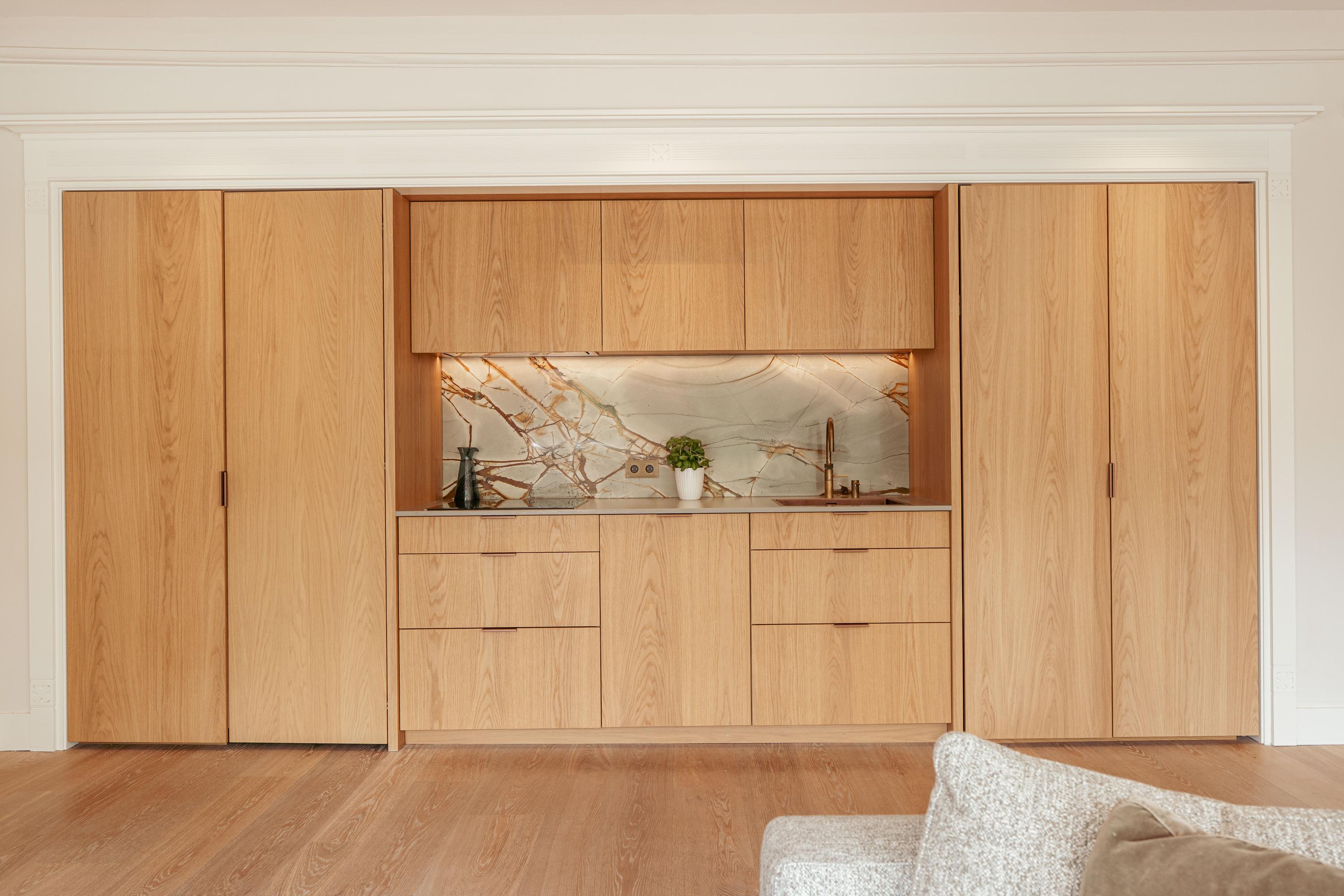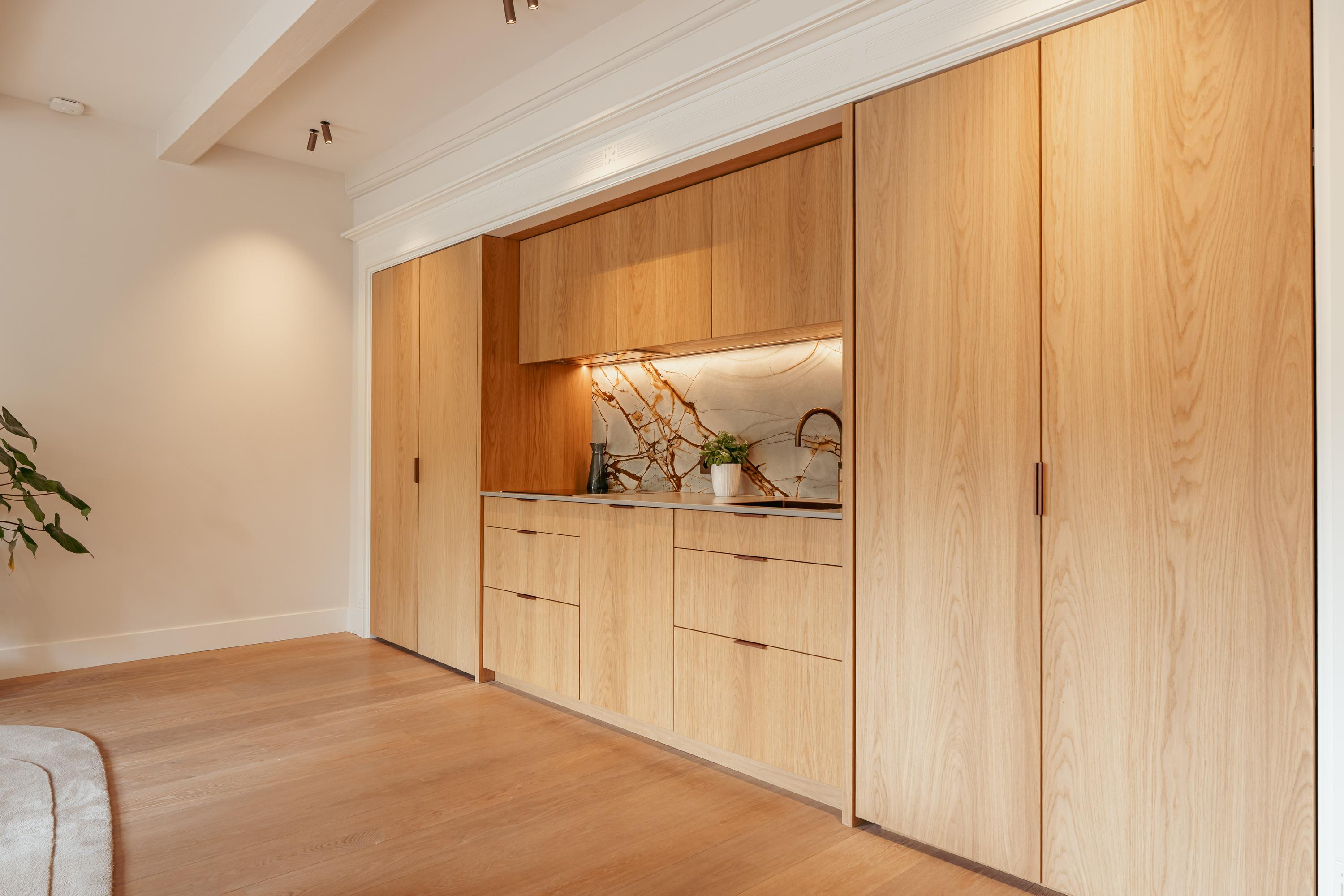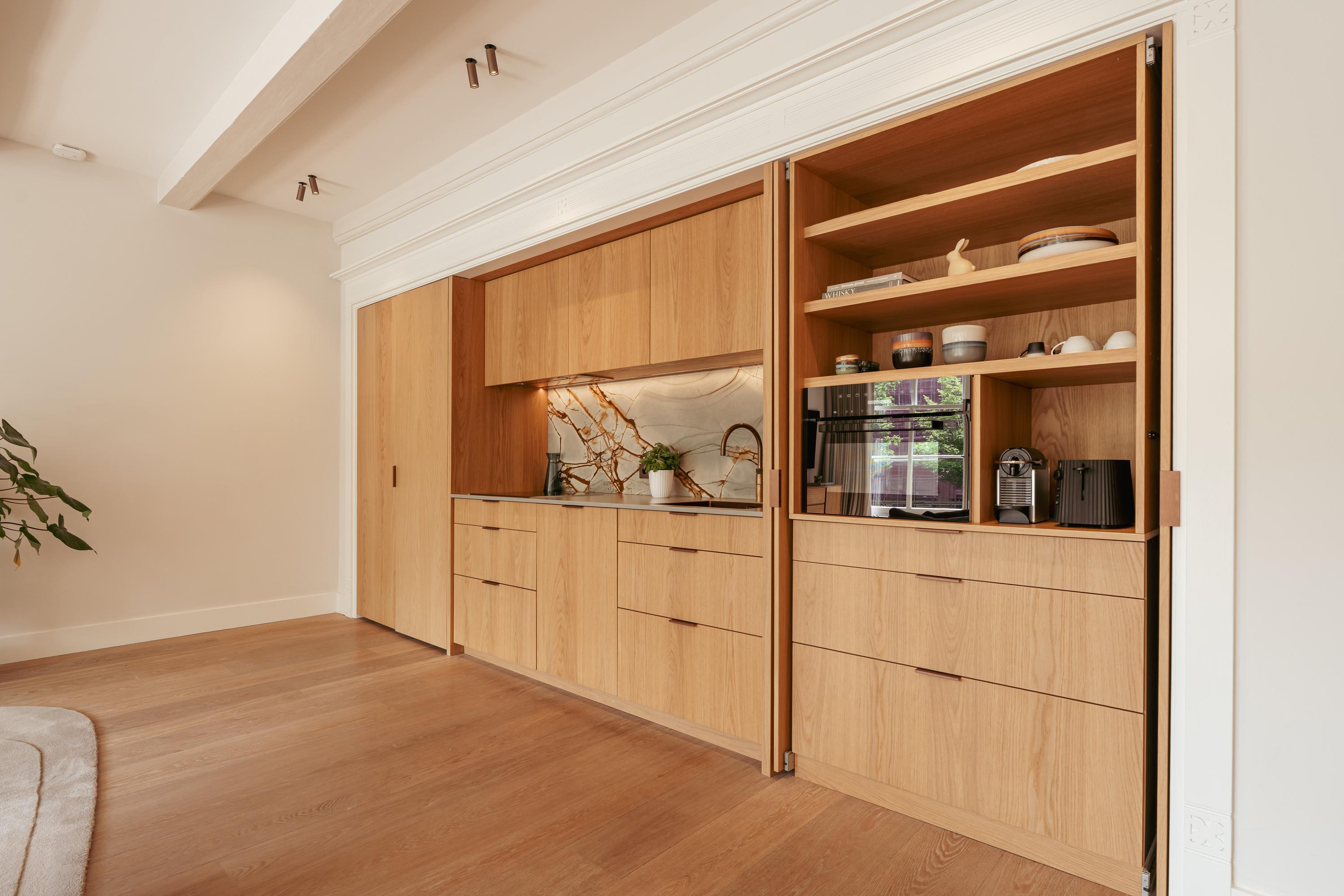 Aangrenzend ligt de moderne keuken, volledig uitgerust met hoogwaardige inbouwapparatuur waaronder een inductiekookplaat, afzuigkap, een combi-oven, vaatwasser, spoelbak, quooker en een afsluitbare inbouwkast die perfect dienst doet als koffiecorner. Een speels en praktisch element is de “verborgen” deur, weggewerkt in de kastenwand, die toegang biedt tot een royale pantry/washok.