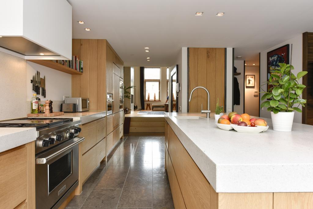 The generous entrance with a lift offers access to the apartment. Spacious hallway with separate toilet and cloakroom. You enter into the epicentre of the apartment - the open kitchen - which provides access to the spacious garden of 41 m2 through French windows. The luxurious and well-equipped kitchen is fitted with all the conveniences you can imagine. From the professional dishwasher to the several fridges, which make staying in this space an absolute joy. Here, you will also find a spacious cupboard under the stairs.