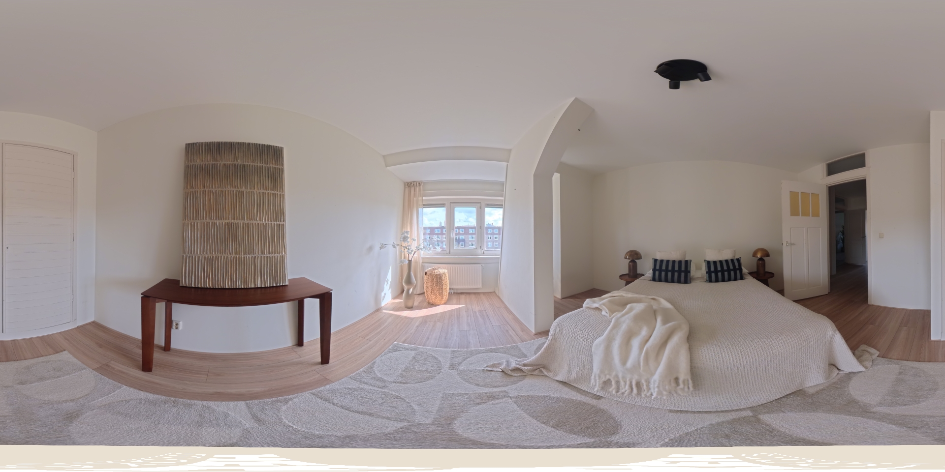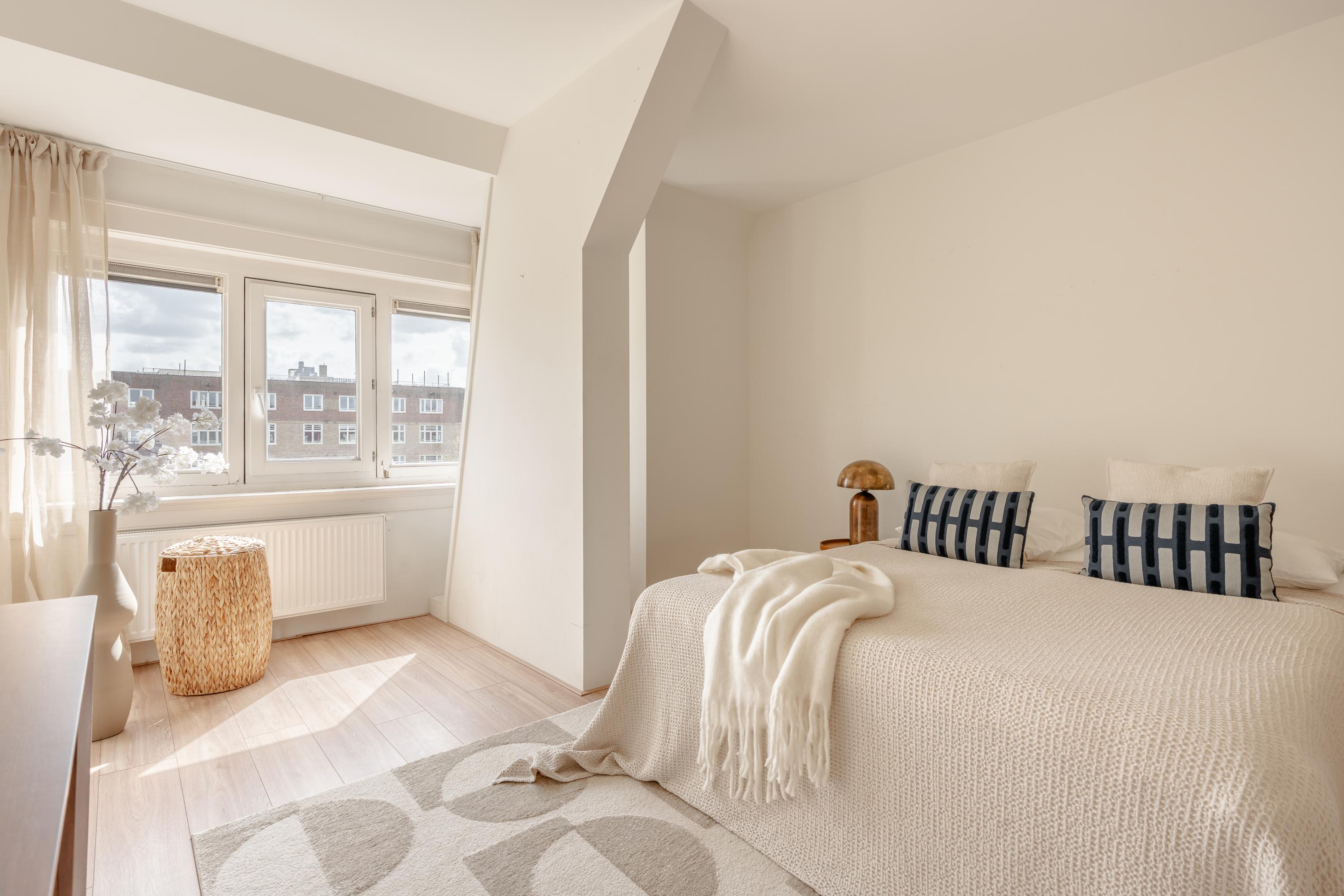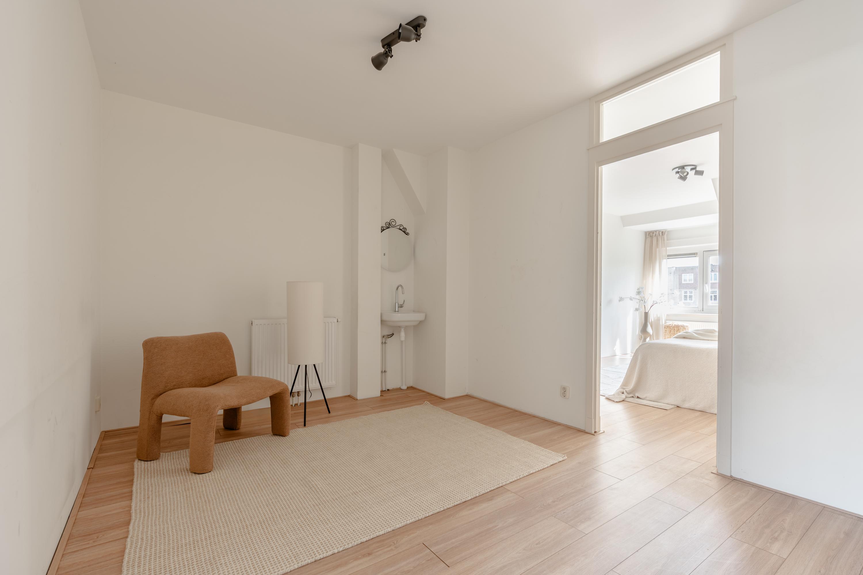 The living room at the front offers ample space to create a comfortable seating area. The charming bay window with opening windows allows for plenty of natural light and offers pleasant views over Jozef Israelskade and the water. At the rear, you will find the kitchen, situated in a pleasant open space yet separate from the living room. This makes it an ideal place to cook in peace and enjoy dining. Thanks to the three sets of French doors opening onto the balcony, this area is exceptionally bright. The kitchen is fully equipped, including a refrigerator, freezer, dishwasher, and a four-burner gas stove. The wide balcony, facing northwest, overlooks the quiet inner courtyard and provides a lovely place to relax. Adjacent to the kitchen is a bedroom that also has access to the balcony. This room can be flexibly arranged, for example as a home office, study, or children's room. The bathroom is also located on this level and features a bathtub, toilet, walk-in shower, and washbasin.