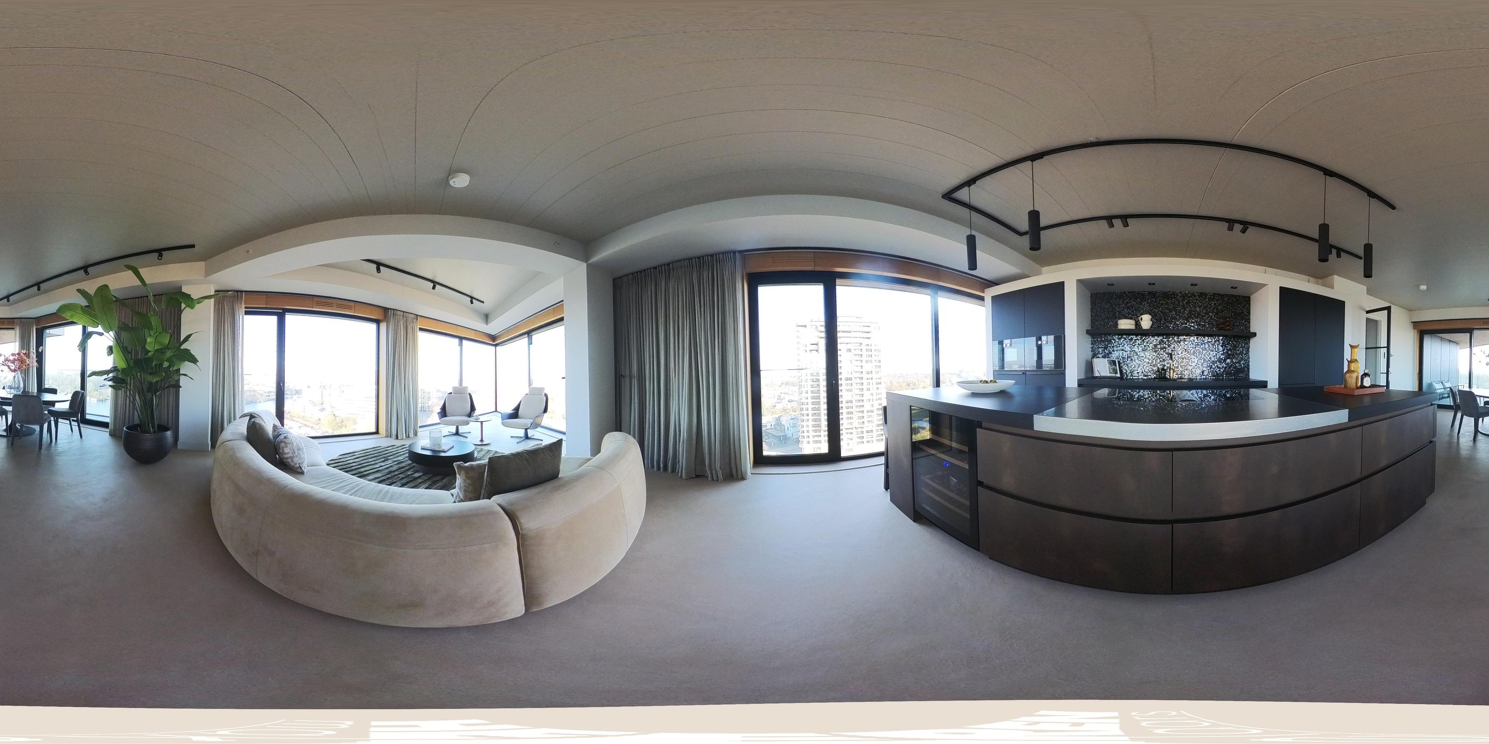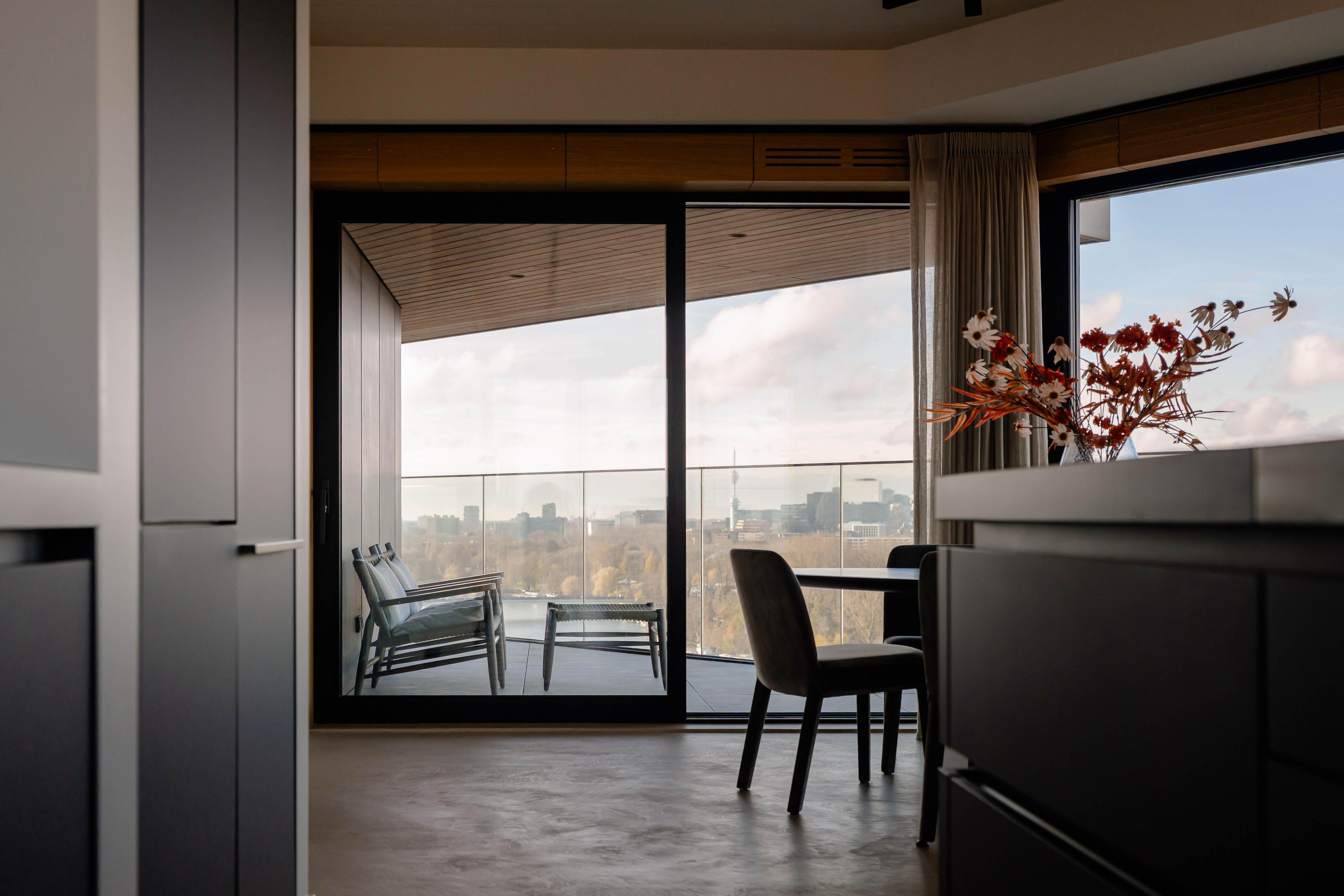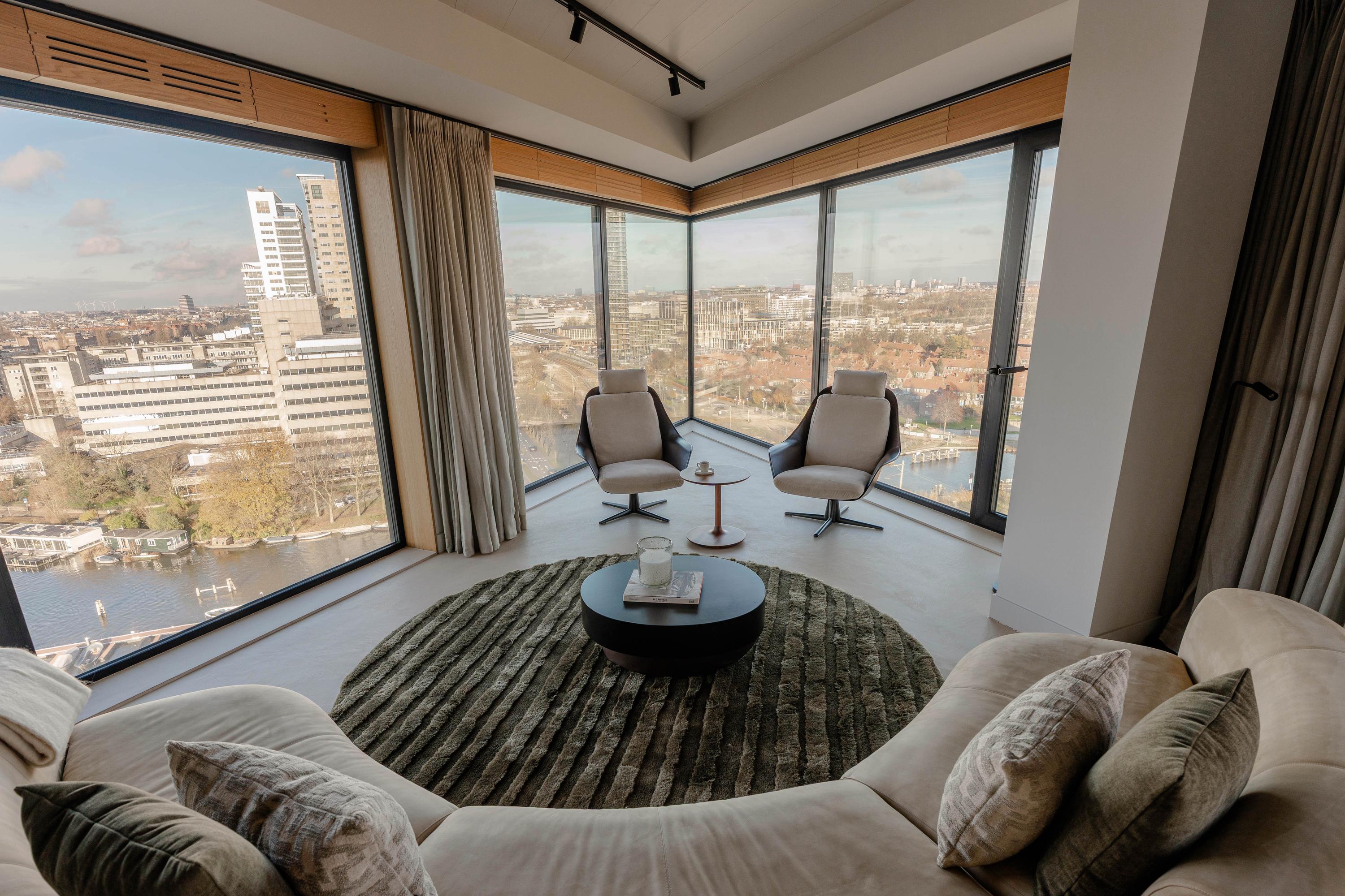 The apartment is accessed via the shared entrance, either by lift or staircase. Upon entering, you arrive in a spacious hallway that provides access to nearly all rooms of the property. From here, you reach the generous living room with open kitchen, three bedrooms, a bathroom, and a separate toilet. The living room is distinguished by its unique triangular layout and the extensive floor-to-ceiling windows along the façade, which ensure excellent natural light and offer unobstructed views towards the River Amstel. The space is generously proportioned and easily accommodates a comfortable seating area and a large dining table. From the living room, there is access to the spacious, covered balconyan inviting outdoor area with beautiful views over the city and the water. The open kitchen is centrally positioned within the living area and designed in a modern, sleek style. It is equipped with high-quality built-in appliances, including an induction cooktop with integrated extraction, a Quooker, a climate-controlled wine cabinet, a fridge/freezer combination, a dishwasher, and two Gaggenau ovens. The apartment features three well-proportioned bedrooms. The largest bedroom benefits from an en-suite bathroom, luxuriously finished with a washbasin and vanity unit, walk-in shower, and toilet. The second bathroom is accessible from the hallway and includes a walk-in shower, double washbasin, and a light, contemporary finish. In addition, there is a separate toilet.