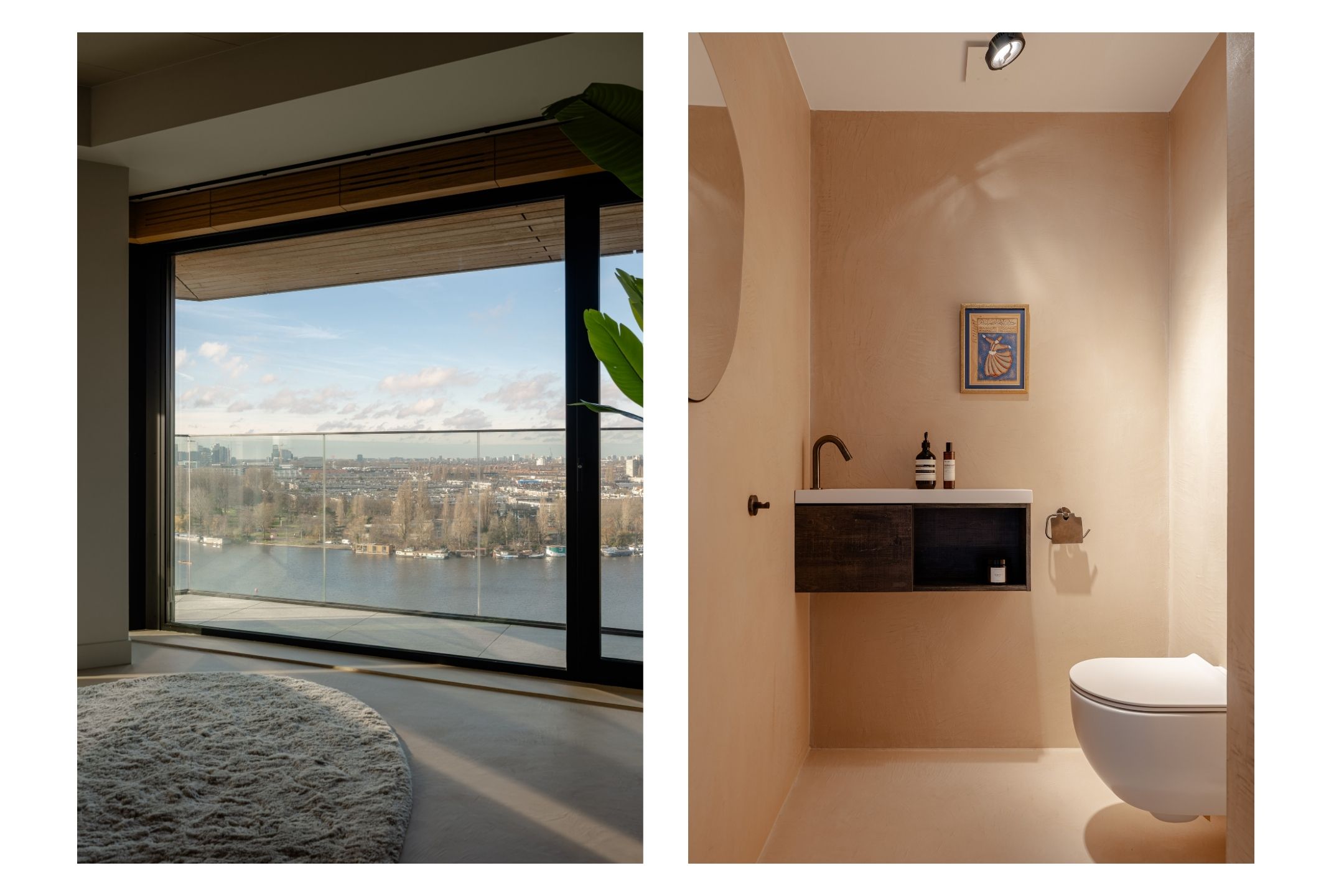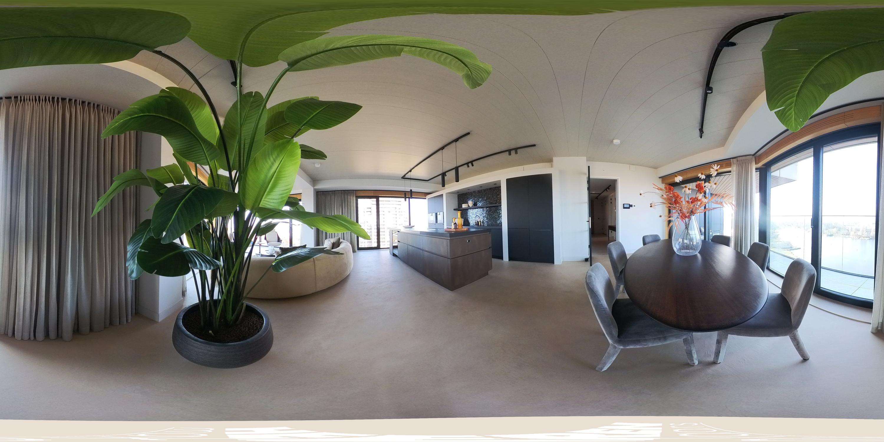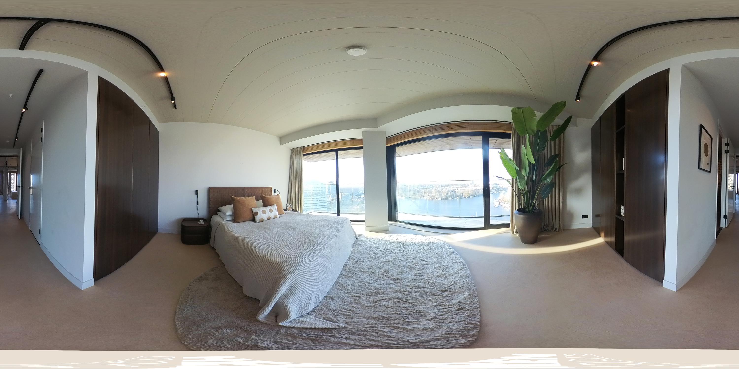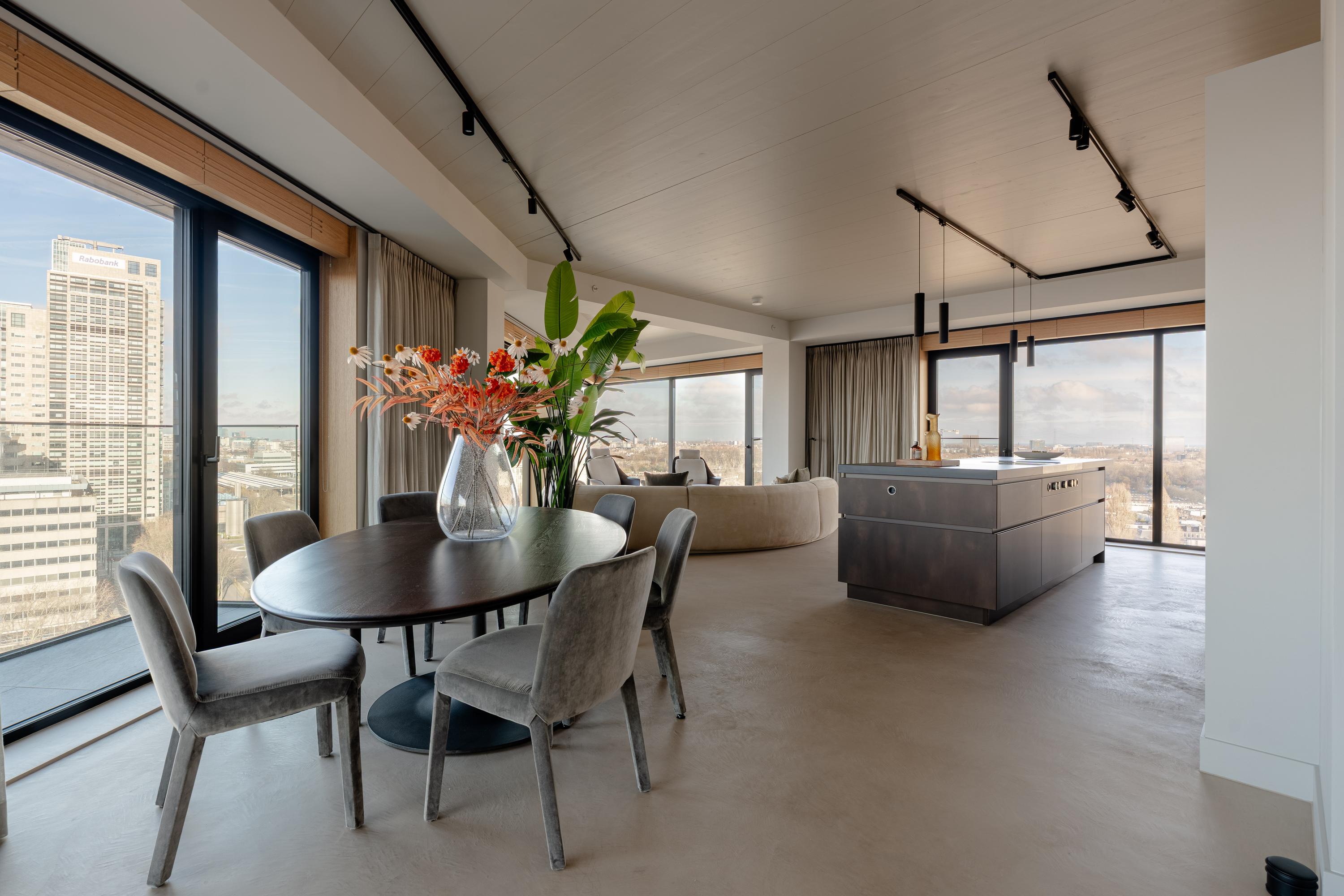The apartment is accessed via the shared entrance, either by lift or staircase. Upon entering, you arrive in a spacious hallway that provides access to nearly all rooms of the property. From here, you reach the generous living room with open kitchen, three bedrooms, a bathroom, and a separate toilet. The living room is distinguished by its unique triangular layout and the extensive floor-to-ceiling windows along the façade, which ensure excellent natural light and offer unobstructed views towards the River Amstel. The space is generously proportioned and easily accommodates a comfortable seating area and a large dining table. From the living room, there is access to the spacious, covered balconyan inviting outdoor area with beautiful views over the city and the water. The open kitchen is centrally positioned within the living area and designed in a modern, sleek style. It is equipped with high-quality built-in appliances, including an induction cooktop with integrated extraction, a Quooker, a climate-controlled wine cabinet, a fridge/freezer combination, a dishwasher, and two Gaggenau ovens. The apartment features three well-proportioned bedrooms. The largest bedroom benefits from an en-suite bathroom, luxuriously finished with a washbasin and vanity unit, walk-in shower, and toilet. The second bathroom is accessible from the hallway and includes a walk-in shower, double washbasin, and a light, contemporary finish. In addition, there is a separate toilet.