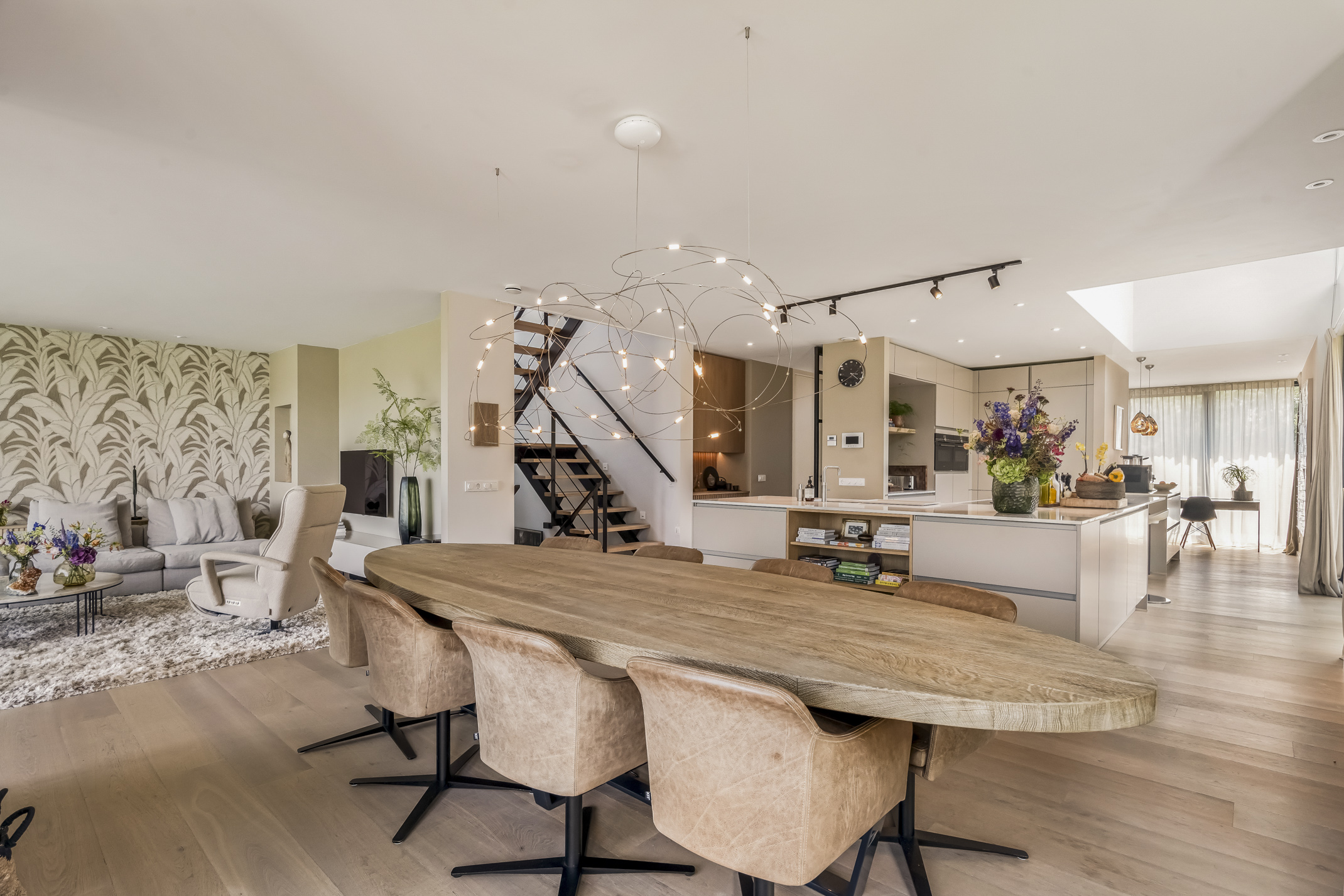 From the spacious hall with high ceilings, you enter the generous living area with large glass windows that immediately offer a beautiful view. The space has an impressive ceiling height and a cozy fireplace. Various sliding doors lead to the carefully landscaped garden with its own dock on the water. The garden features a large hardwood terrace, lawn and green borders.