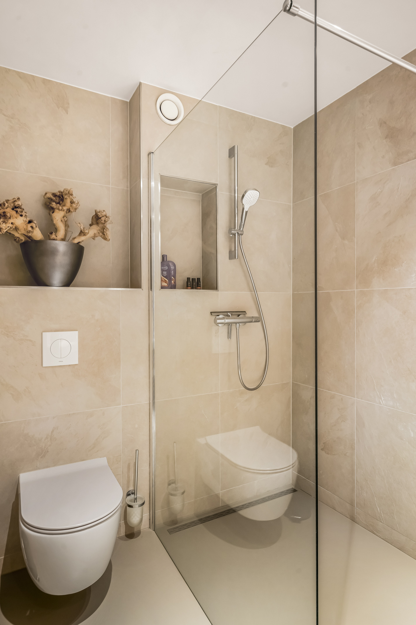This full-fledged floor with daylight houses a home cinema, guest room, room with a ping pong table, the technical room, storage space and the third bathroom. The bathroom features a toilet, sink and walk-in shower.