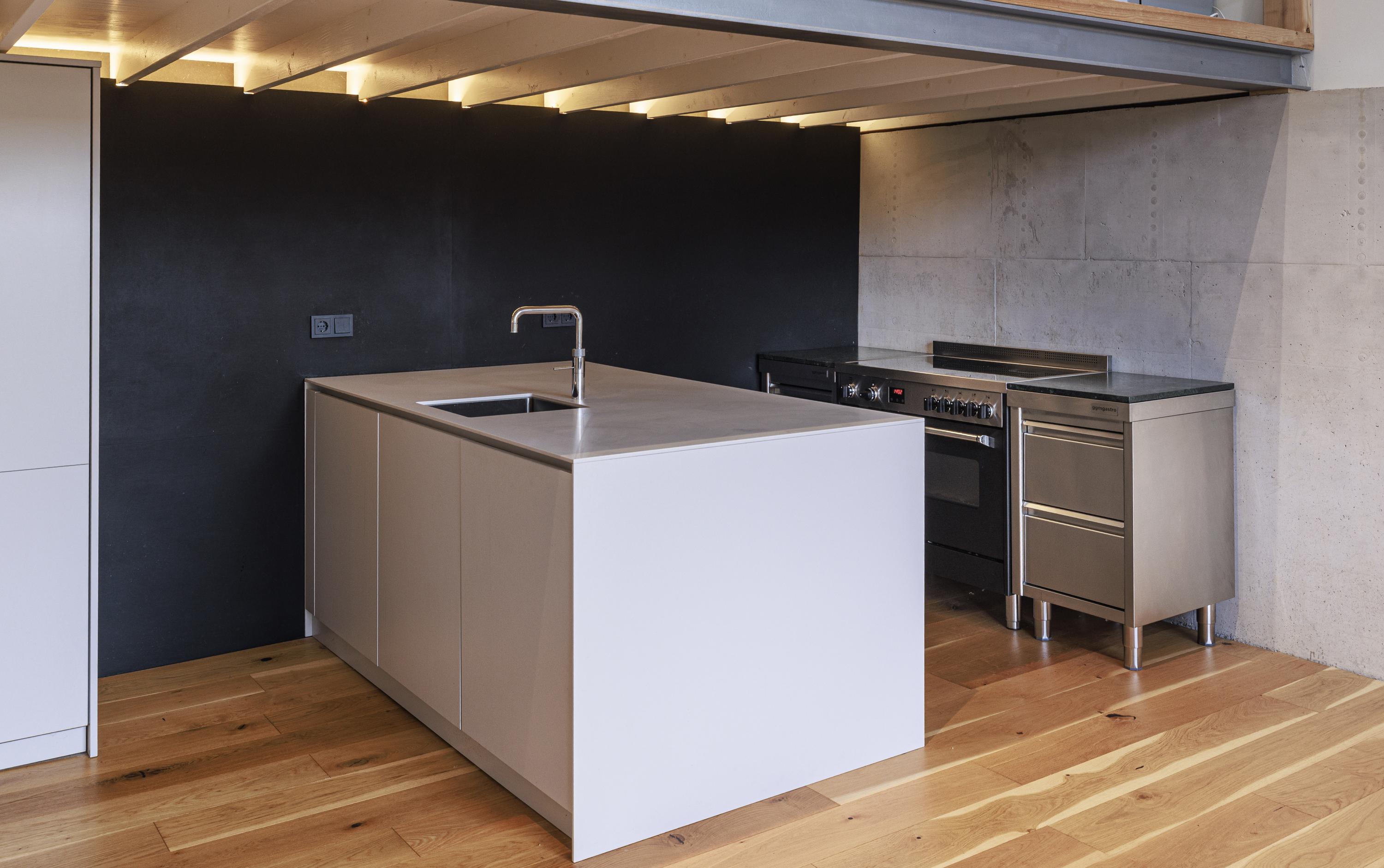 What immediately stands out is the remarkable sense of space. The soaring living area forms the heart of the home and features a mezzanine with an open office space. Beneath the mezzanine is a bespoke kitchen. Thanks to the enormous glass façade, both the mezzanine and the living room enjoy an abundance of natural light and beautiful views of the garden and terrace.