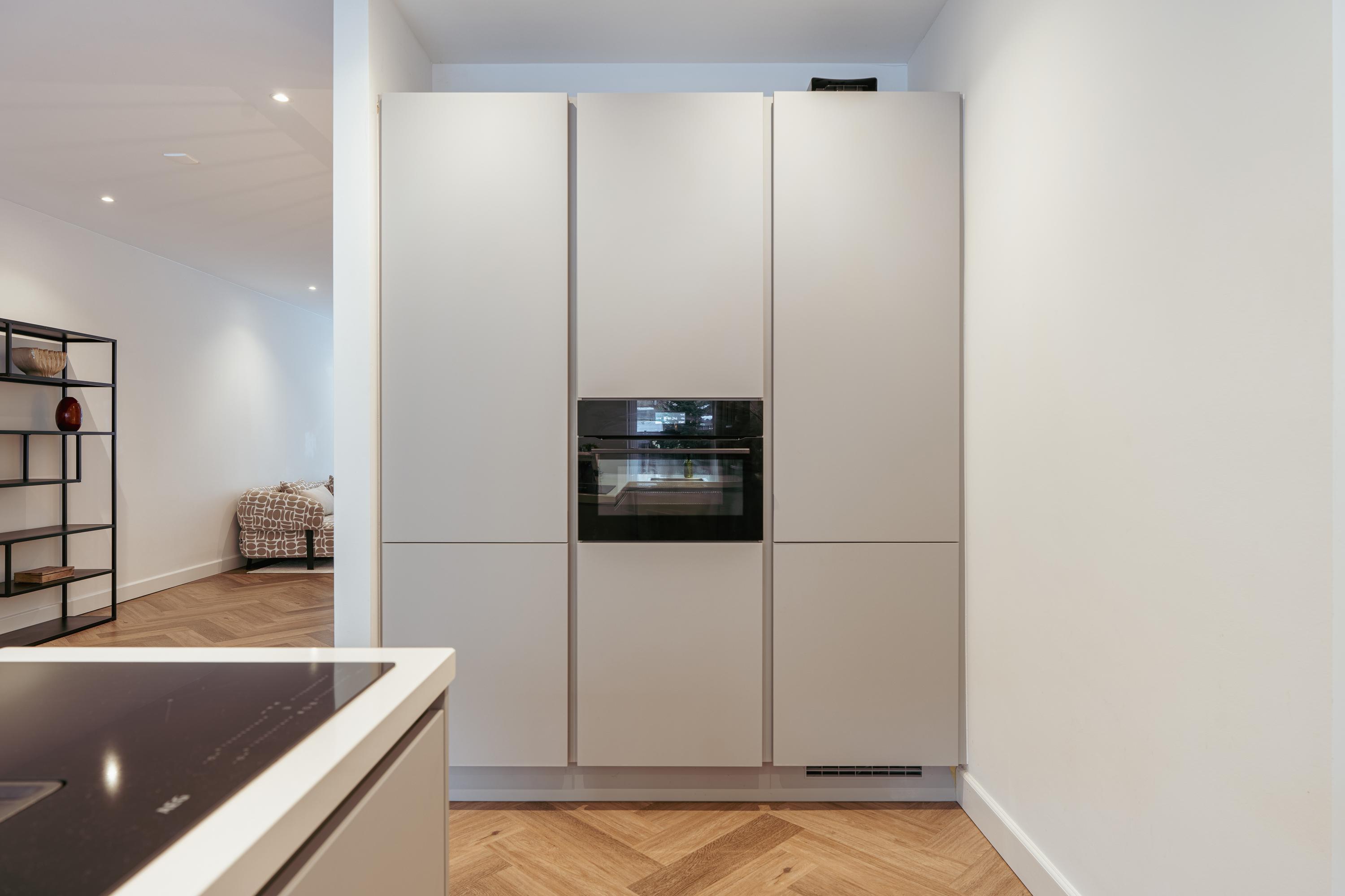 The property is accessed via a private entrance from the street. The entrance hall features a separate toilet with washbasin and a meter cupboard, and provides access to the main living area. The spacious and inviting living room extends across the full depth of the apartment and offers a comfortable layout with a natural division between the sitting and dining areas. Centrally positioned within the home is the recently renovated open-plan kitchen, finished in a modern design and equipped with all contemporary conveniences. These include a built-in induction hob with integrated extractor, dishwasher, oven, fridge/freezer combination, and a practical bar area with fixed seating for three—ideal for informal dining or entertaining. Adjacent to the dining area, sliding doors open onto the rear garden of approximately 65 m². This generous outdoor space is low-maintenance and offers ample room for a dining table, lounge area, and barbecue. A wonderful place to enjoy peace and privacy outdoors, right in the heart of the city.