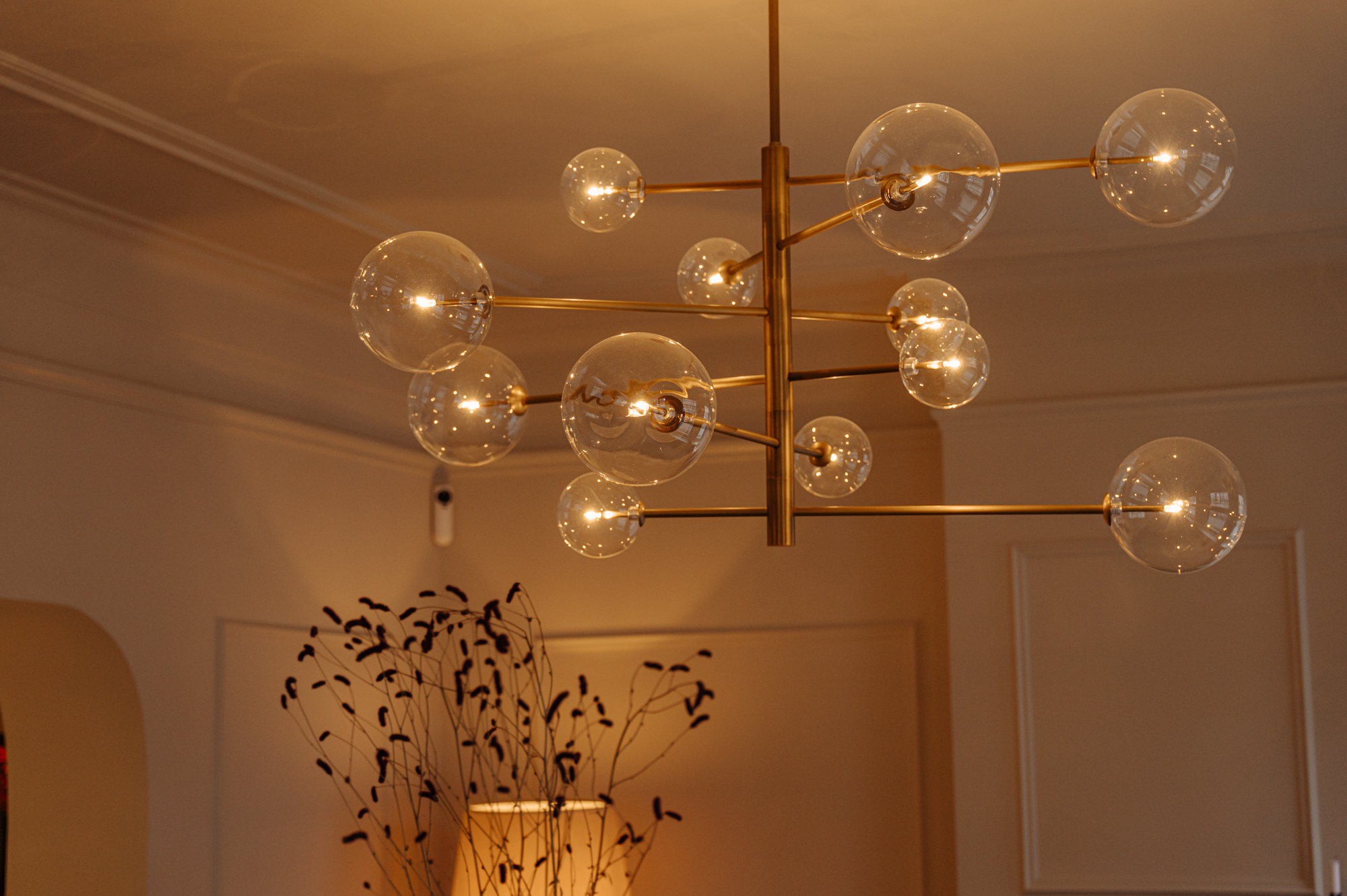 With two cosy fireplaces, ornate ceiling mouldings and chic panelling, the generous-sized living room exudes luxury and atmosphere. The warm, dark-brown wooden floor, laid in a classic Hungarian point, adds character. The extra room next to the living room would make an excellent study or second living room.
