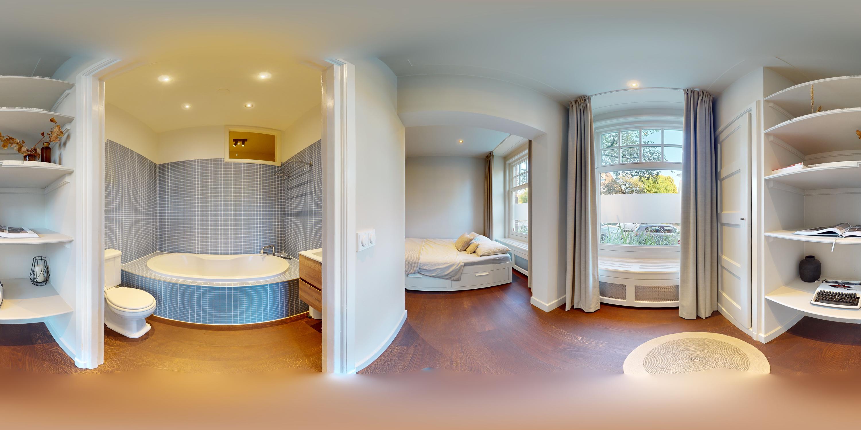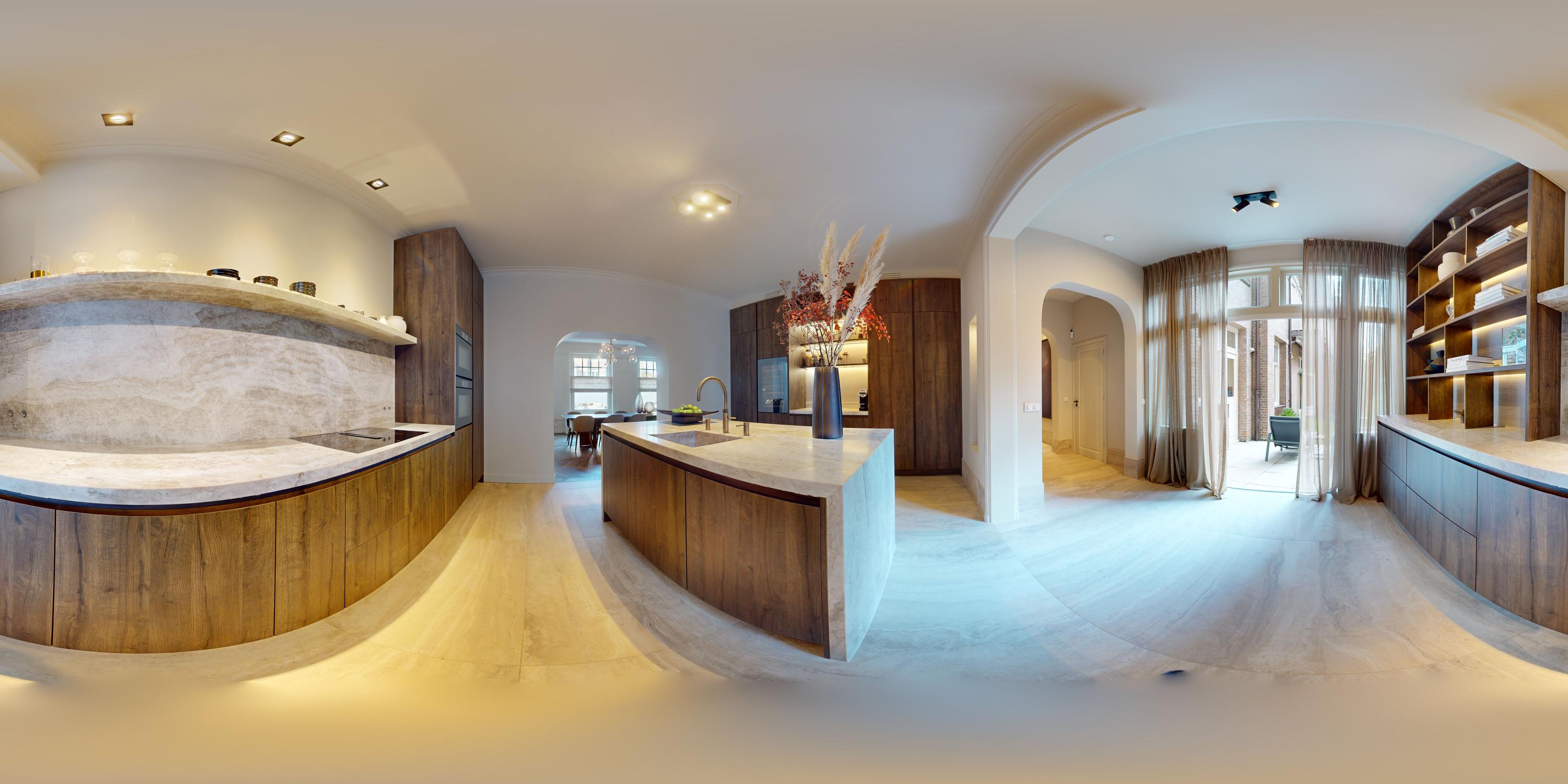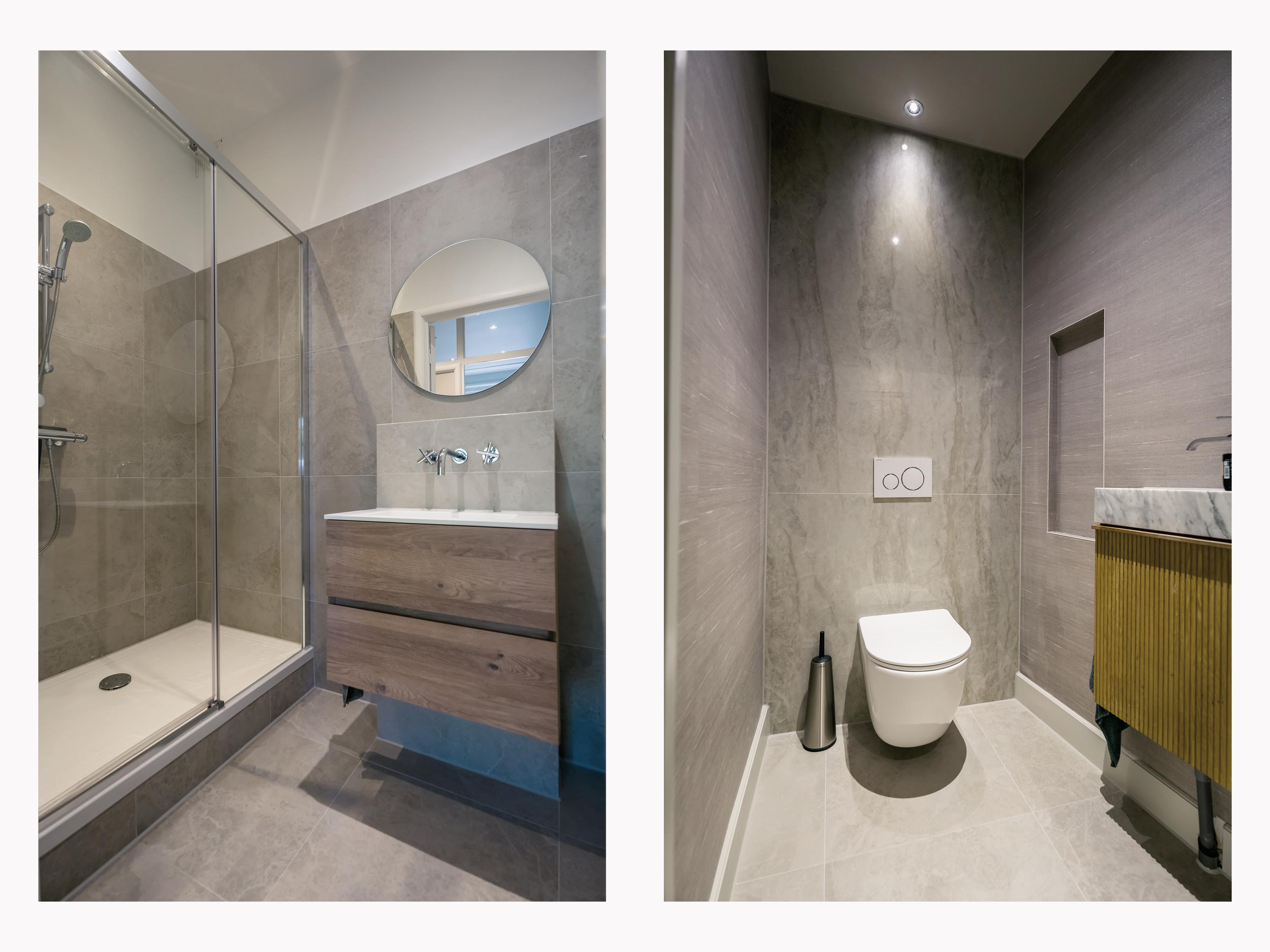 The kitchen follows on from the living room. The luxury kitchen-living area is a real eye-catcher and the beating heart of the property. No detail was overlooked during the renovation: a beautiful marble worktop, custom-made units, large floor tiles and modern LED lighting with dimmers make the kitchen both practical and stylish. The kitchen comes complete with high-end built-in appliances, including a combi-oven, steam oven, dishwasher, fridge-freezer, an induction hob with an integrated extractor, a brass Quooker and a wine climate cabinet. French doors open out onto a sunny, south-west-facing garden.
