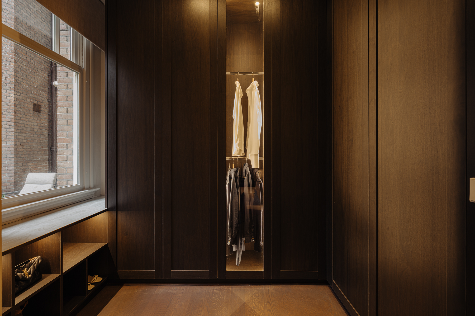 The apartment is entered via an ample hall that creates an immediate sense of space and elegance. The hall also gives access to a separate guest toilet and all the property’s other rooms. A large living room with a semi-open kitchen can be found on the right. The bedrooms and bathrooms are on the left.