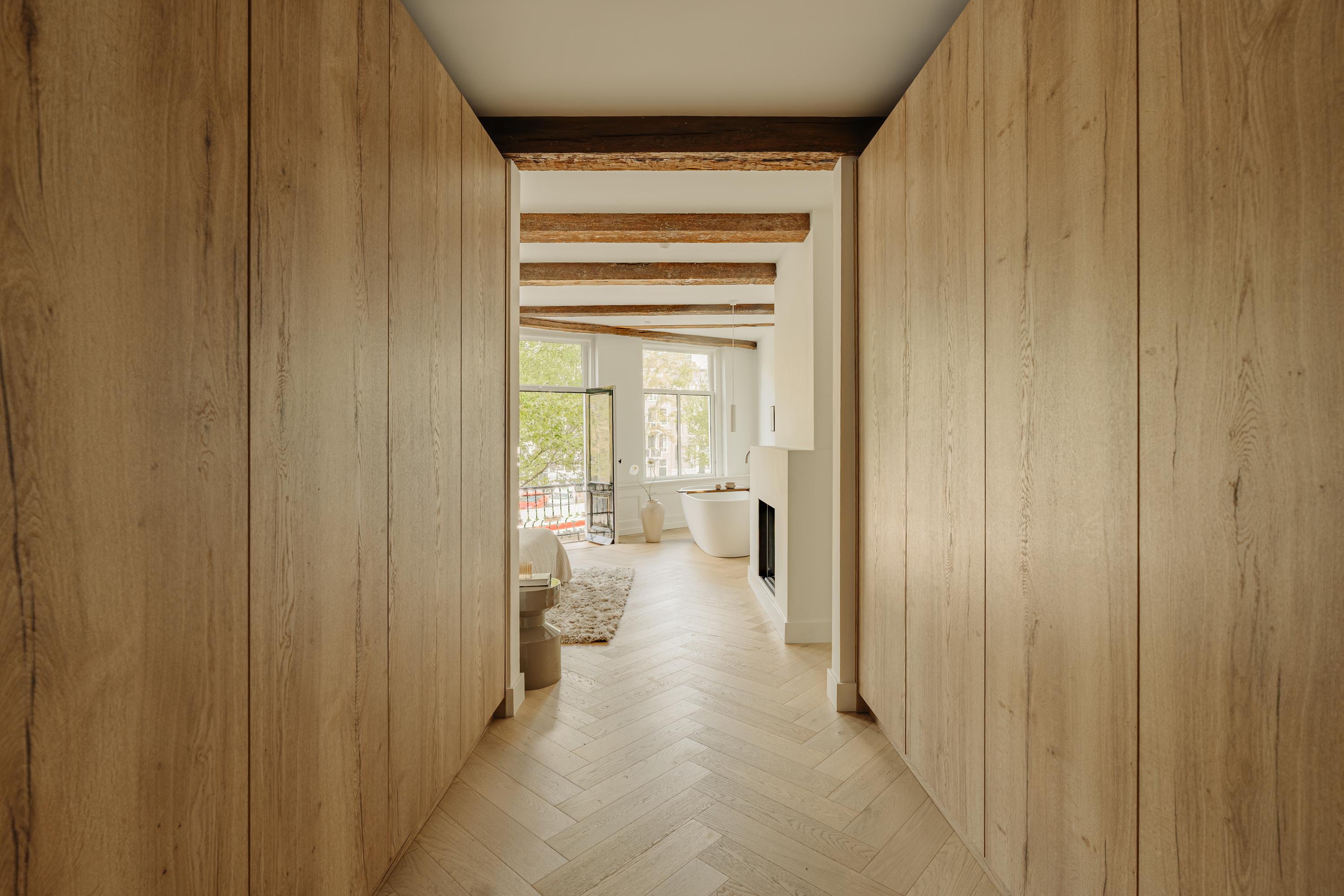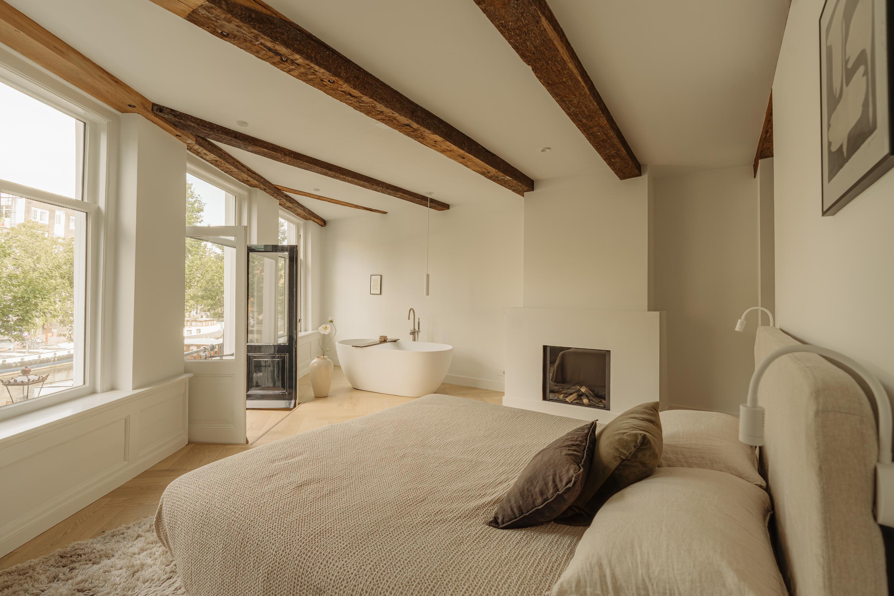 The first floor accommodates the primary bedroom at the front, offering canal views and a warm, natural, and serene ambiance thanks to its large windows. A freestanding bathtub by the window, French balcony and fireplace give the space a luxurious and intimate feel.
