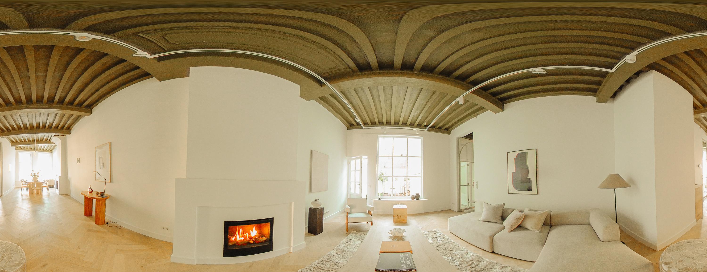 From the hall, you enter the living area. With a ceiling height of over 3.4 metres, original exposed beams, large windows and a beautiful view over the Singel, this is an impressive space where warmth and grandeur meet naturally. Two fireplaces on this floor add an extra sense of homeliness and refinement.