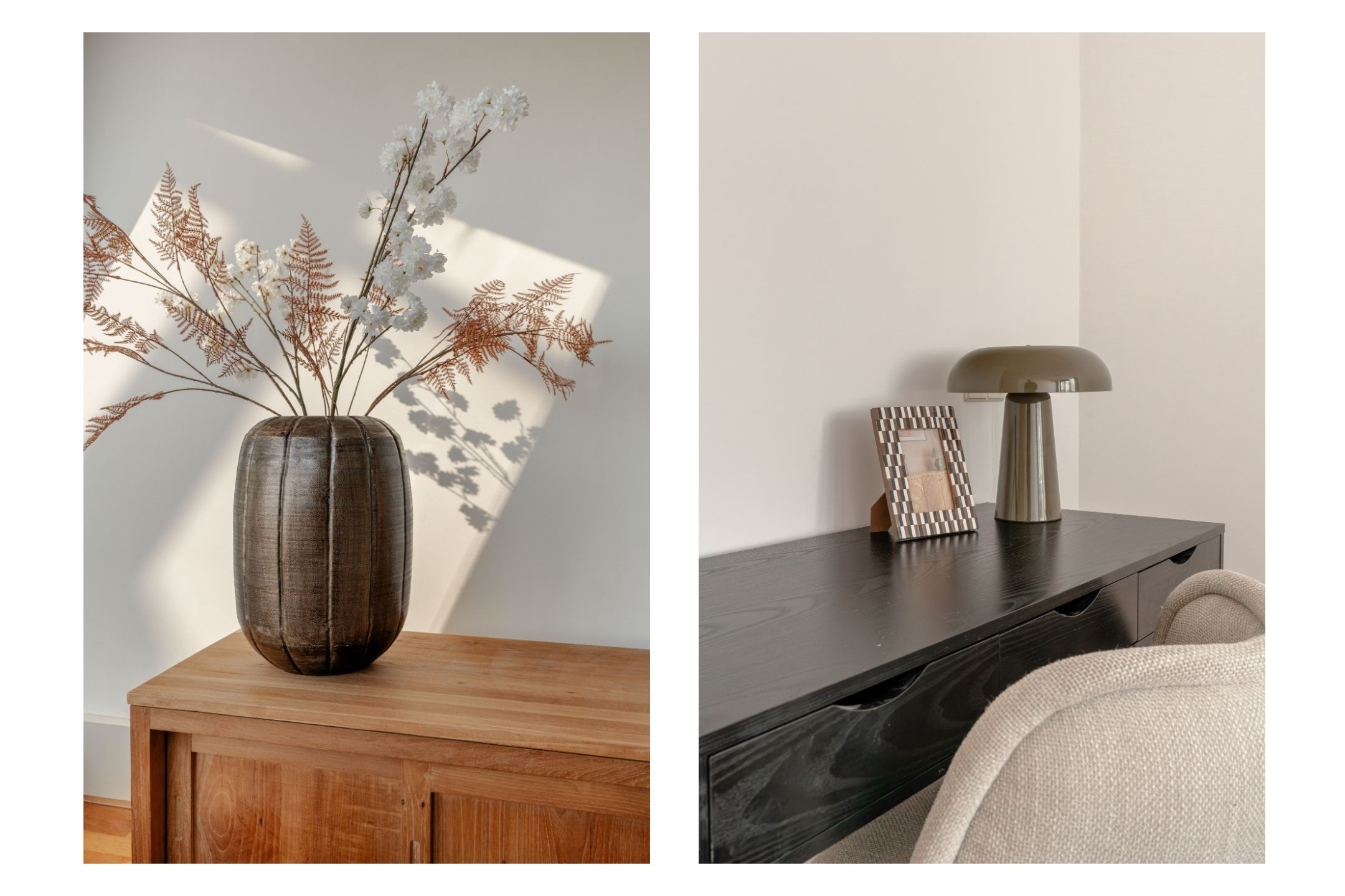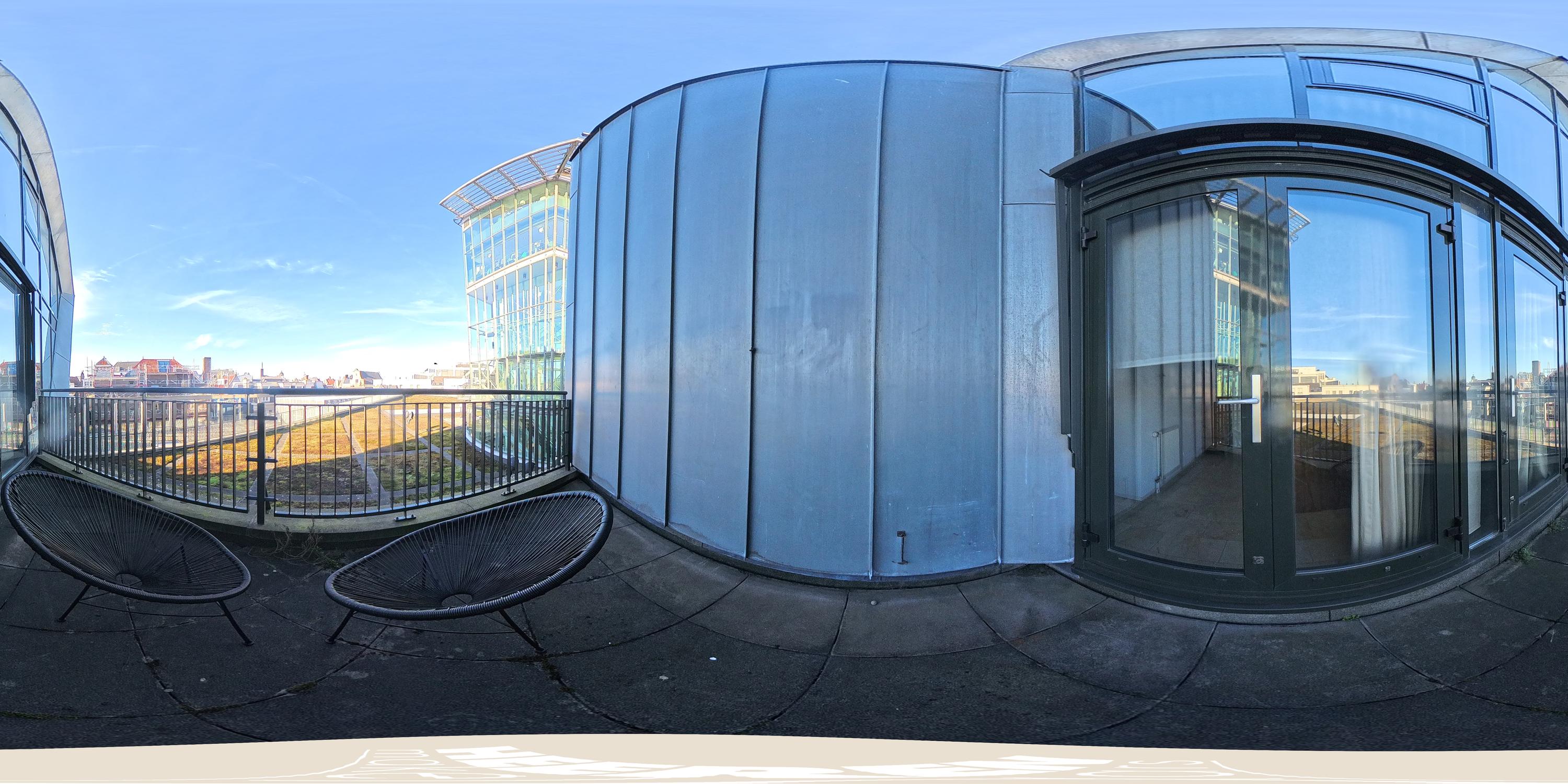 The apartment’s living level occupies the top floor, where large windows and generous ceiling heights invite daylight to animate the interiors. The living room opens to far-reaching views across the Singel and the city’s celebrated Flower Market, setting an atmosphere of refined urban calm. A half-open kitchen, complete with built-in appliances and an adjacent storage area, seamlessly connects to the dining space, ideal for gathering and entertaining.
