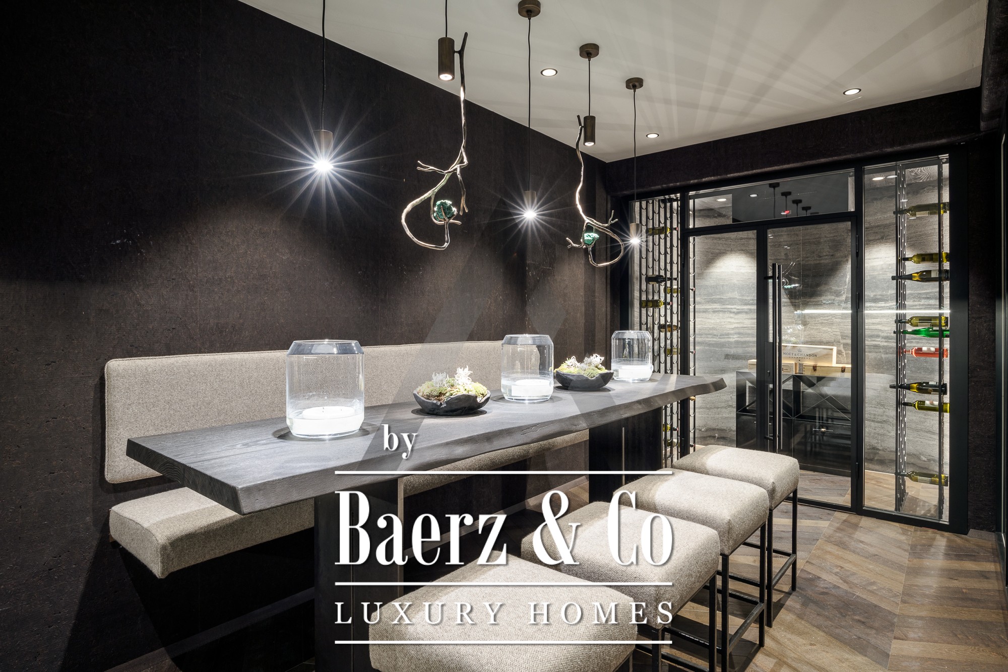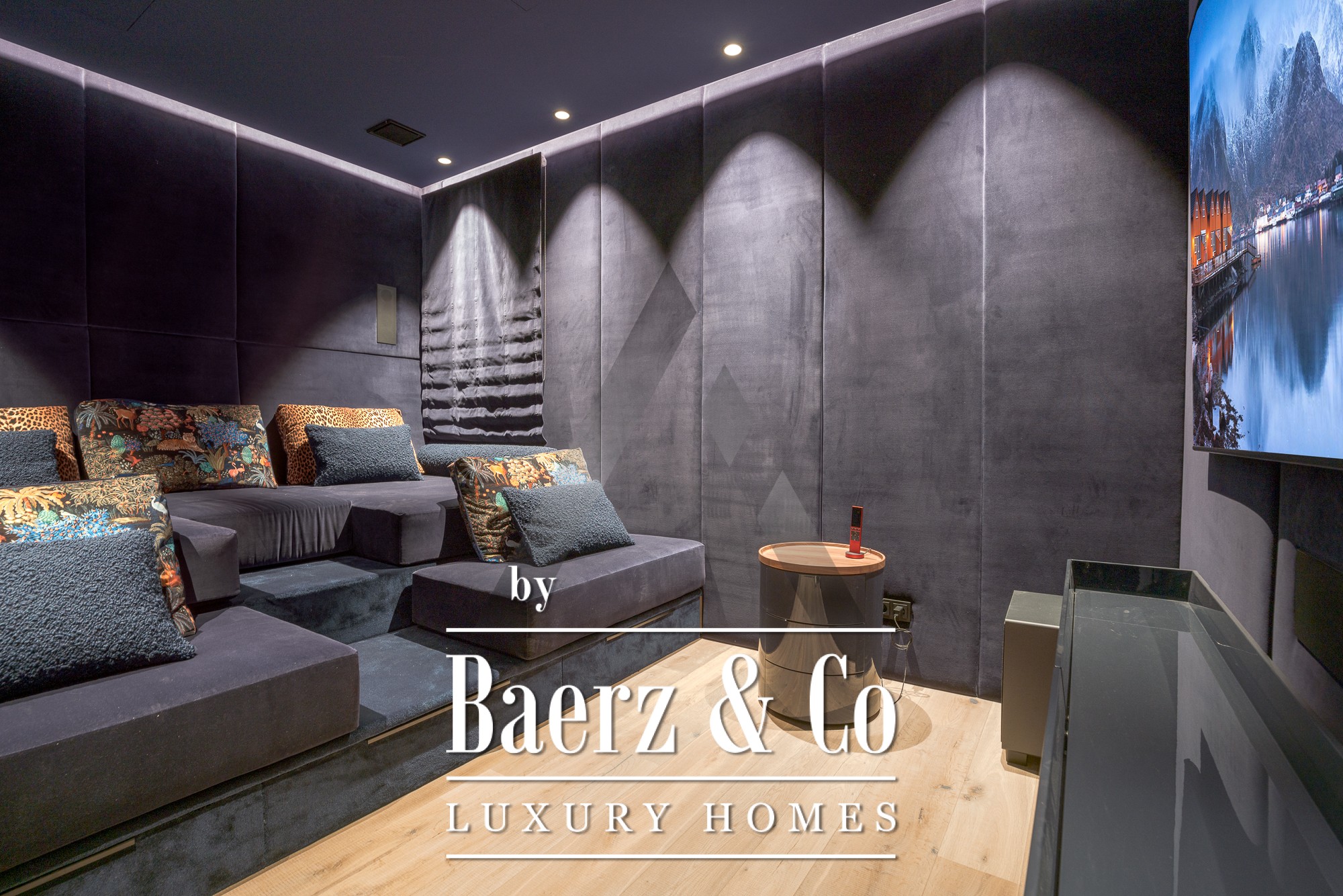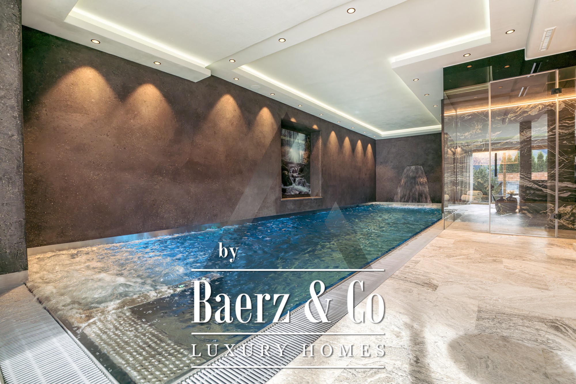 Wellness facilities include an indoor stainless steel pool with counter-current, sauna, steam bath, and a dedicated home theater. The wine cellar and a spacious underground garage for at least six cars elevate both the experience and convenience of alpine living. Generous terraces, balconies, and an outdoor lounge with a fireplace offer unobstructed mountain views ideal for sophisticated entertaining or quiet reflection. Extensive features such as floor heating, a surveillance system, elevator, and heated driveway complement every element of this luxury villa Aurach bei Kitzbühel, reflecting an unparalleled standard of comfort and privacy.
