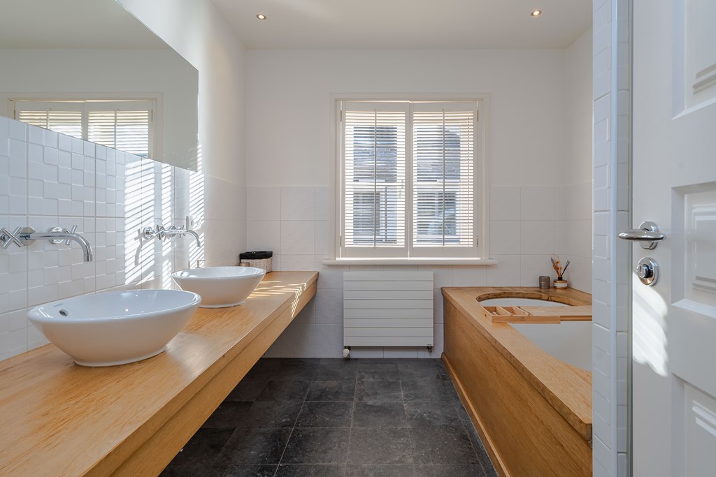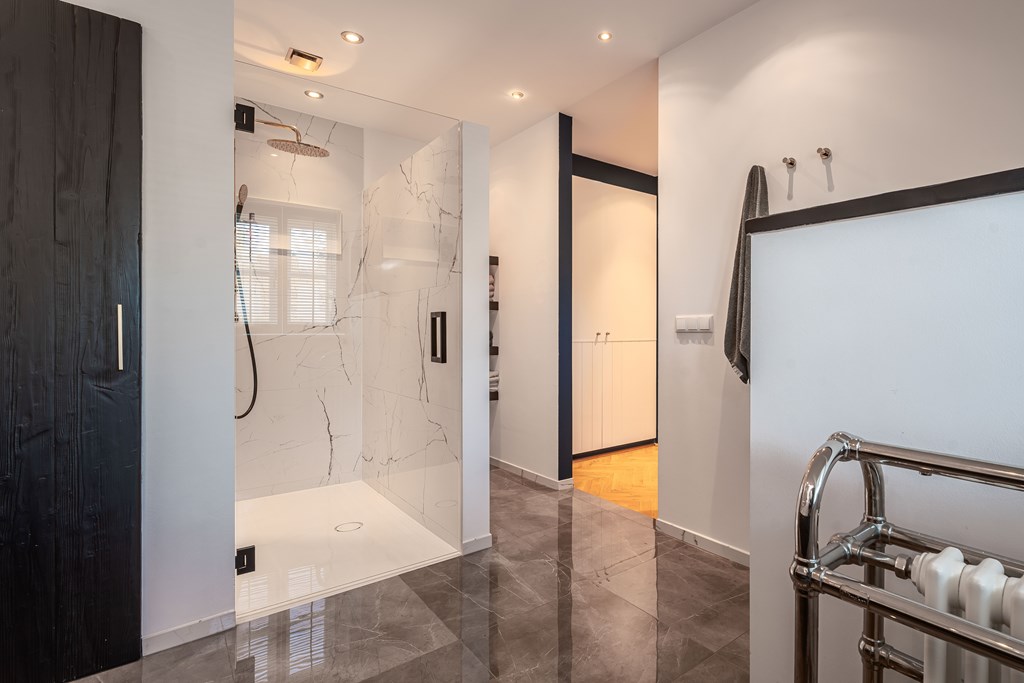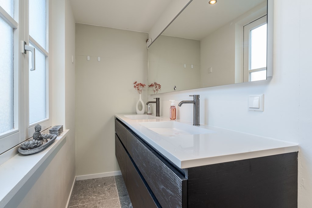 Deze badkamer is voorzien van een vloertegels, deels betegelde wanden, een fijne inloopdouche, twee wastafels met meubel, een wandcloset, inbouwverlichting en mechanische afzuiging.