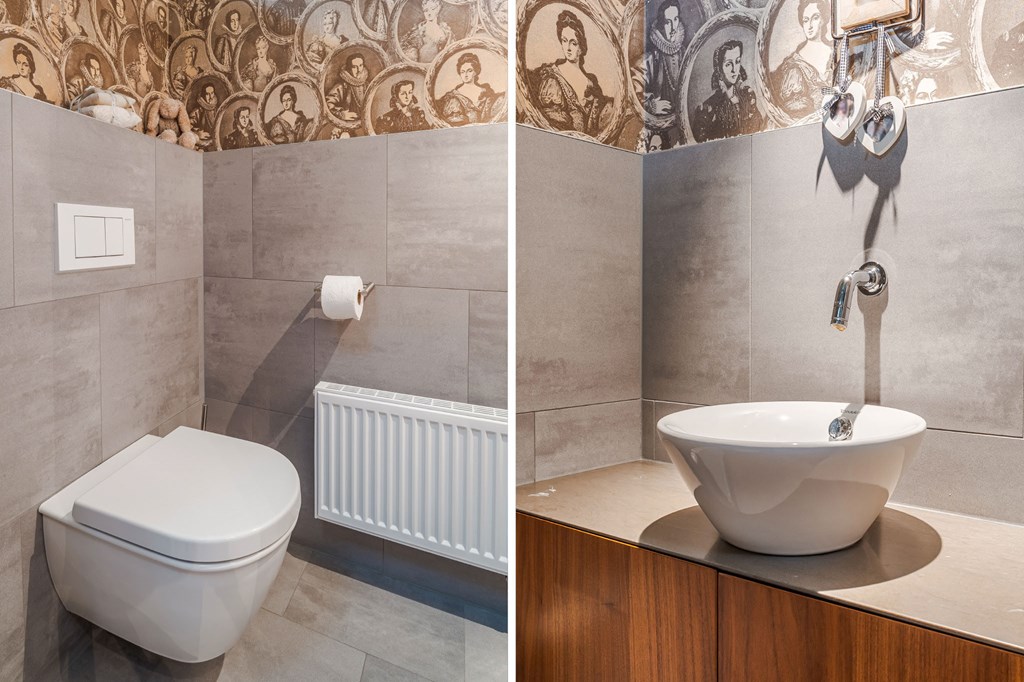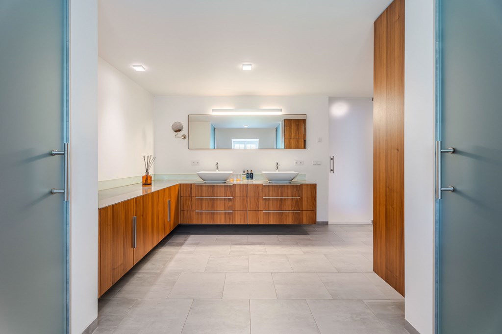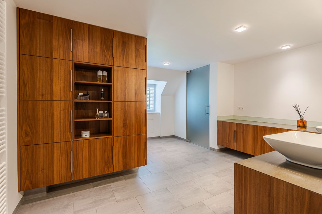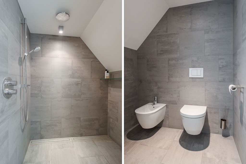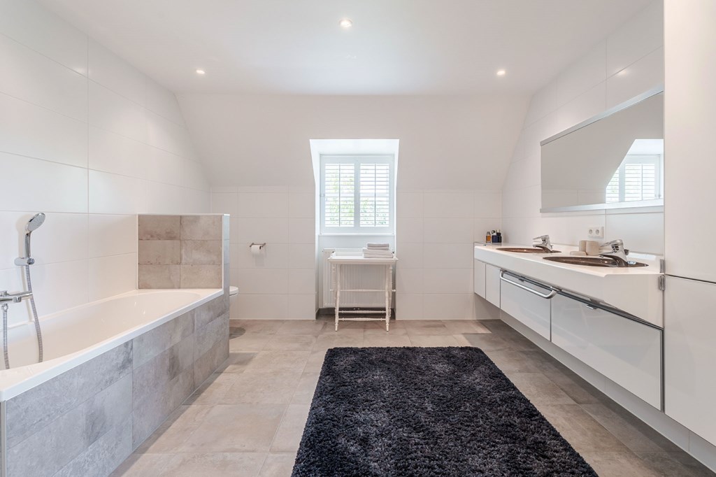 De en suite badkamer is ruim opgezet en er is wederom gebruik gemaakt van mooie materialen. De twee waskommen staan op een notenhouten meubel met natuursteen blad, uitgevoerd in een hoekopstelling. De badkamer is verder voorzien van vloerverwarming, verwarmde spiegel, afgesloten toiletruimte met wandcloset en bidet, en een afgesloten inloopdouche met regenkop.