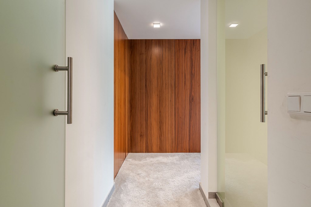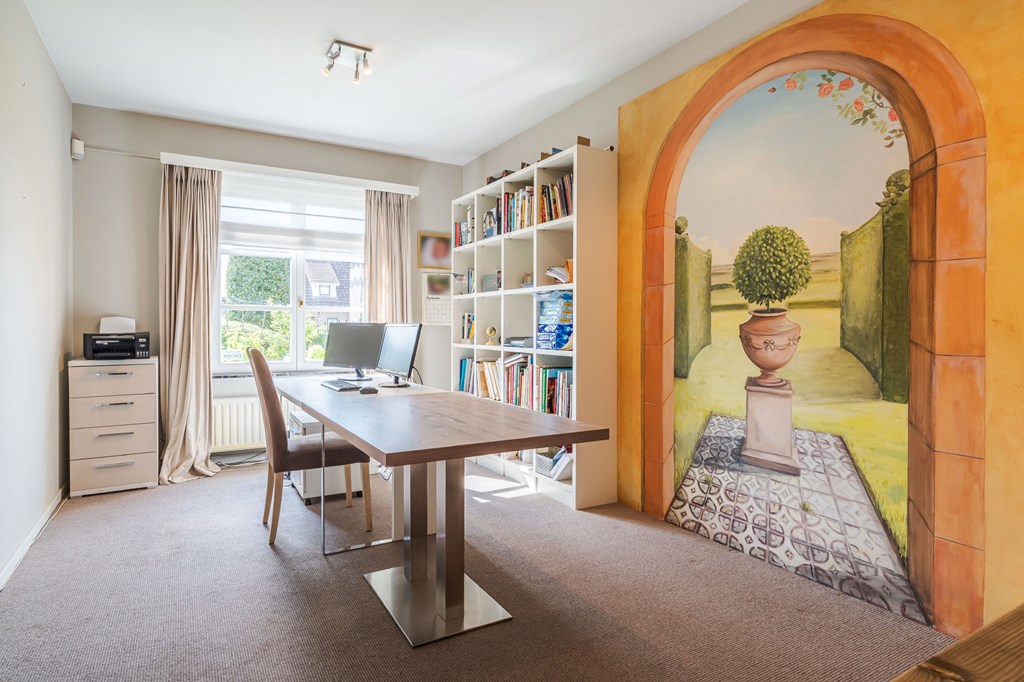 De werkkamer is gesitueerd aan de voorzijde van het huis en is de schakel tussen de hal en de leefkeuken.