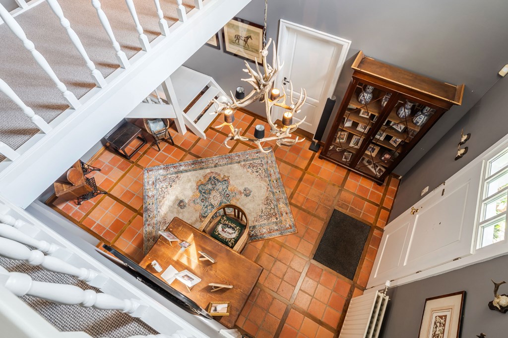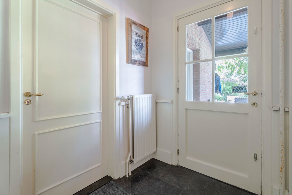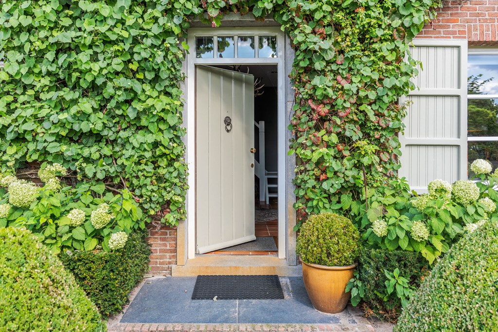Middels de keurig aangelegde voortuin met een ruime oprit en een elektrisch bedienbare toegangspoort bereikt u de entree van de woning. Bij binnenkomst is direct duidelijk dat de landelijke stijl binnen is doorgetrokken. Dit is een huis met karakter. De hal is voorzien van een toiletruimte, een meterkast, een vestiaire, een trapopgang voor toegang tot de verdieping en biedt toegang tot zowel de werkkamer als de woonkamer.