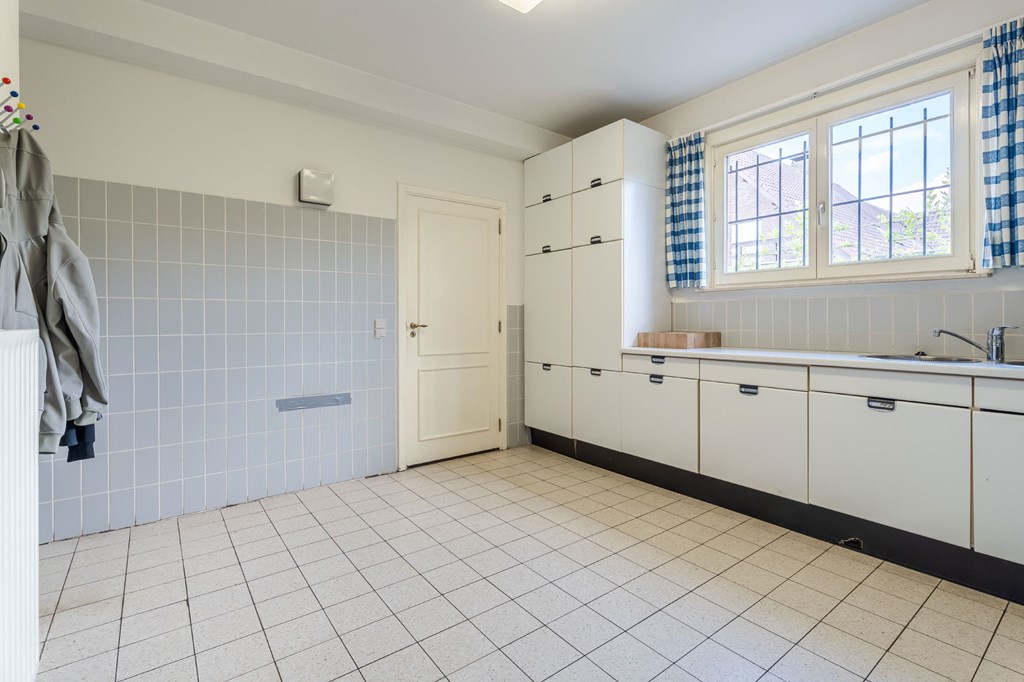 De ruime bijkeuken is voorzien van een extra werkblad met gootsteen, aansluitingen voor de wasmachine en droogkast, een douchcabine biedt direct toegang tot de garage.