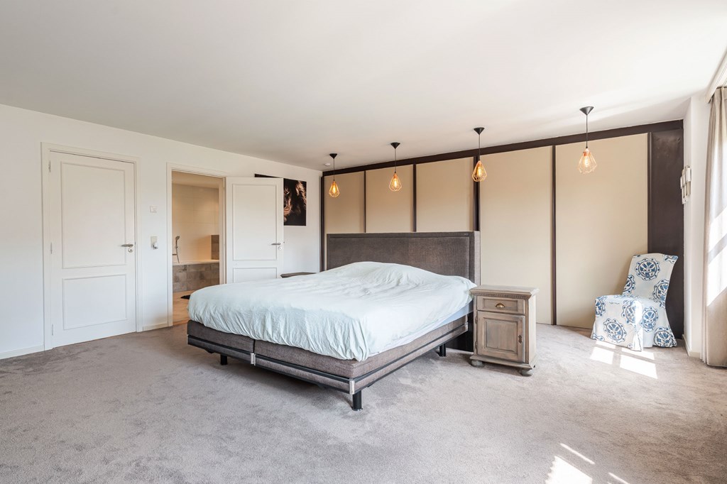 Slaapkamer 1 (master suite): Deze kamer heeft werkelijk alles wat u nodig heeft. De master suite is met een glazendeur af te sluiten van de overloop. Vanuit de slaapkamer heeft u een mooi uitzicht over de tuin. De kledingkamer is voorzien van handgemaakte notenhouten kasten met fijne verlichting.