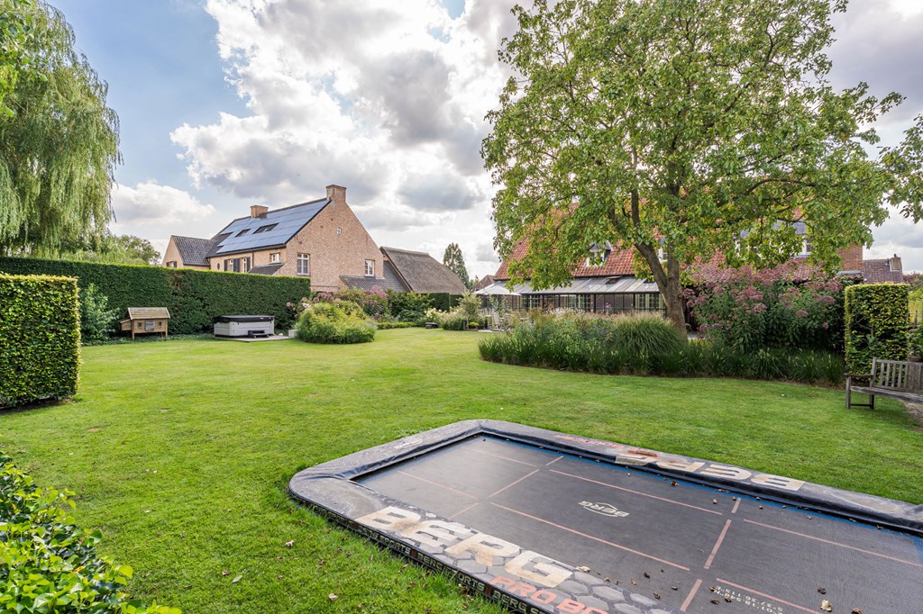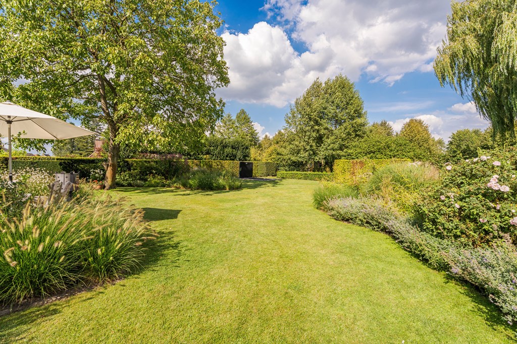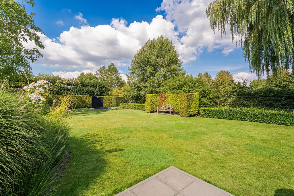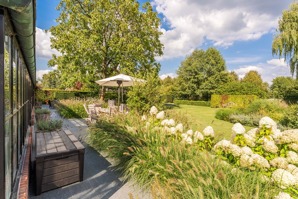 De onder architectuur aangelegde tuin heeft zich door de jaren heen ontwikkeld tot de tuin die het nu is. De tuin ligt rondom het huis en is een fijne plek voor mensen die van het buitenleven houden. De tuin is voorzien van een fijn terras bij de serre, verlichting, een ingebouwde trampoline, een beregeningsinstallatie, een groot gazon, groenborders met organische vormen en volwassen beplanting.