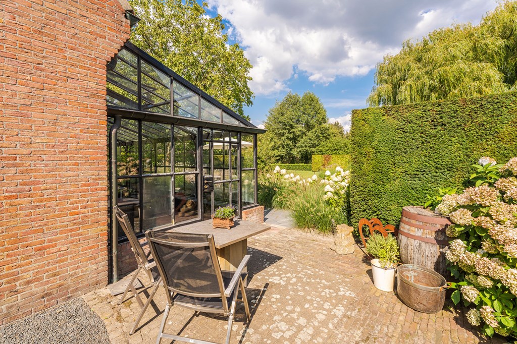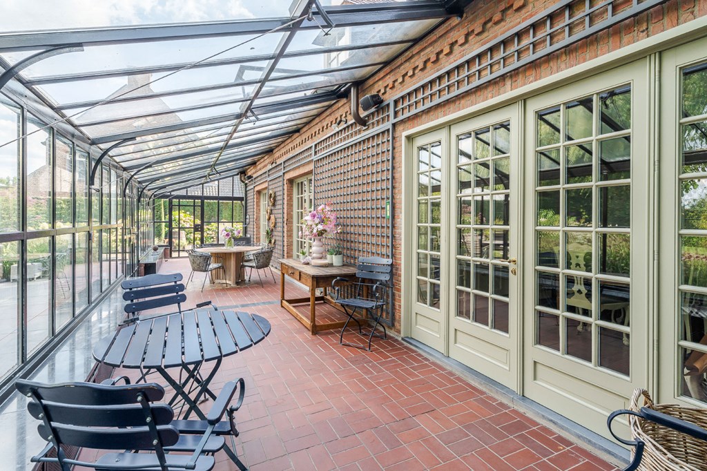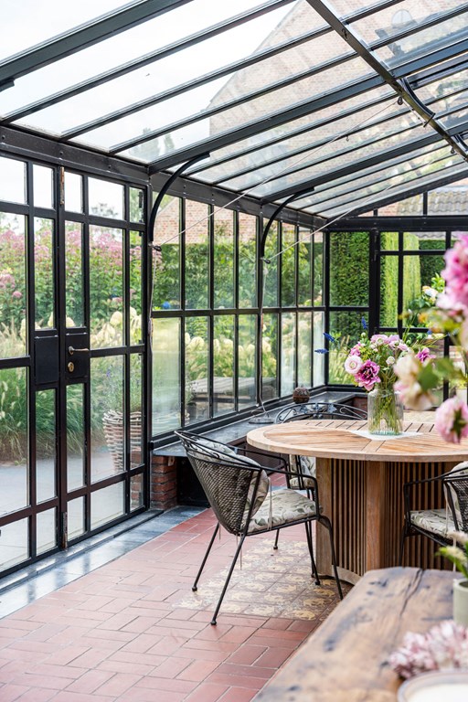 De door Luc D’Hulst gebouwde zwarte stalen serre is de natuurlijke schakel tussen het binnen-en buitenleven. De serre is voorzien van elektra en verwarming en daardoor het gehele jaar te gebruiken. Het is de ideale plek om de dag te beginnen met een kopje koffie en de krant, of om de dag te eindigen met een glas wijn en een goed boek.
