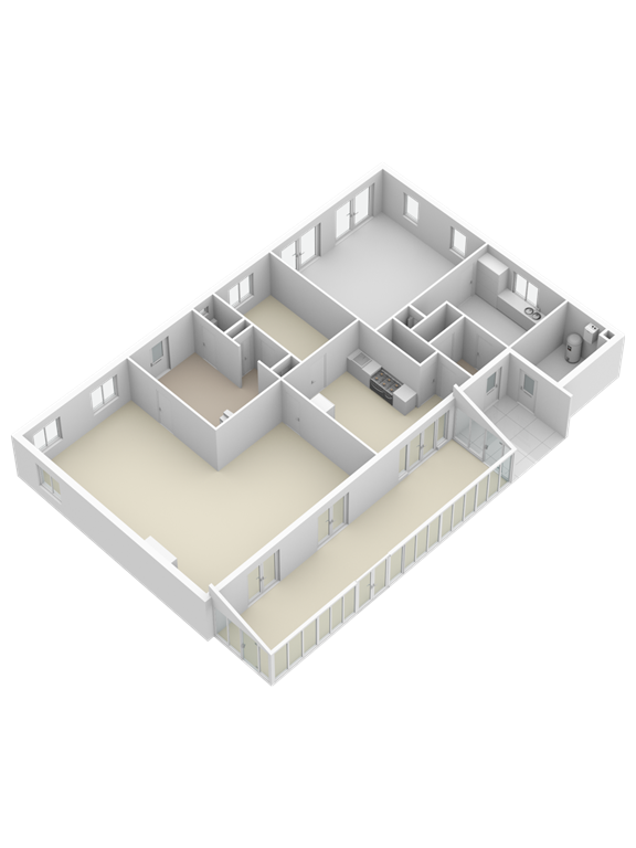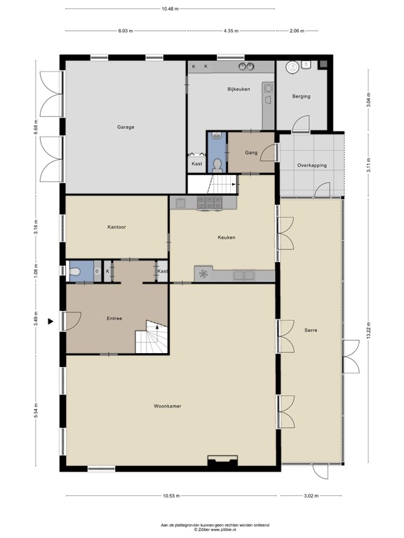 Vanuit de leefkeuken heeft u toegang tot de voorraadkelder, serre en werkkamer. Ook heeft u toegang tot een achterportaal met een toiletruimte, een grote bijkeuken en een dubbele inpandige garage.