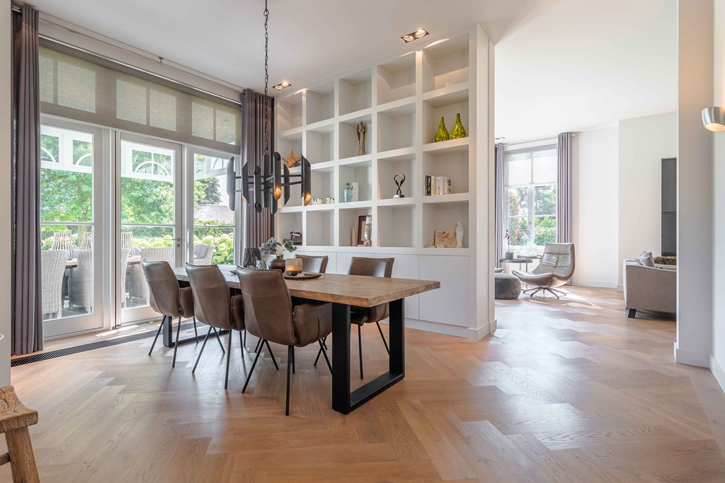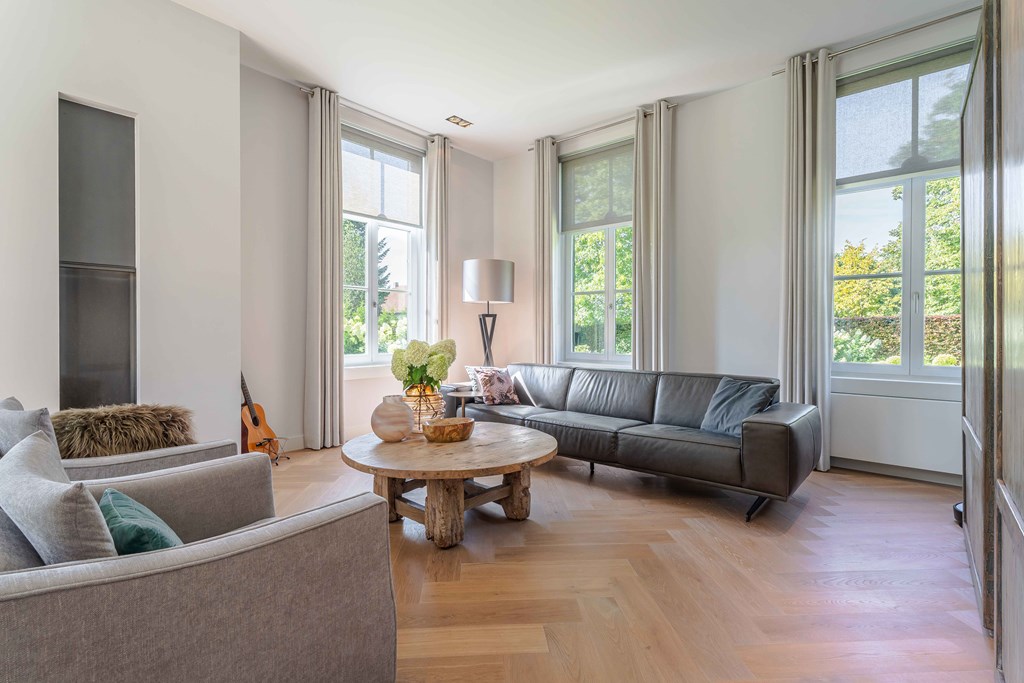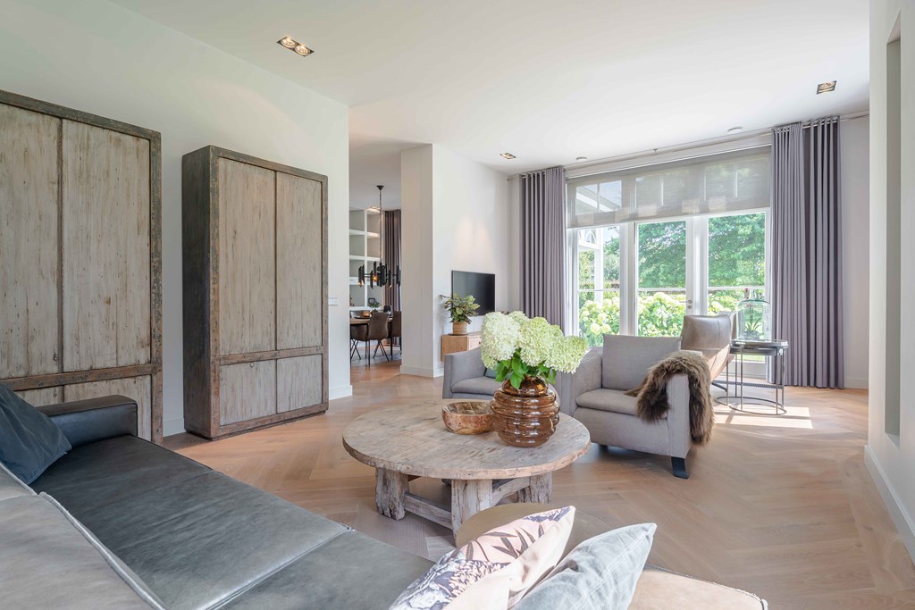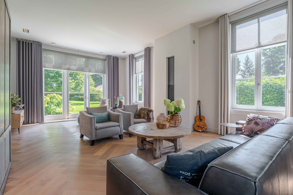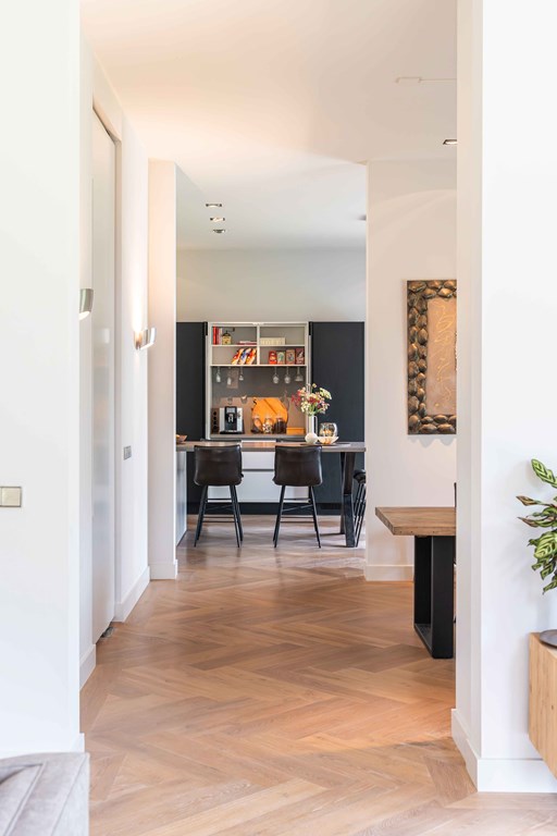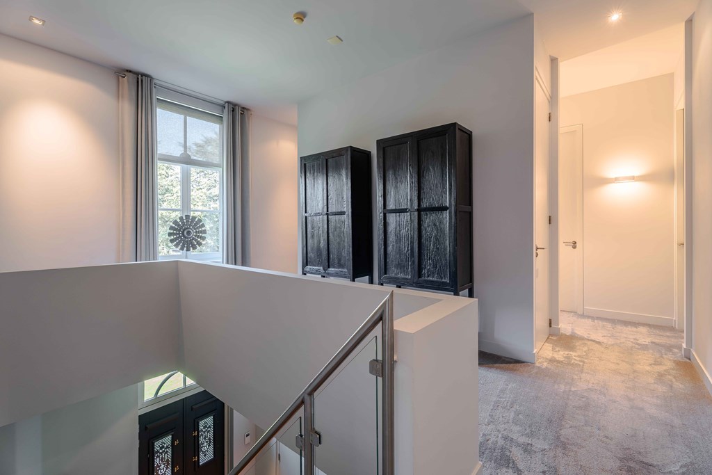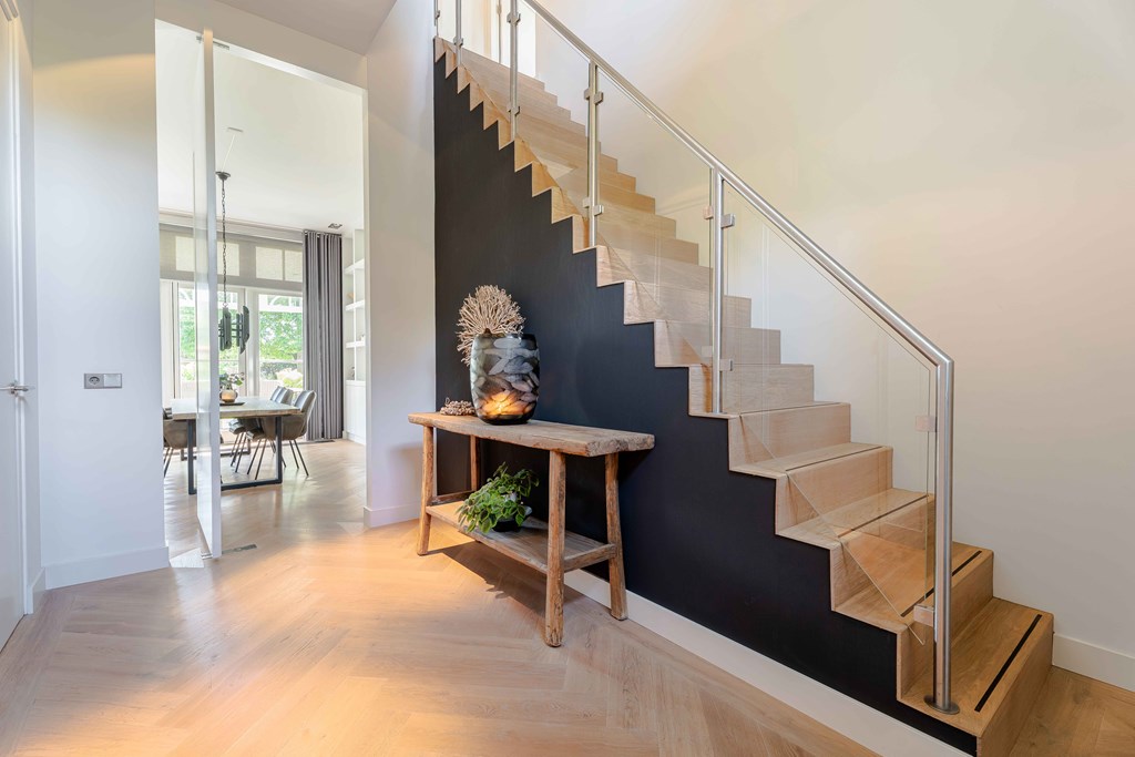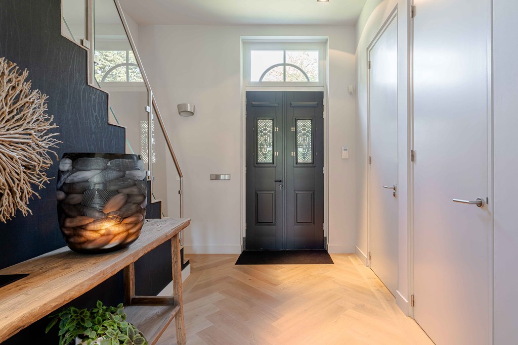 Through the neatly landscaped front garden, you reach the stately entrance of the home. Upon entering, it is immediately clear that careful thought has been given to the sightlines in and around the property. The hallway features a meter cupboard, a guest toilet, a cloakroom, a staircase to the upper floor, and provides access to the living areas.