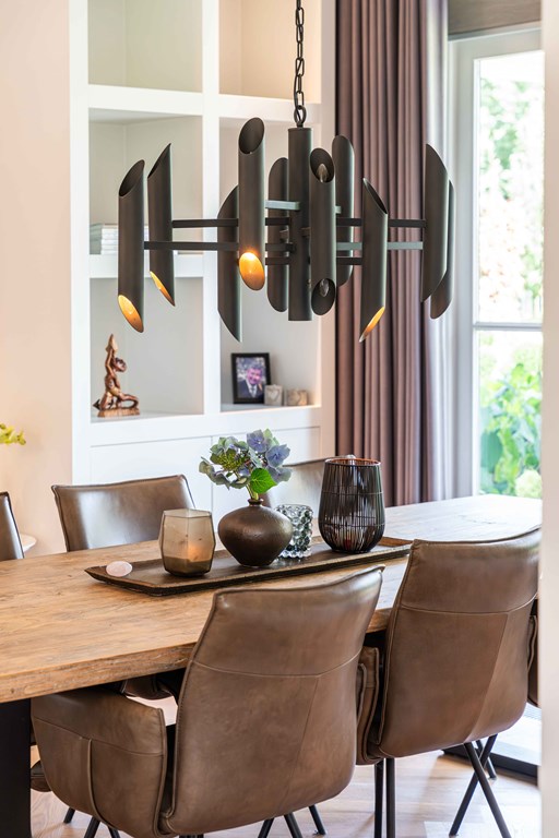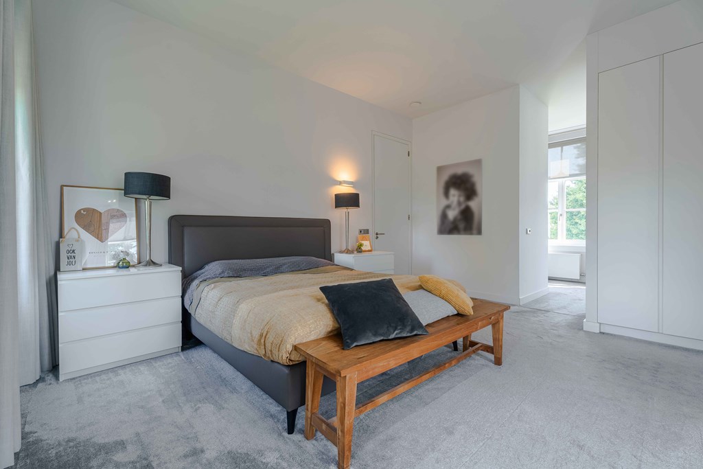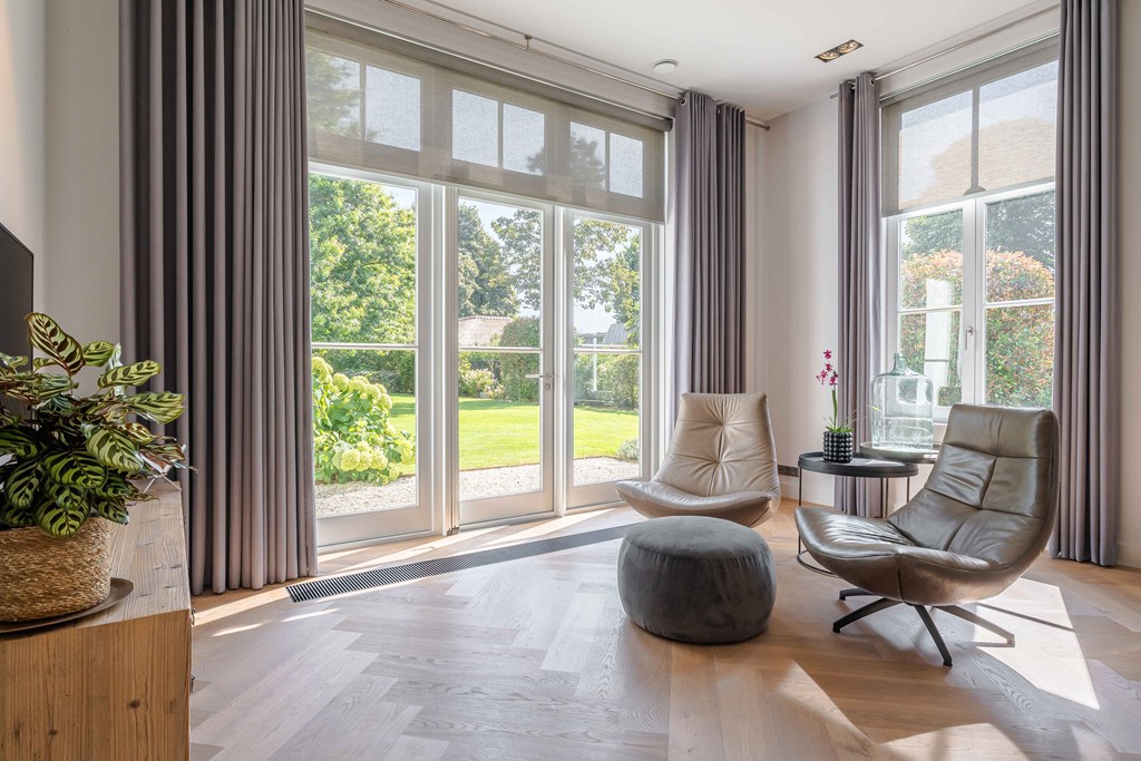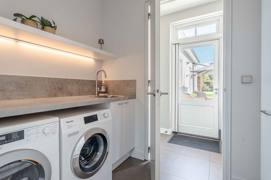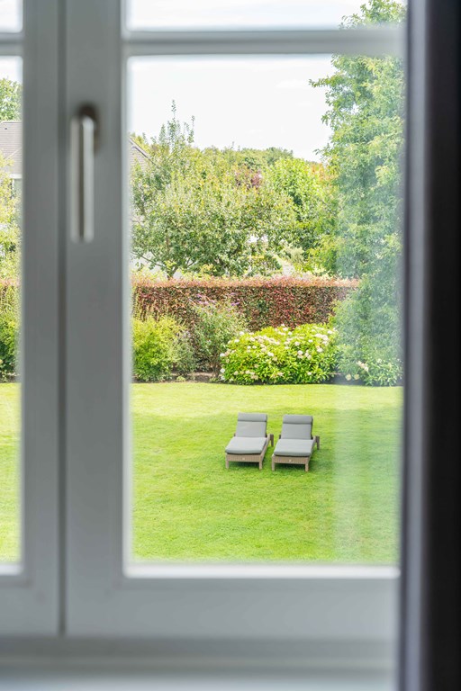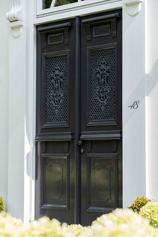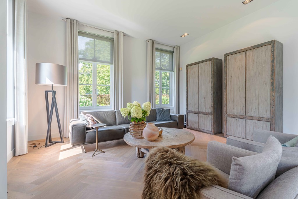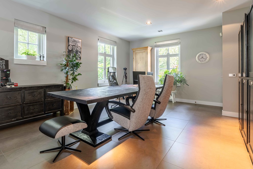 Through the neatly landscaped front garden, you reach the stately entrance of the home. Upon entering, it is immediately clear that careful thought has been given to the sightlines in and around the property. The hallway features a meter cupboard, a guest toilet, a cloakroom, a staircase to the upper floor, and provides access to the living areas.