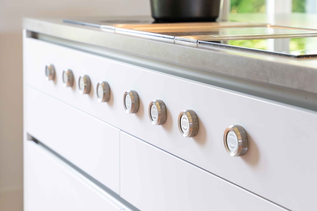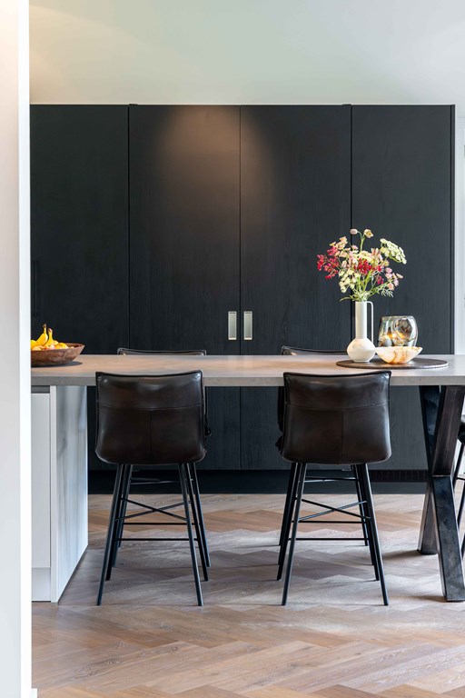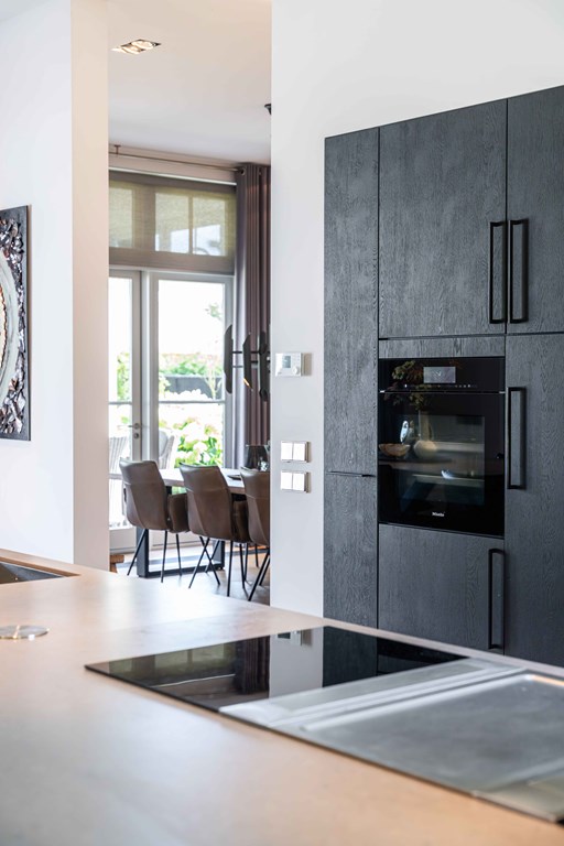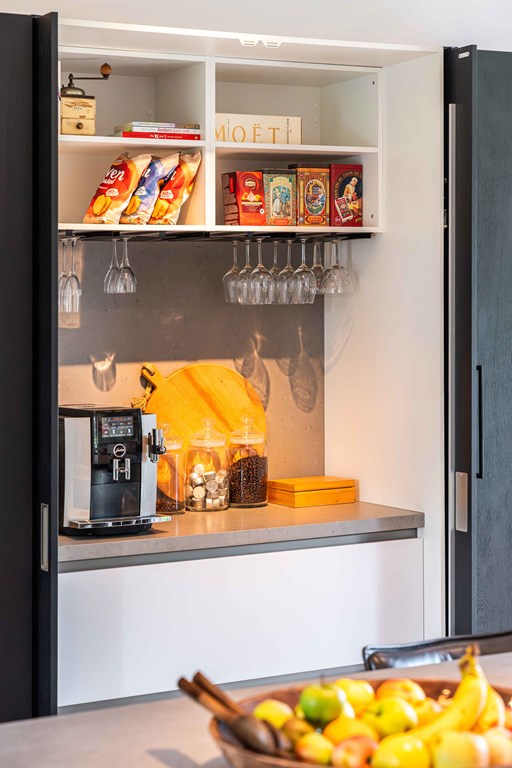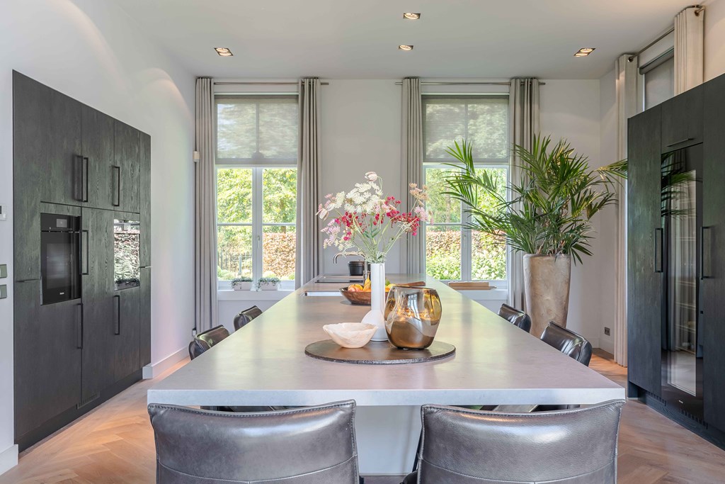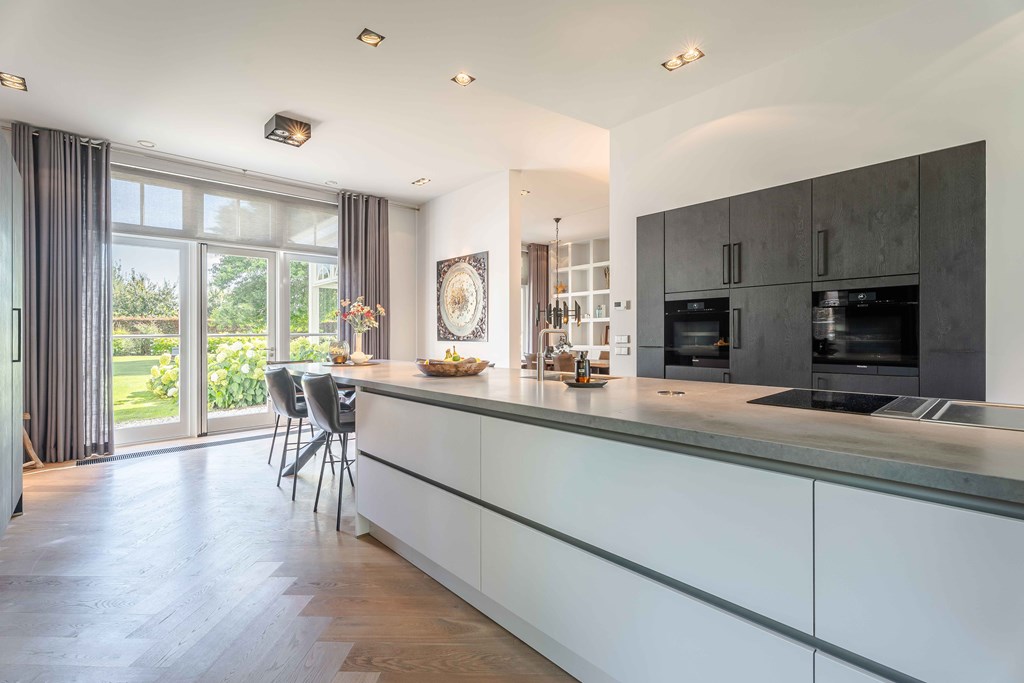 The kitchen is equipped with a modular BORA system with 2 induction hobs, 2 built-in extractors, a teppanyaki plate, a Quooker tap, 2 refrigerators, a freezer, a steam oven, a conventional oven, a dishwasher, and a wine climate cabinet.