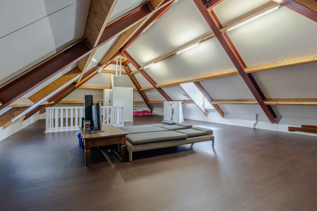 Currently, the attic is set up as one large multifunctional space. It includes connections for a washing machine and houses the central heating system. It is possible to create additional bedrooms here, potentially with a small bathroom.
