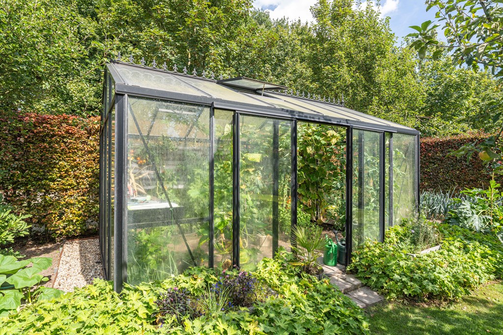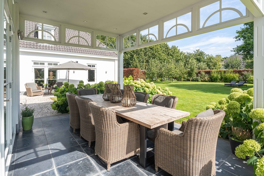 The beautifully landscaped garden surrounds the house and is perfect for those who love outdoor living. It features a spacious lawn, borders with mature planting, fruit trees, lighting, a terrace with veranda, an irrigation system, and various cozy seating areas. There is also space to install a greenhouse. Additionally, the property includes a driveway with ample parking, preparations for a charging station, and a garage with double doors.