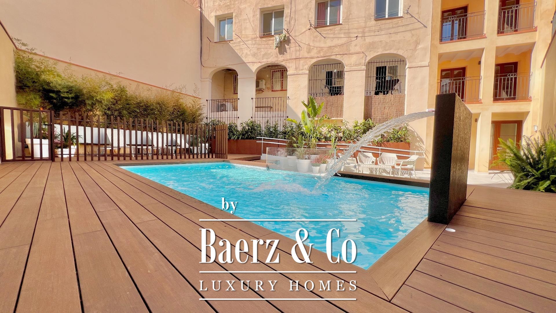The interior experience is subtly enhanced by features such as a terrace for quiet moments above the street, central heating and air-conditioning, and the convenience of an elevator and laundry facilities. Balconies and communal spaces, including a swimming pool, invite moments of retreat within the vibrancy of central Barcelona.
