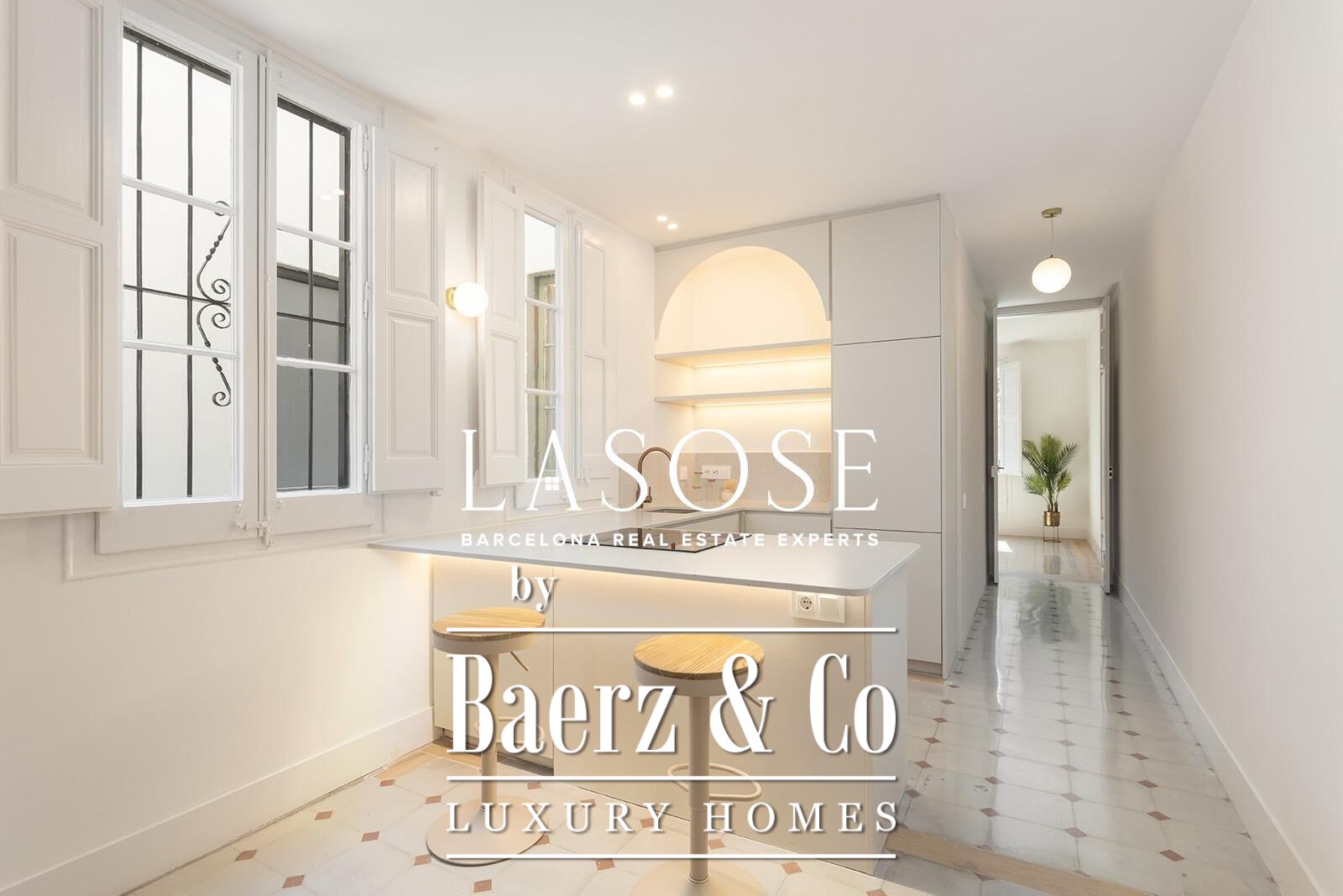 Apartment Barcelona is a residence where heritage architecture is balanced with contemporary renovation, set on the top floor in Eixample. The 115 m² apartment, fully renewed in 2025, invites abundant natural light through its southeast facing balcony, filling the living space with warmth and offering open views from the lounge. Original hydraulic tiles and a carefully restored Catalan ceiling stand as signatures of period craftsmanship, while modern lighting, sleek bathrooms, and brand new appliances seamlessly blend into the refined fabric of the home.