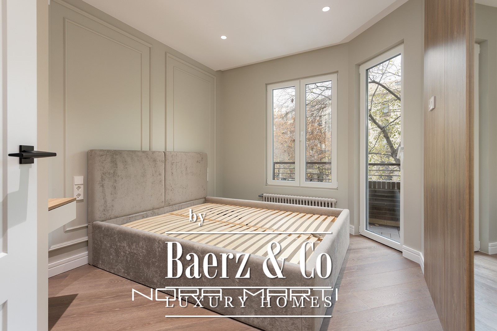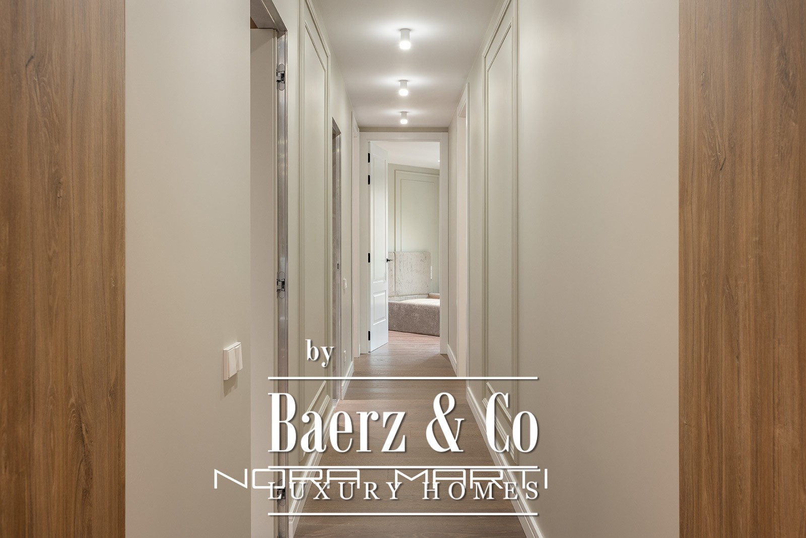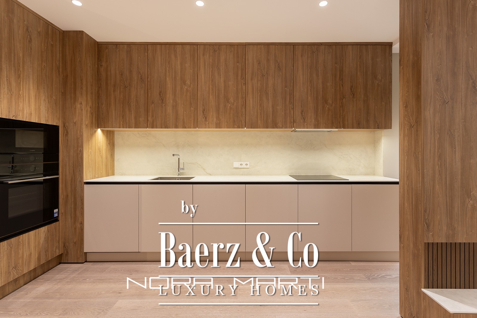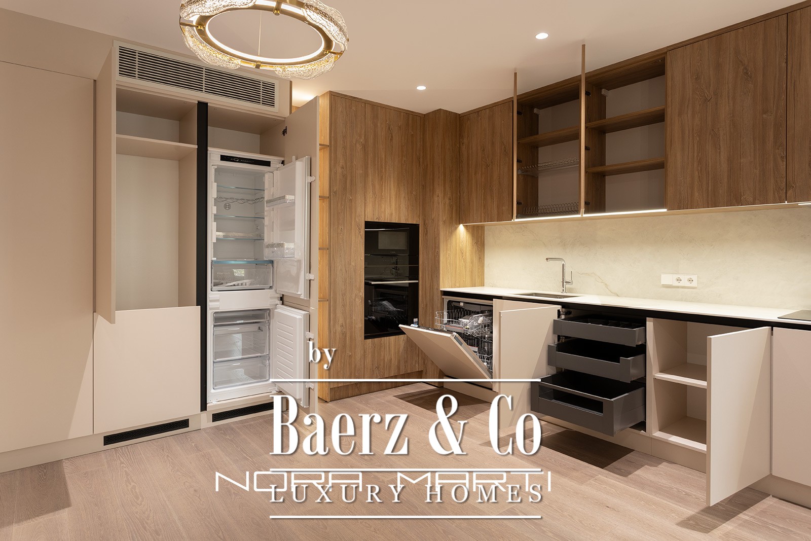 A generous open-plan living, dining, and kitchen area of approximately 51 m² anchors the home, seamlessly connected to one of two terraces totaling about 12 m². The kitchen is both functional and elegant, integrating Bosch appliances with custom cabinetry and storage. Three double bedrooms provide calm, private retreats, including a master suite with dressing area, private bathroom, and direct terrace access. Two additional double bedrooms share a full bathroom, complemented by a discreet guest toilet.