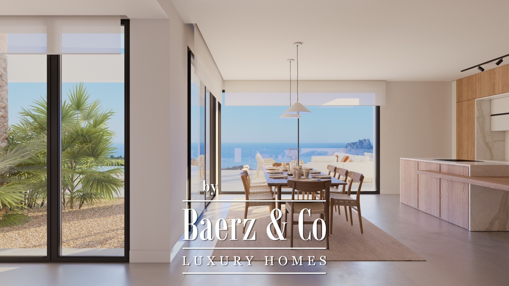 Villa Georgia is built in one of the most exclusive areas of the Benissa coast, in the prestigious Racó de Galeno. This modern villa is harmoniously integrated into a natural setting, a privileged viewpoint over the sea. You enter the property, situated at the top of the plot, through an elegant pedestrian entrance next to a garage for two cars. Here, you can access all floors of the property via an outdoor staircase and an elevator. Villa Georgia makes an immediate impression with its sleek lines, large white volumes, and big windows, allowing indoor and outdoor spaces to blend seamlessly. The front opens onto a large terrace with an infinity pool, creating a continuous area with a lounge, dining area, and panoramic views of the Mediterranean Sea. The interior is designed with noble materials, soft colors, and well-considered natural lighting.