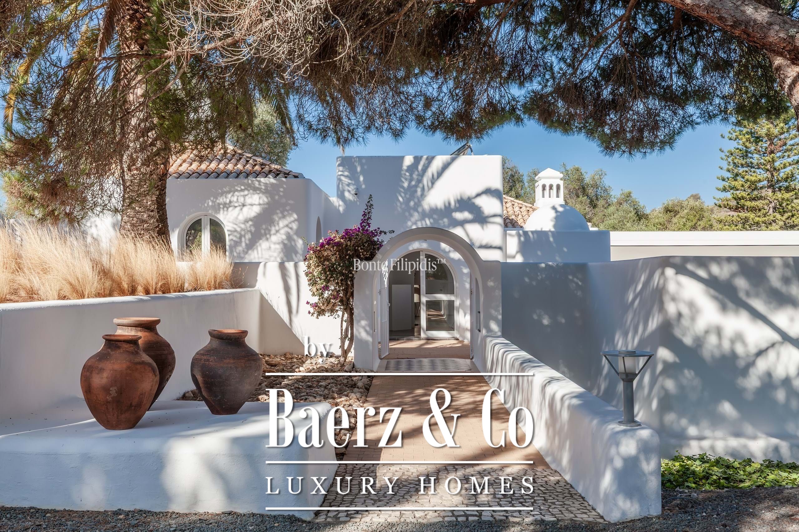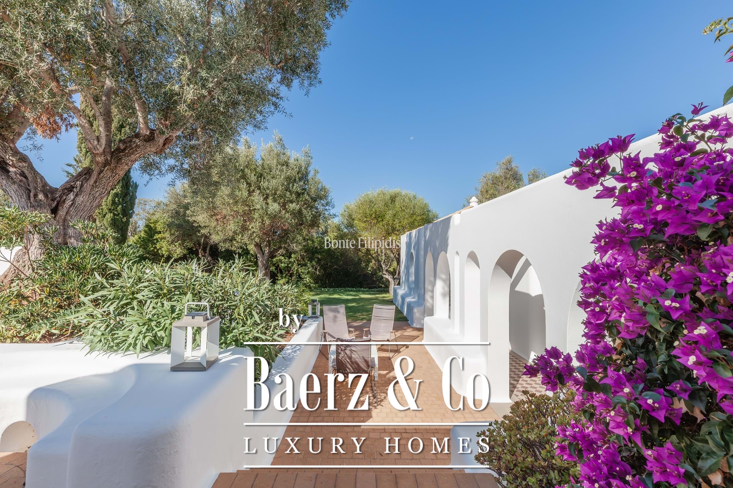 Spanning 359 sqm on a vast 21,280 sqm plot, the property includes six spacious bedroom suites and guest apartments arranged around open-air corridors and tranquil courtyards. The generous living room with a closed fireplace opens onto a sun-drenched terrace shaded by a bioclimatic pergola, creating an ideal setting for entertaining or moments of quiet retreat. The professionally designed kitchen is equipped for gourmet cooking and large gatherings, while the 10x6m pool area, complete with a second pergola, offers a perfect backdrop for alfresco dining and long summer afternoons.