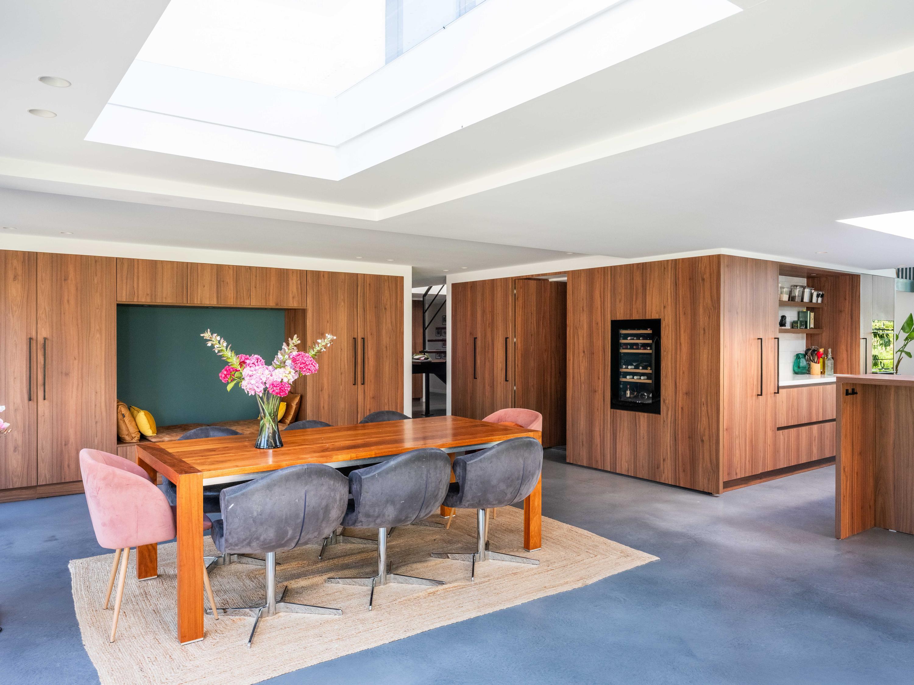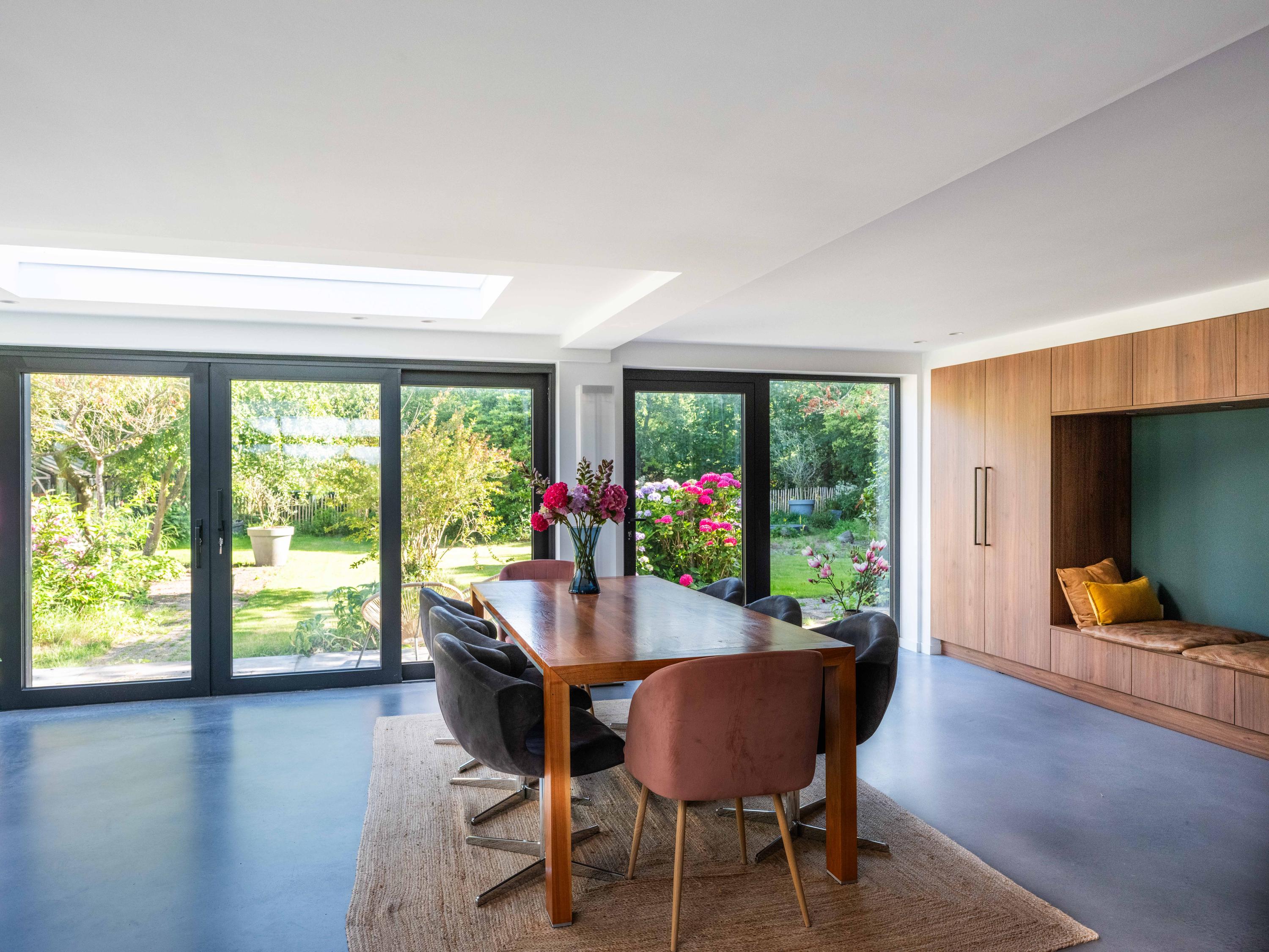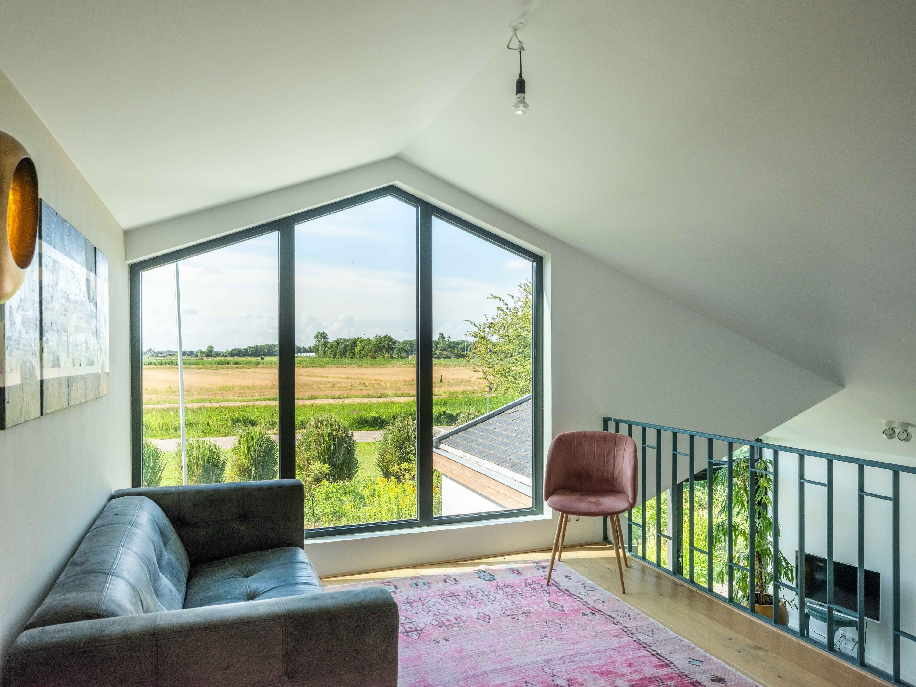 The custom-made kitchen in rich walnut is a dream for any cooking enthusiast. Fully equipped with high-end appliances, including a luxury wine climate cabinet, it also features an architectural highlight: a walnut wall with a hidden door, revealing a spacious utility room behind it. The front-facing living room offers a cozy reading or play corner with panoramic views of the polder, while the rear-facing dining area is bright and airy with large skylights, custom cabinets, and French doors opening onto the garden.
