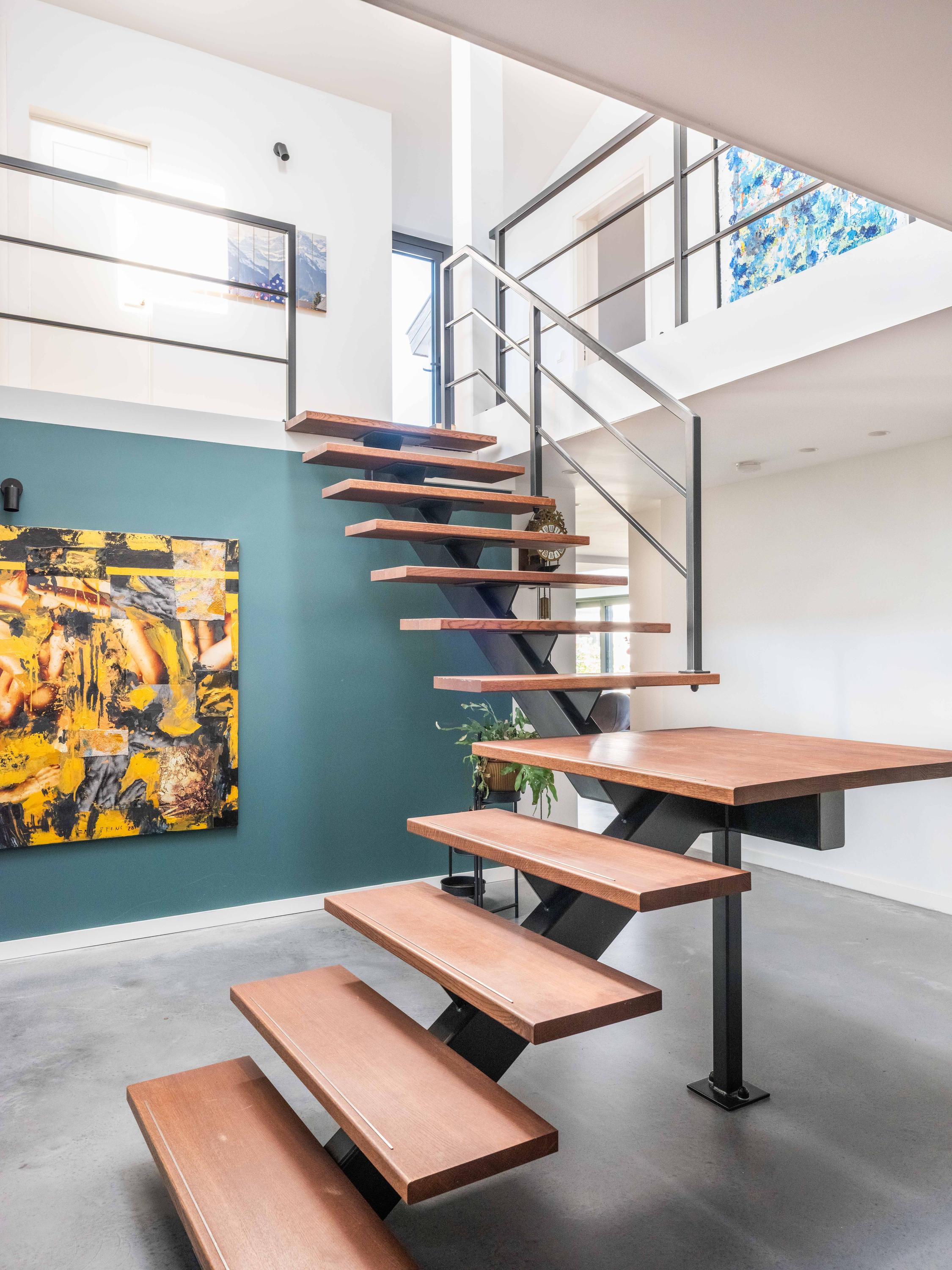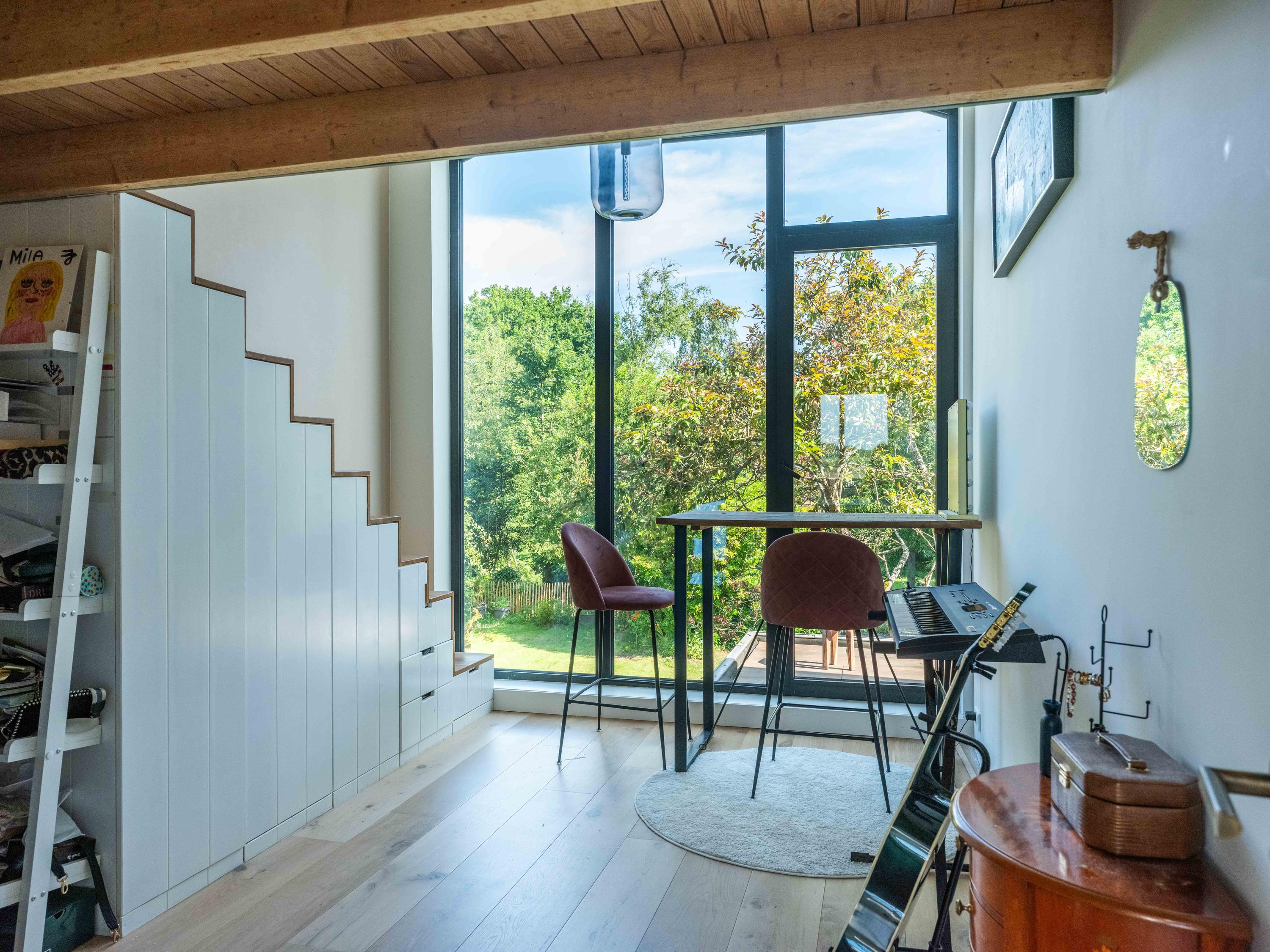 The upper floor is designed for children and hobbies. In addition to three comfortable bedrooms, a second bathroom with a large walk-in shower, separate toilet, and laundry room, there are delightful extras: an inspiring office with expansive views, a serene yoga room, and a playful mezzanine for retreating with a good book.