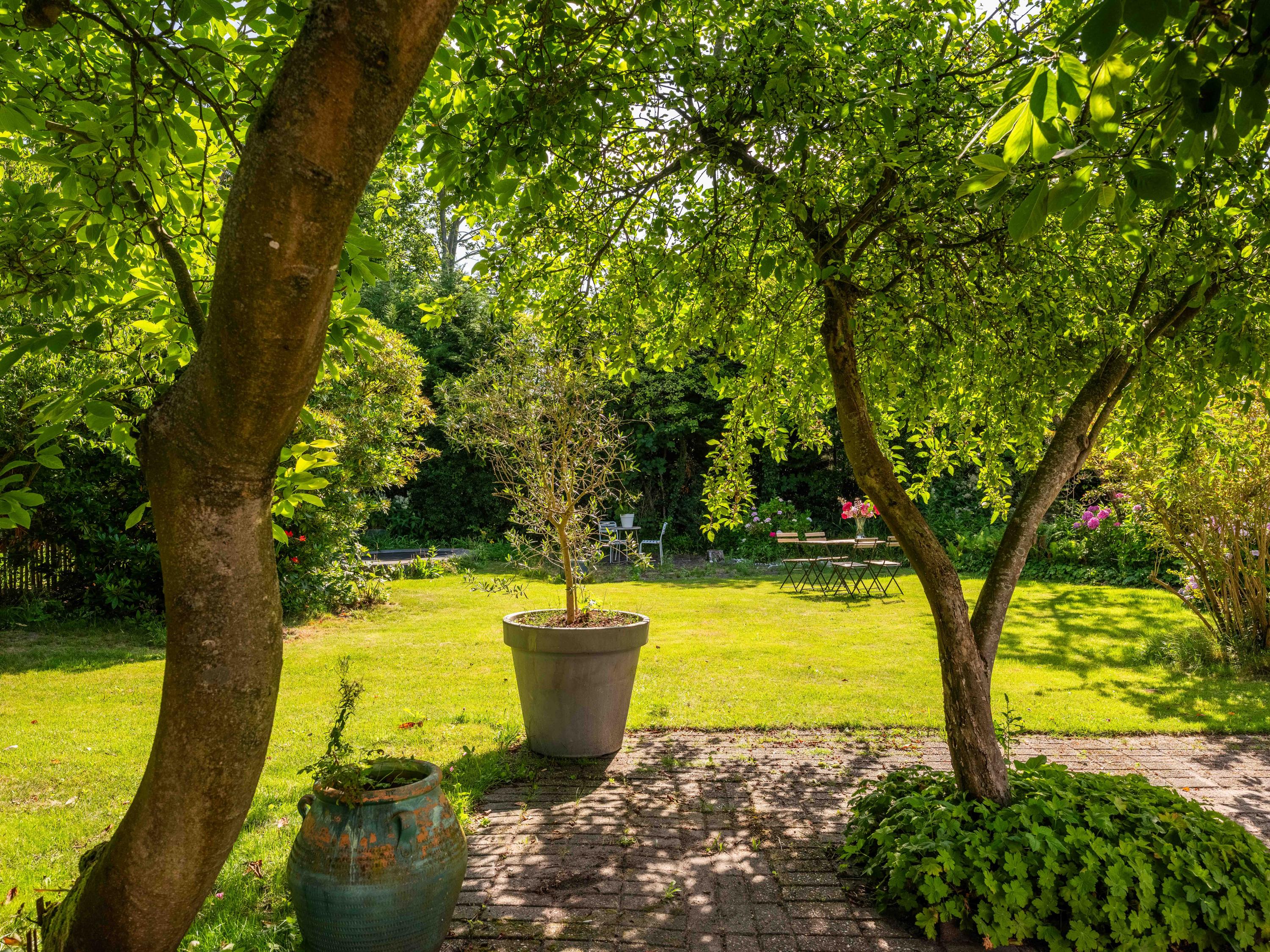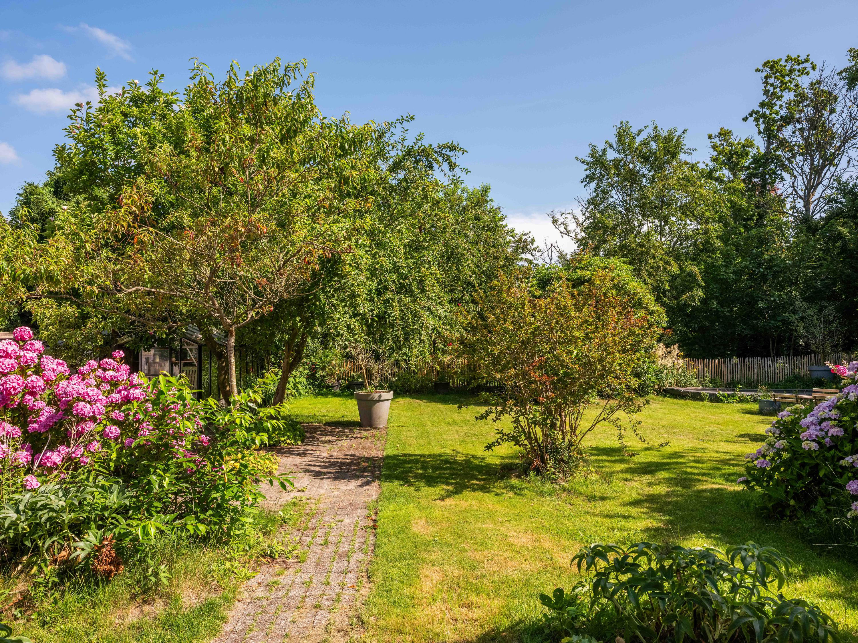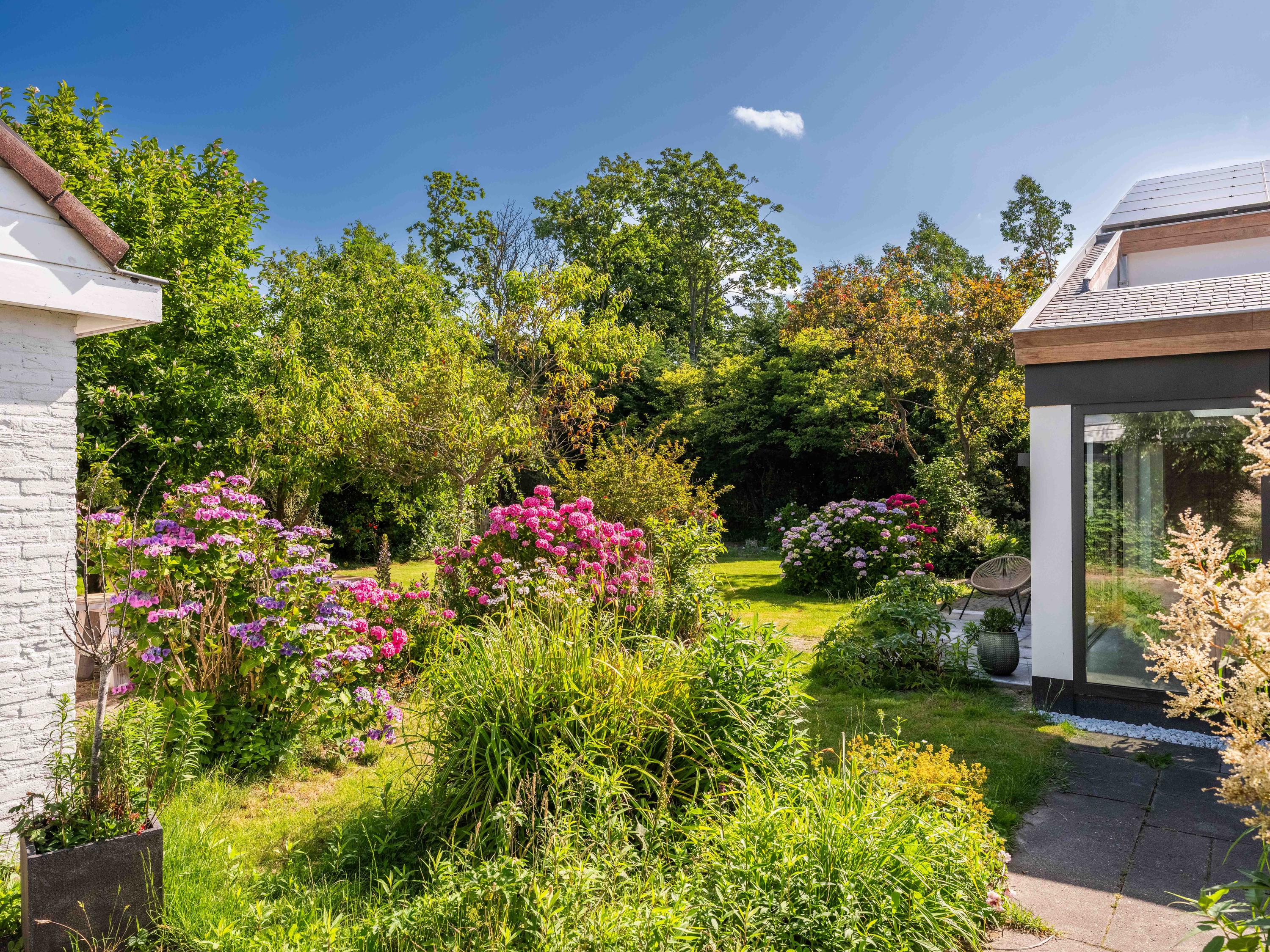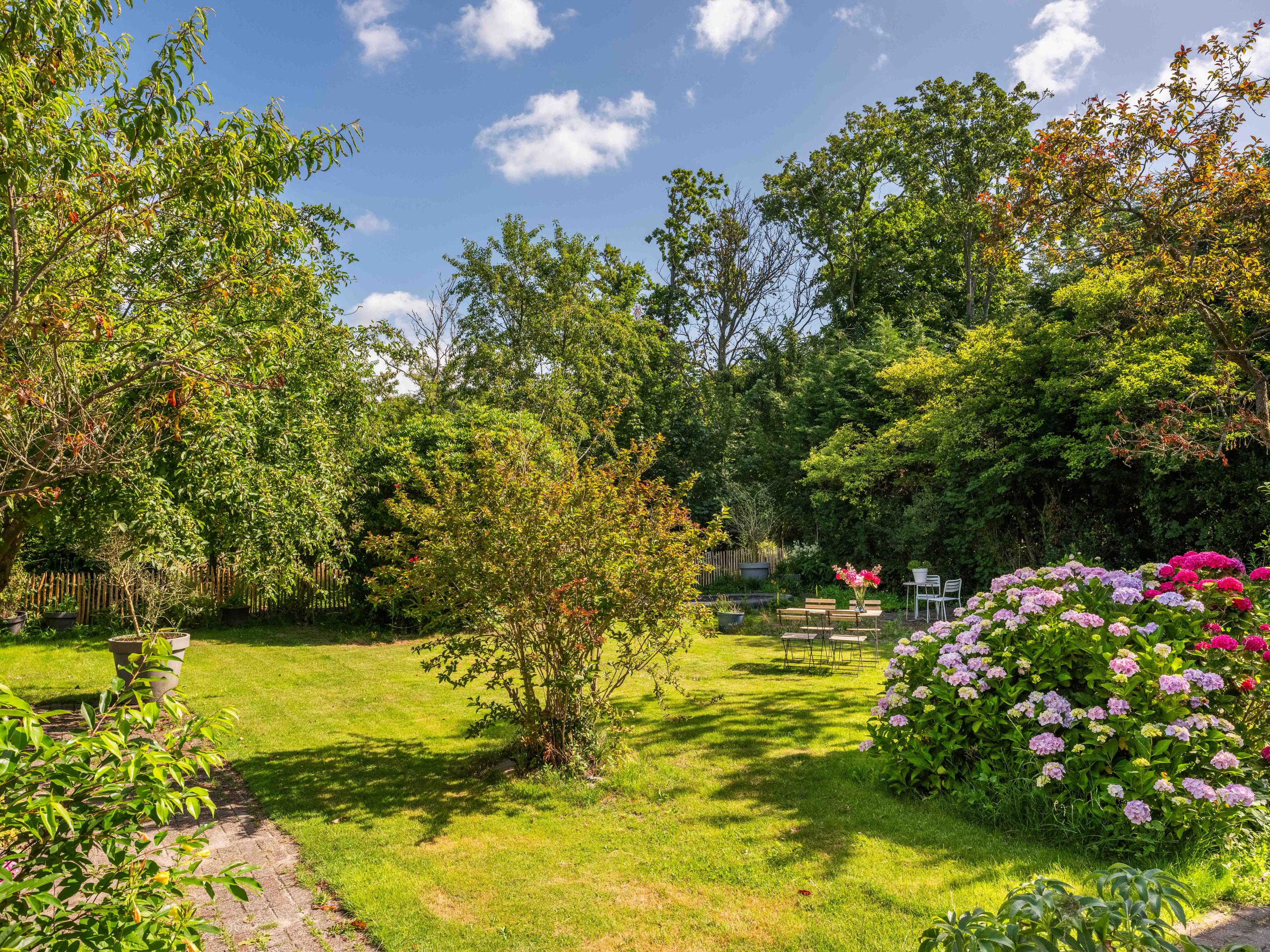 The surrounding garden offers complete privacy, with both sun and shade. A greenhouse, currently used as a cozy lounge with an outdoor fireplace, is perfect for long summer evenings with friends and family. There is also a large detached stone garage (approx. 50 m²) with storage loft, suitable for two cars.