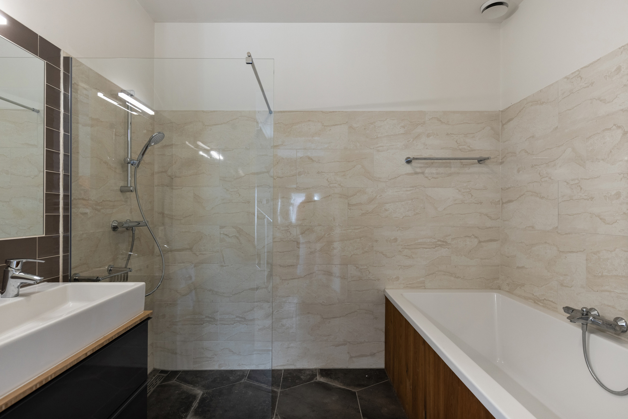 The modern bathroom is equipped with a walk-in shower, washbasin with vanity unit, and bathtub.